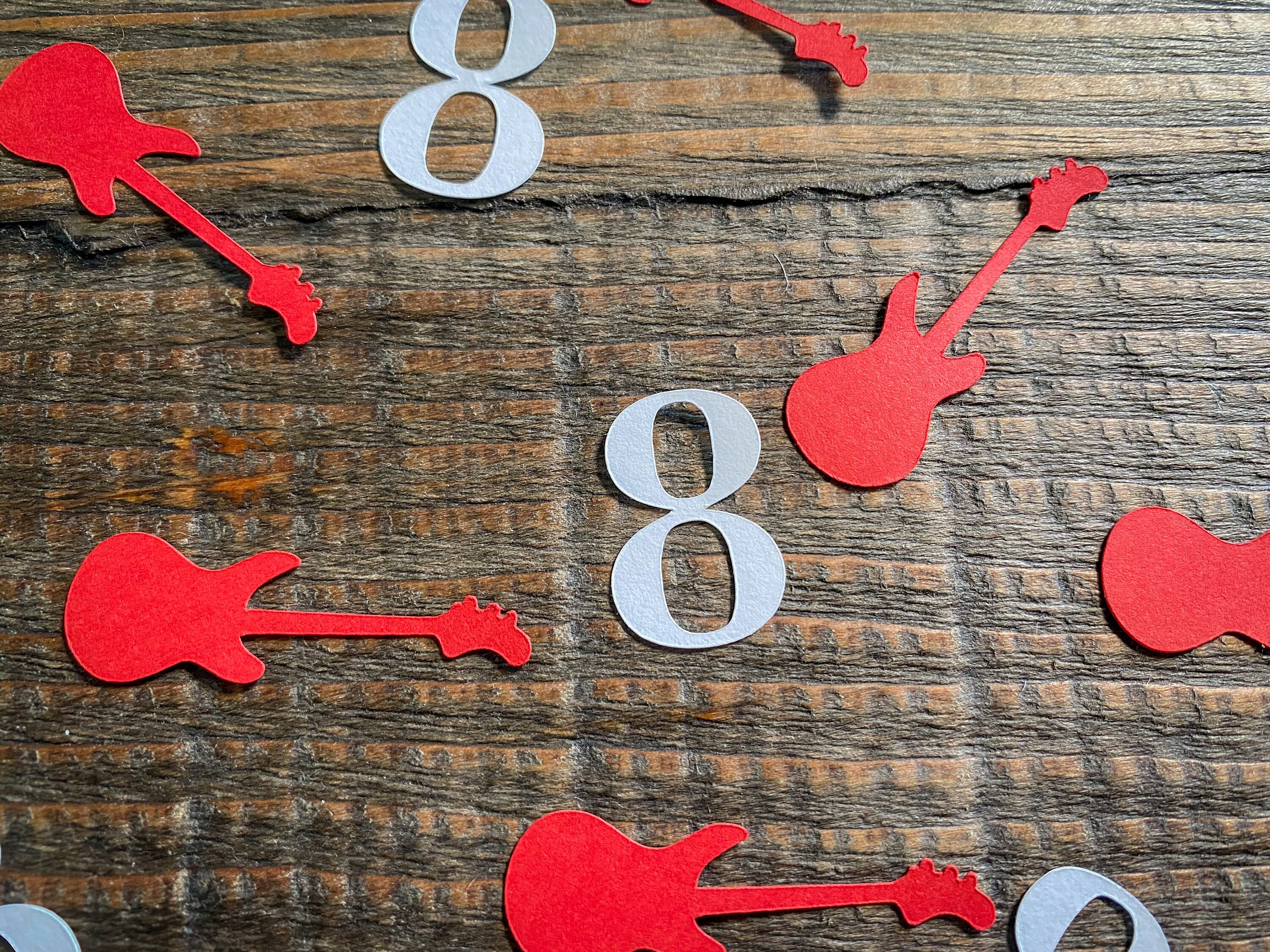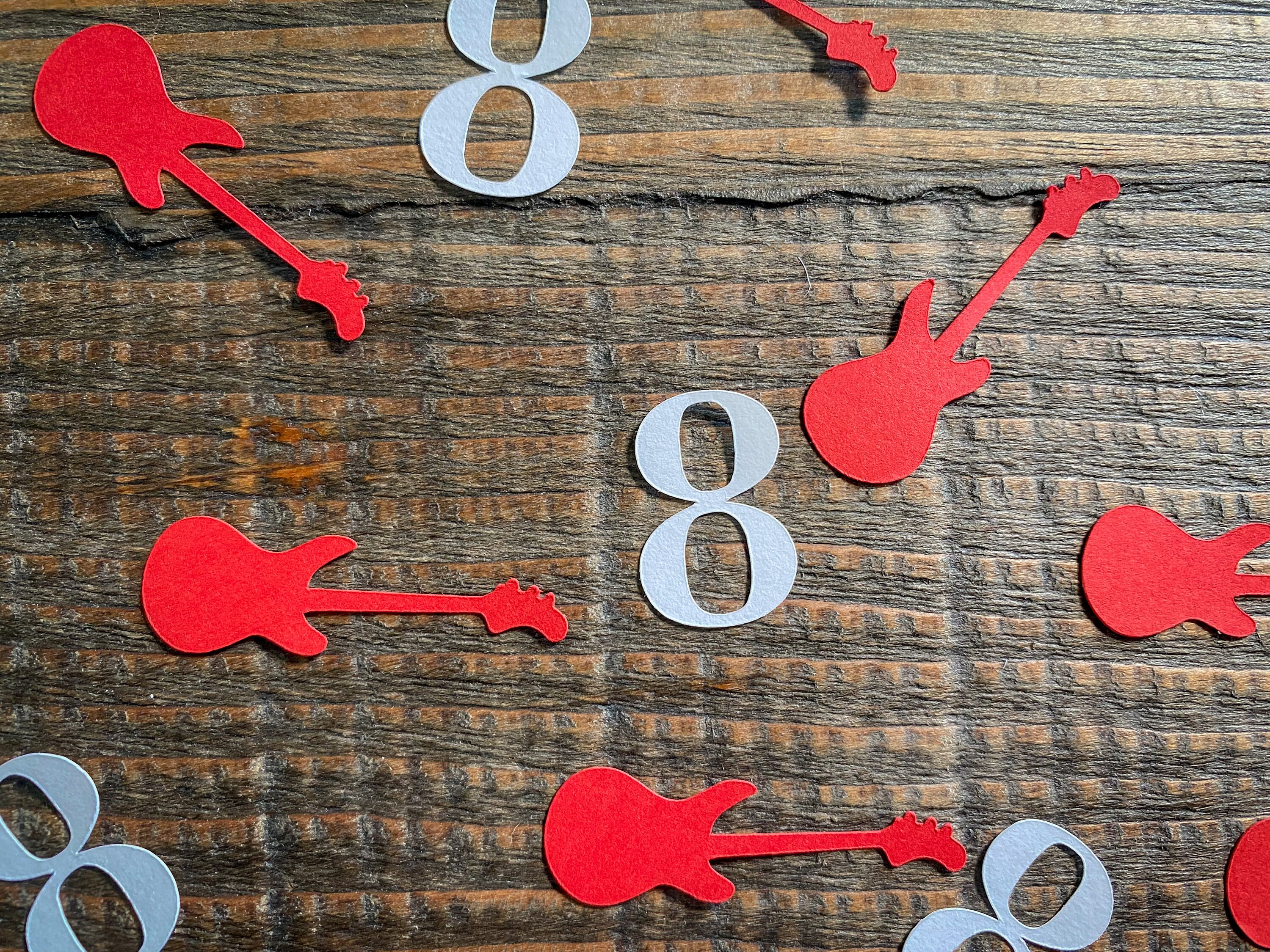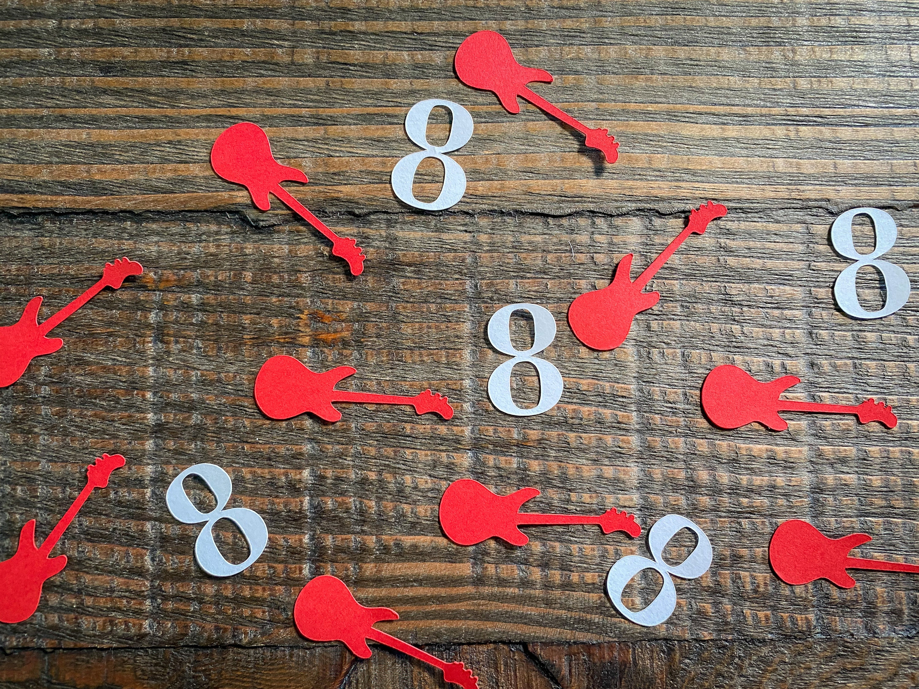 This listing is for 100 pieces of confetti! It includes 25 number pieces in white cardstock and 75 red cardstock guitars. The guitar pieces measure approximately 1.75 inches in length and .5 inches in width. The name pieces are 1 inch in height and the length changes based on the number.