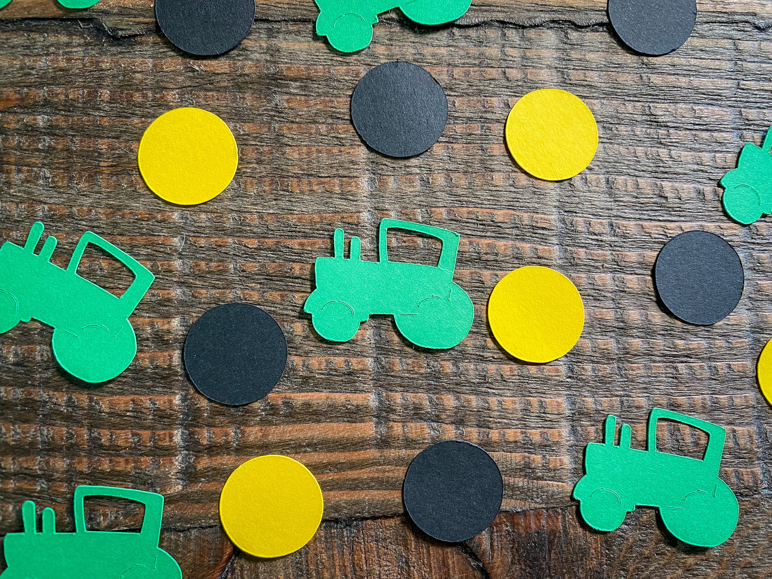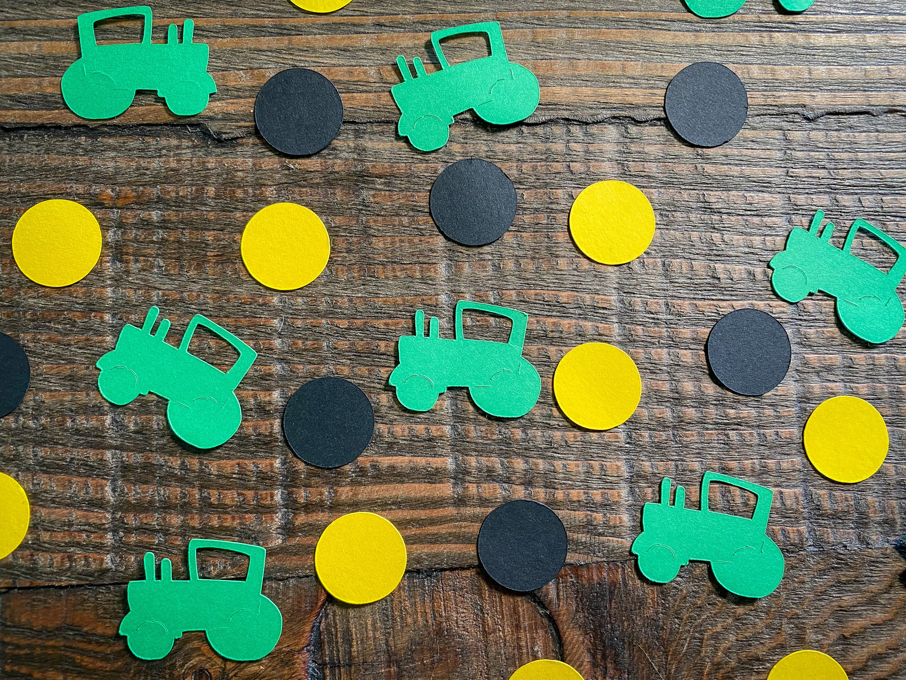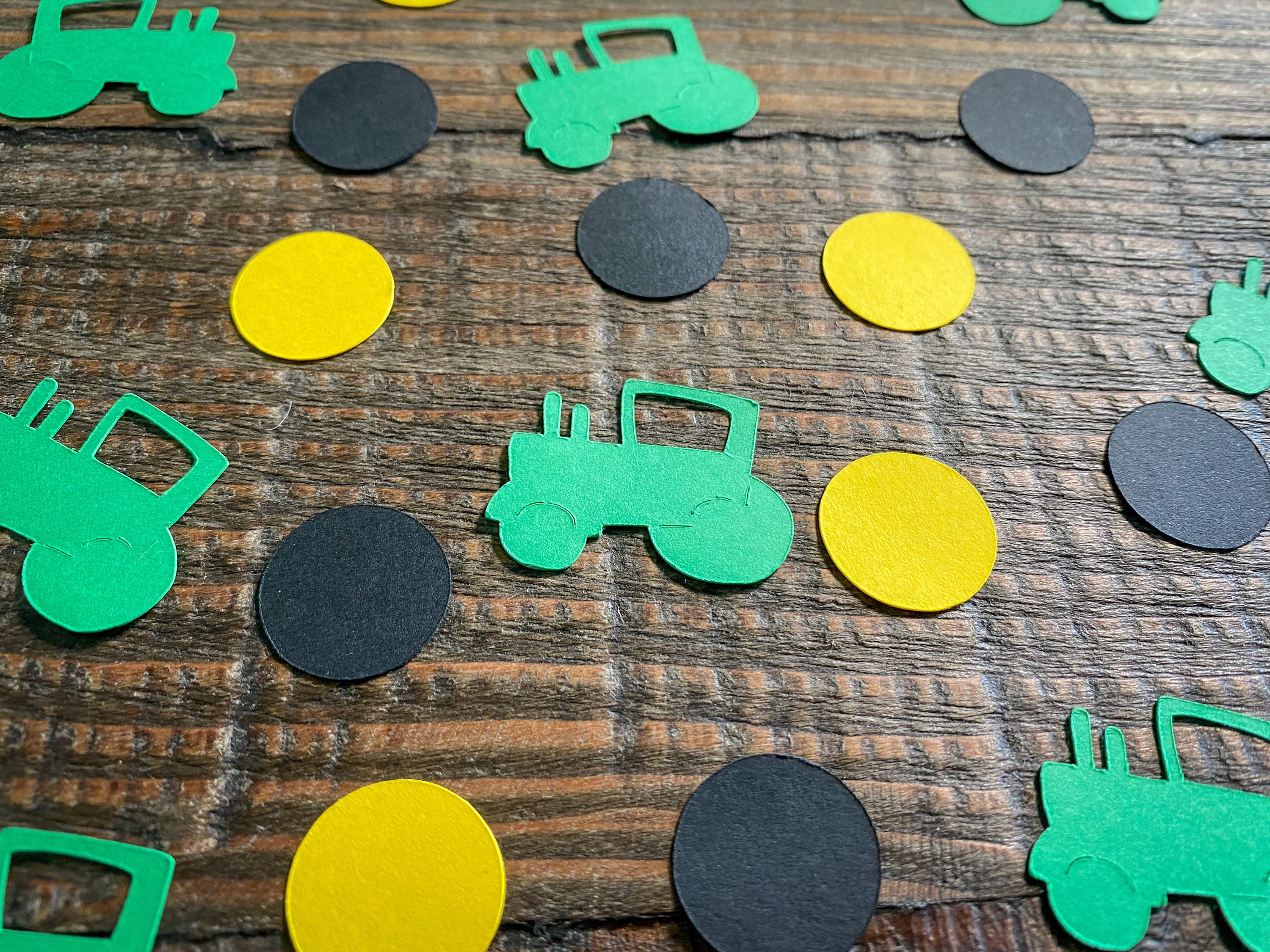 This listing is for 100 pieces of confetti! It includes 30 pieces of green tractor confetti, 35 pieces of black circles, and 35 pieces of yellow circles. The circles measure approximately .75 inches in diameter. The tractors measure approximately 1.25 in width by 1 inch in height.