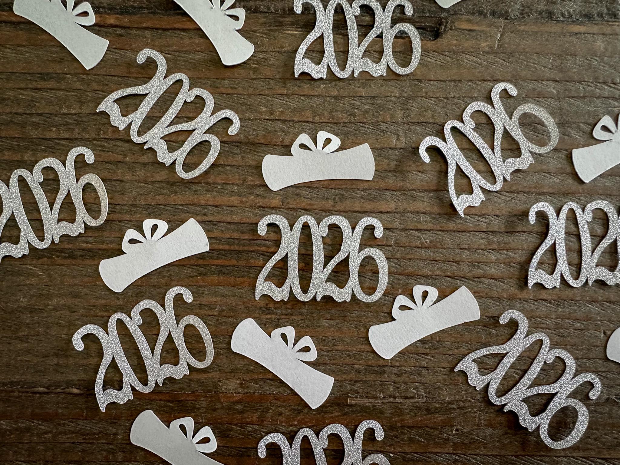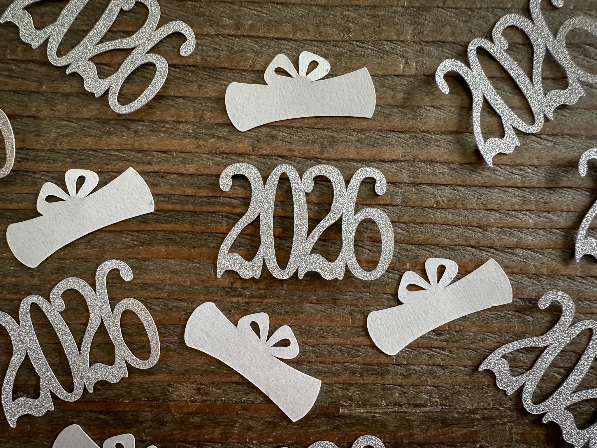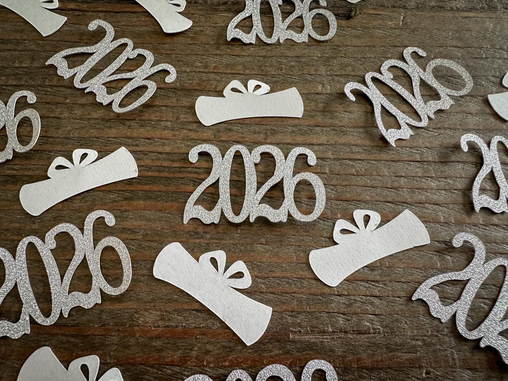 This listing is for 100 pieces of confetti! It includes 30 pieces of glitter silver 2026 confetti and 70 pieces of white diploma confetti. The 2026 confetti is made of elegant gold glitter cardstock that is white on the reverse side and measures approximately 1.25 inches in width. The diploma confetti is made from premium card stock and measures approximately 1.25 inches in width.