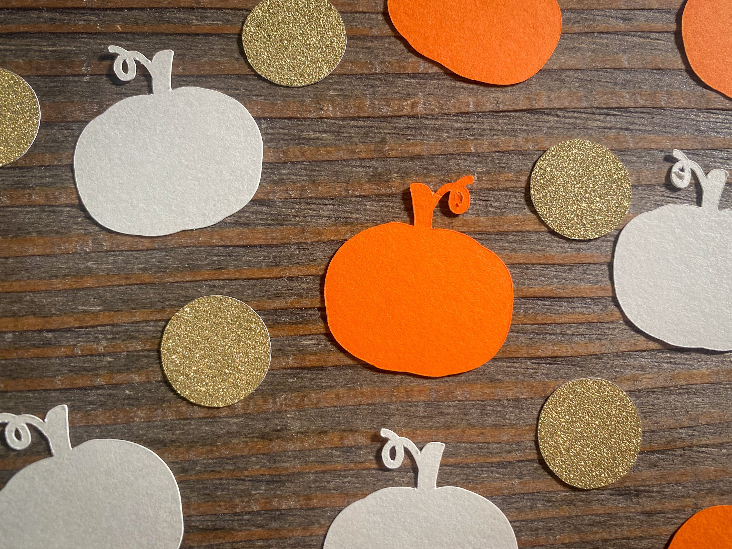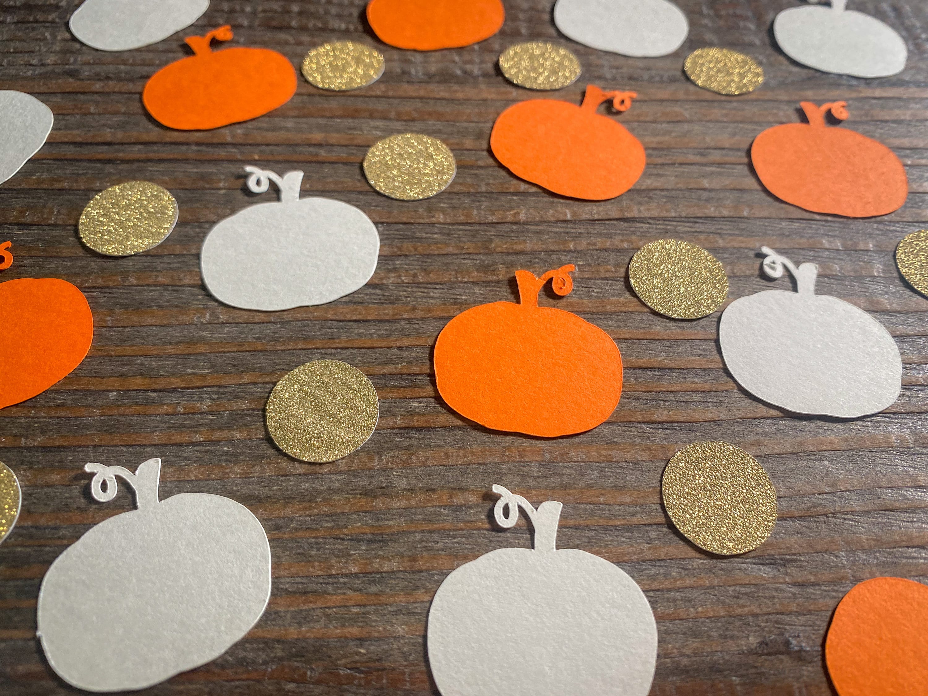 This listing is for 100 pieces of confetti. It includes 25 pieces of cream colored pumpkins, 25 pieces of orange pumpkins, and 50 gold glitter circles. The confetti is made from premium cardstock. The pumpkins measure approximately 1.25 inches wide. The gold glitter circles are white on the reverse side and measure approximately 3/4 inch in diameter.