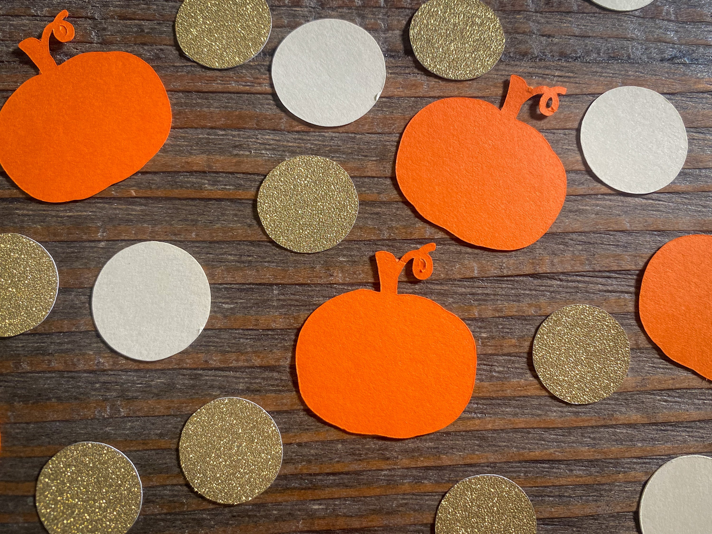 This listing is for 100 pieces of confetti. It includes 30 pieces of orange pumpkins, 35 pieces of cream circles, and 35 pieces of gold circles. The confetti is made from premium cardstock. The pumpkins measure approximately 1.25 inches wide. The circles measure approximately