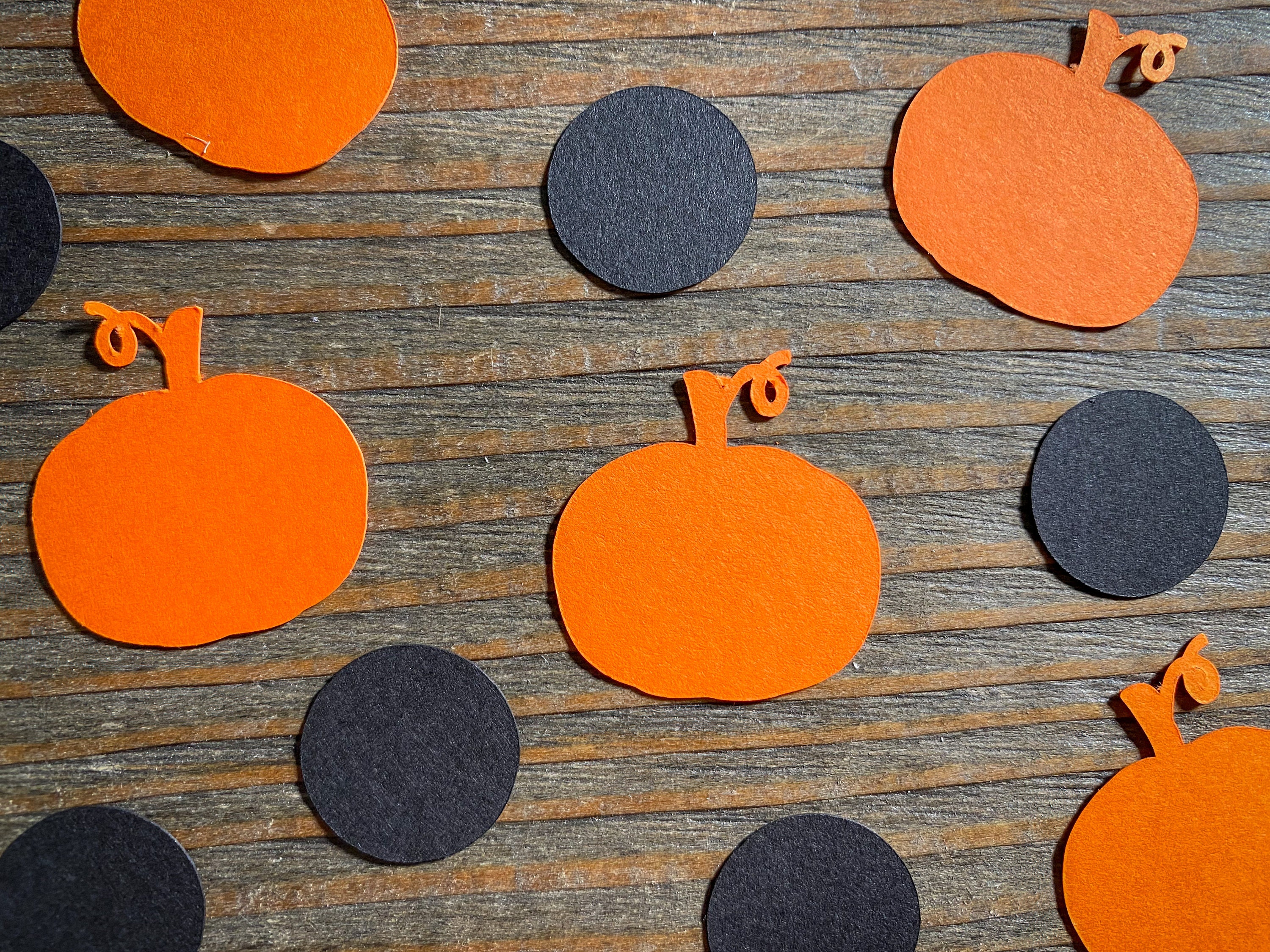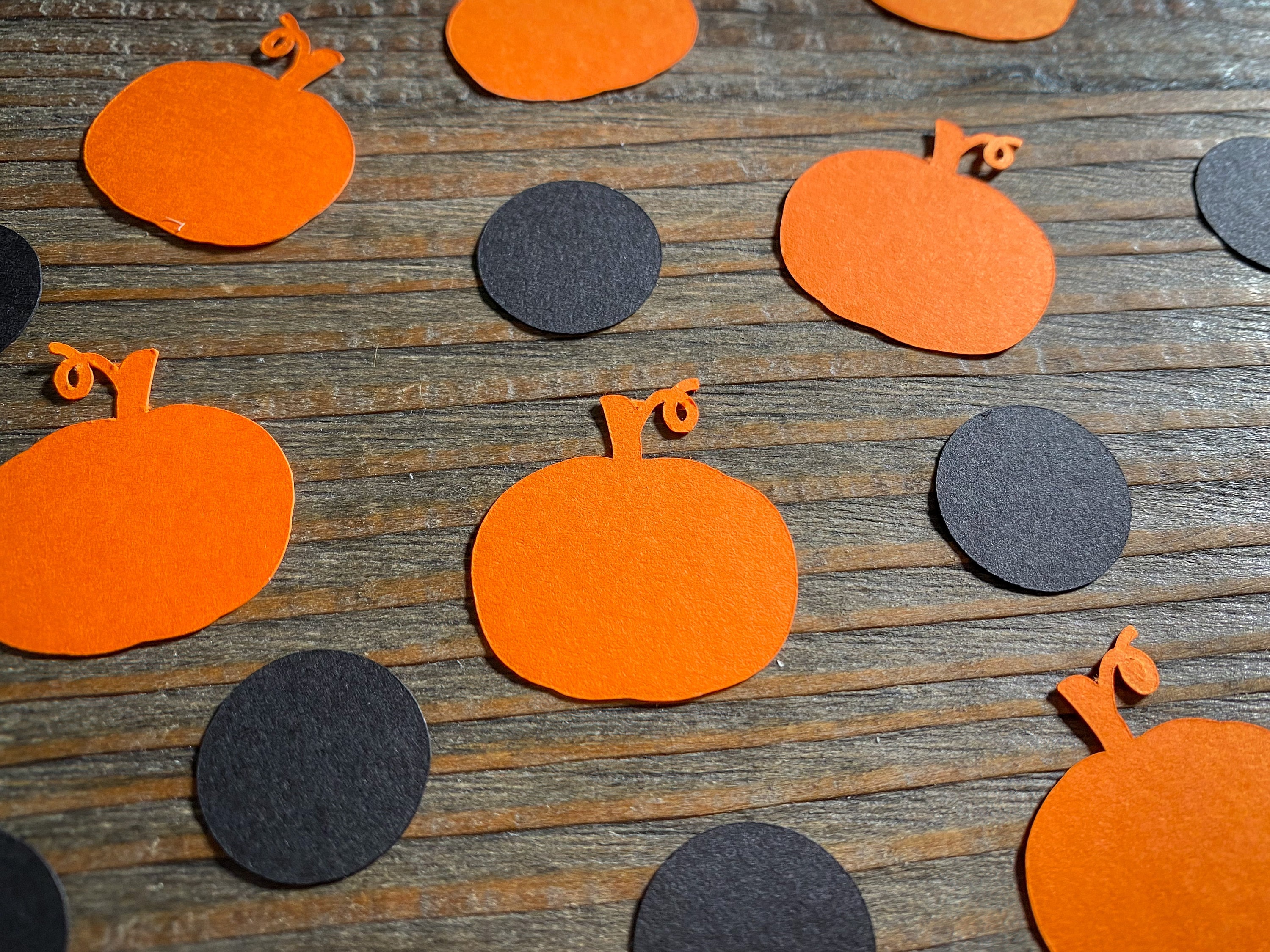 This listing is for 100 pieces of confetti. It includes 60 pieces of black circles and40 pieces of orange pumpkins. The confetti is made from premium cardstock. The pumpkins measure approximately 1.25 inches wide. The circles measure approximately .75 inches in diameter.