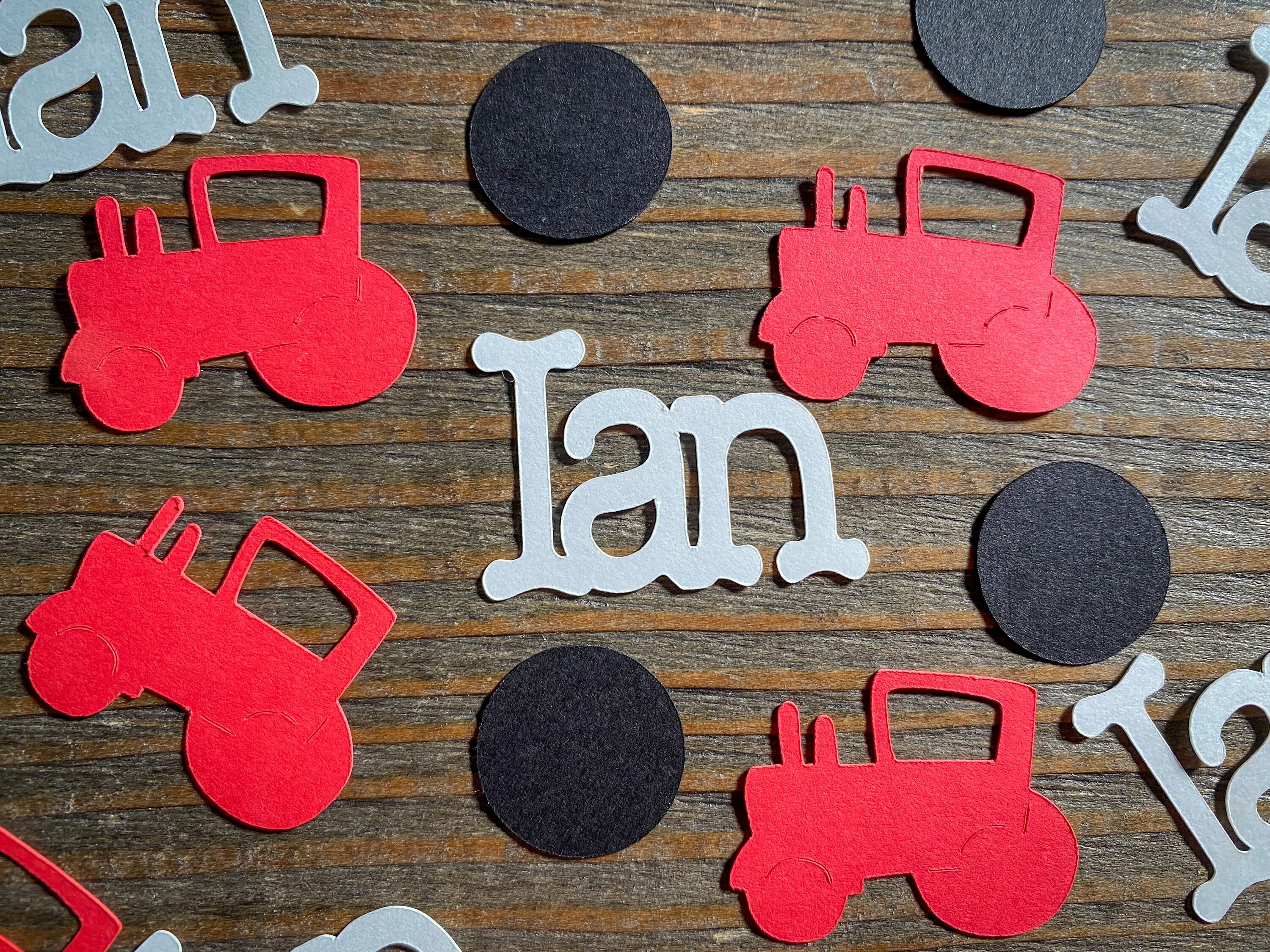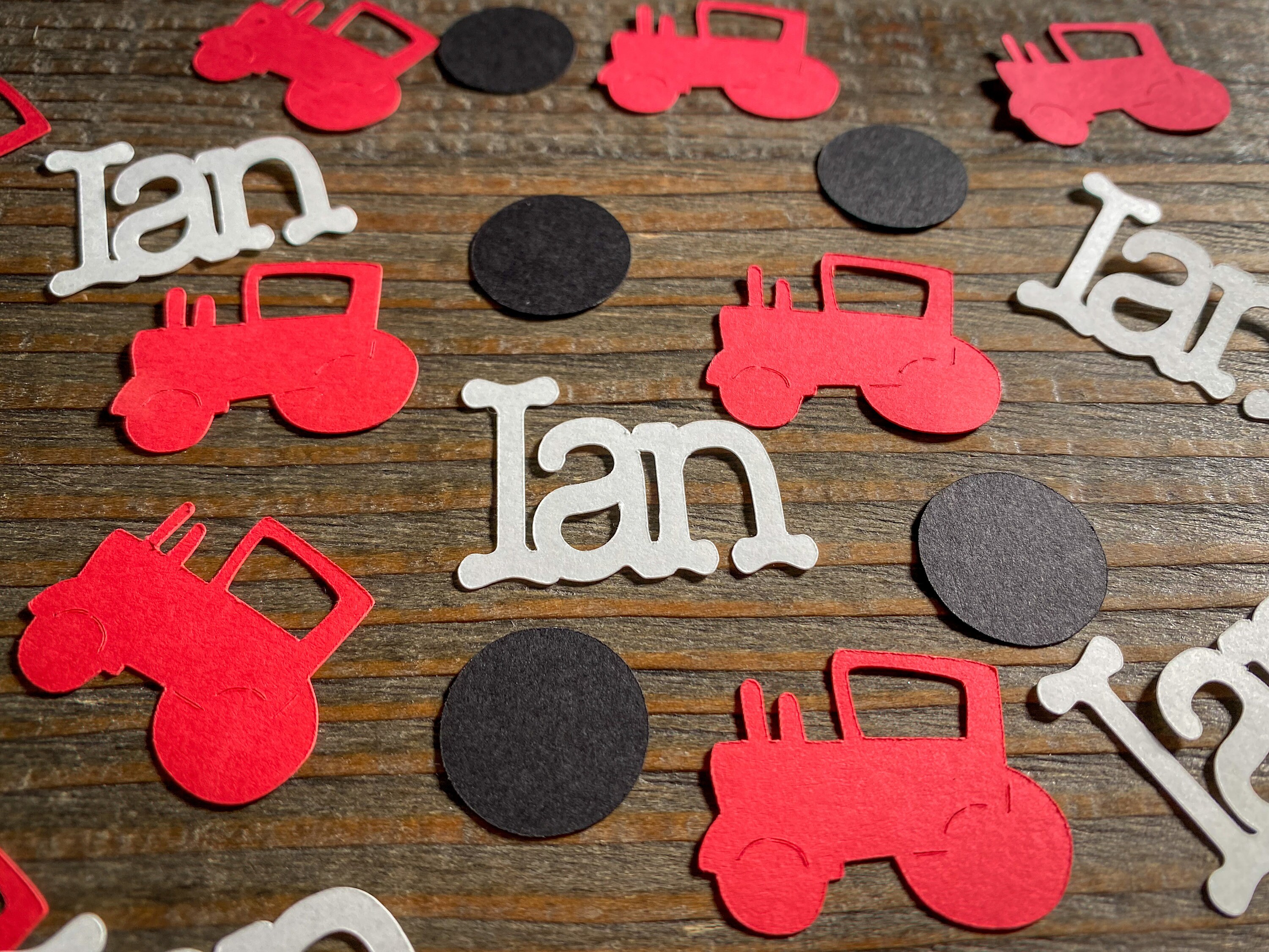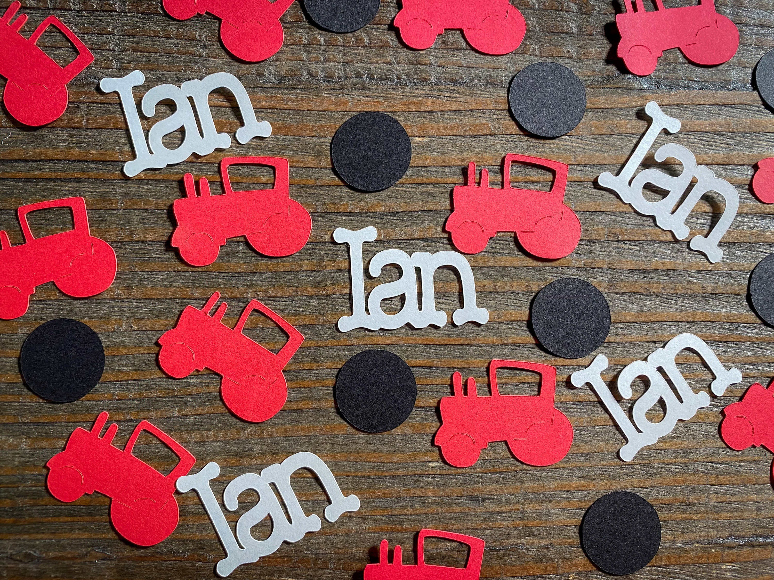 This listing is for 100 pieces of confetti! It includes 25 pieces of white name confetti, 25 pieces of red tractor confetti, and 50 pieces of black circles. The circles measure approximately .75 inches in diameter. The tractors measure approximately 1.25 in width by 1 inch in height. The names measure approximately 1 inch in height and the length varies based on the name.