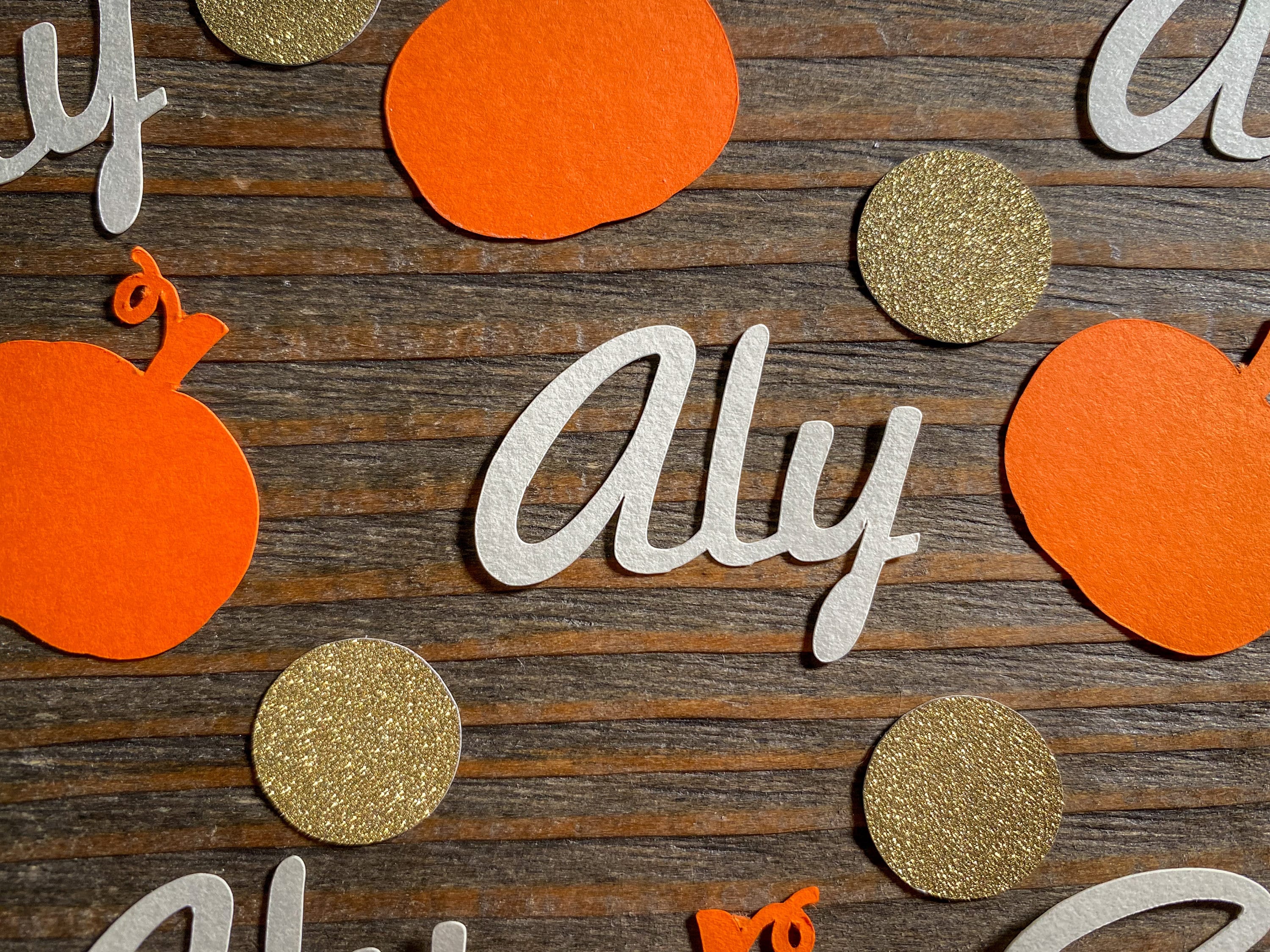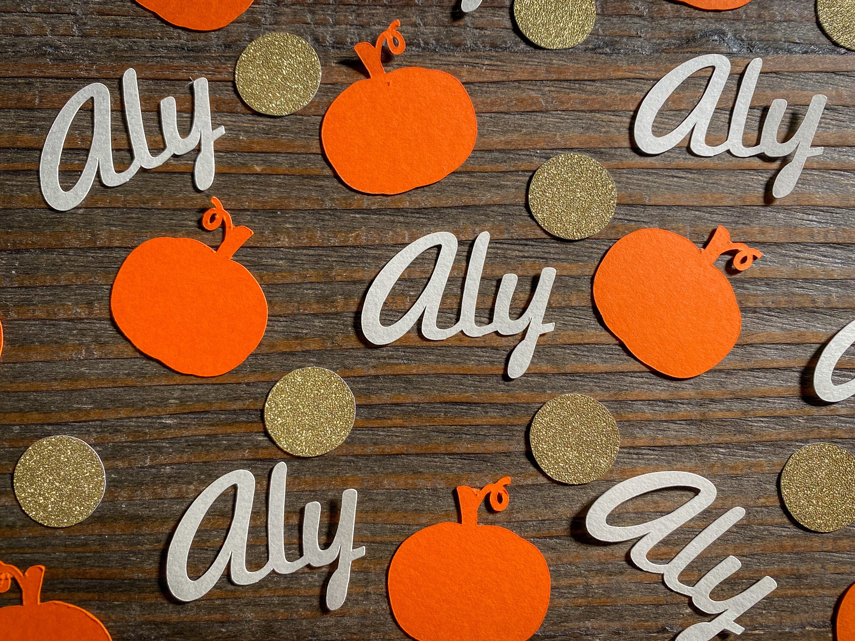 This listing is for 100 pieces of confetti. It includes 25 pieces of cream baby name pieces, 25 pieces of orange pumpkins, and 50 pieces of gold circles. The confetti is made from premium cardstock. The pumpkins measure approximately 1.25 inches wide. The circles measure approximately