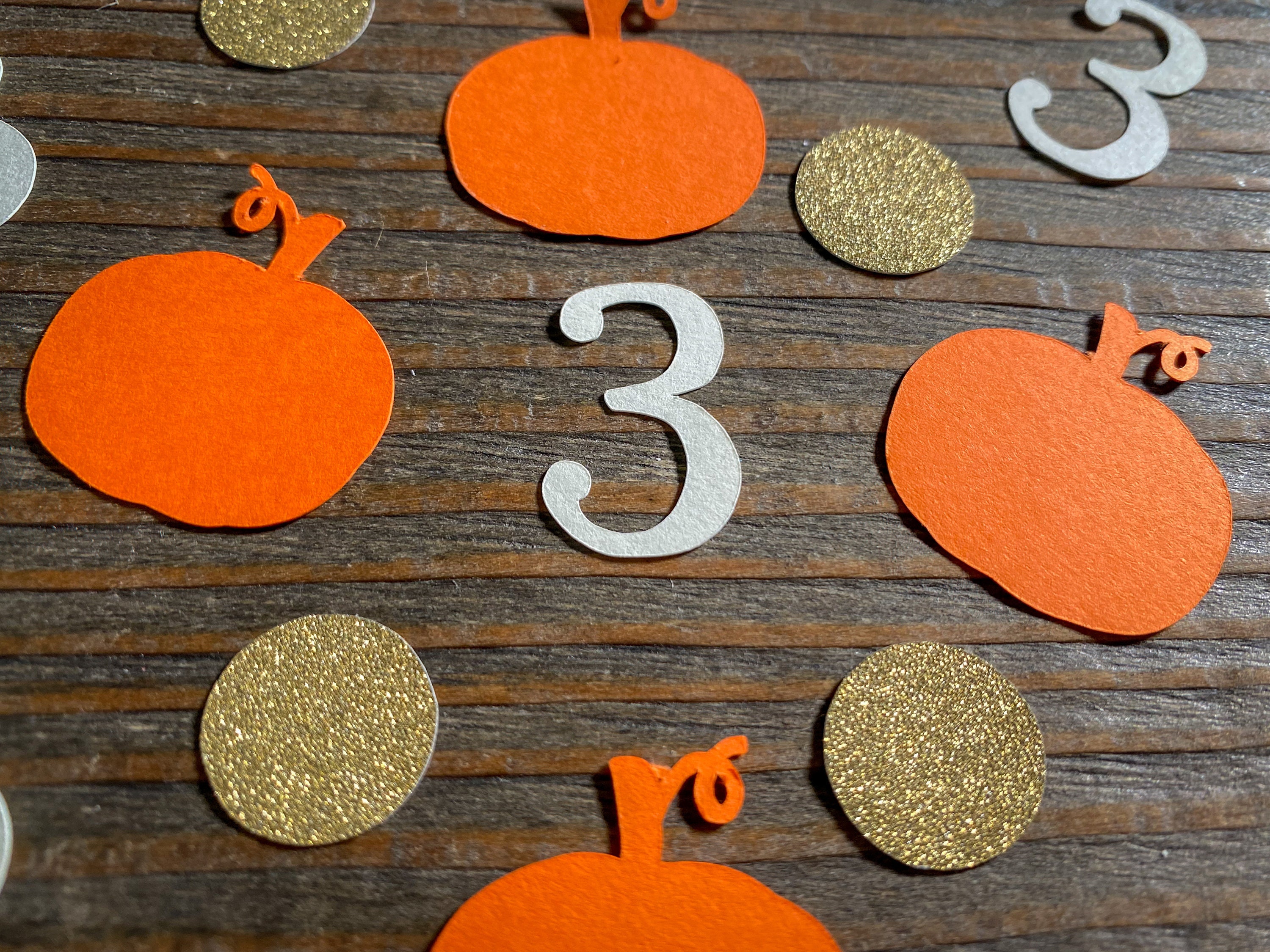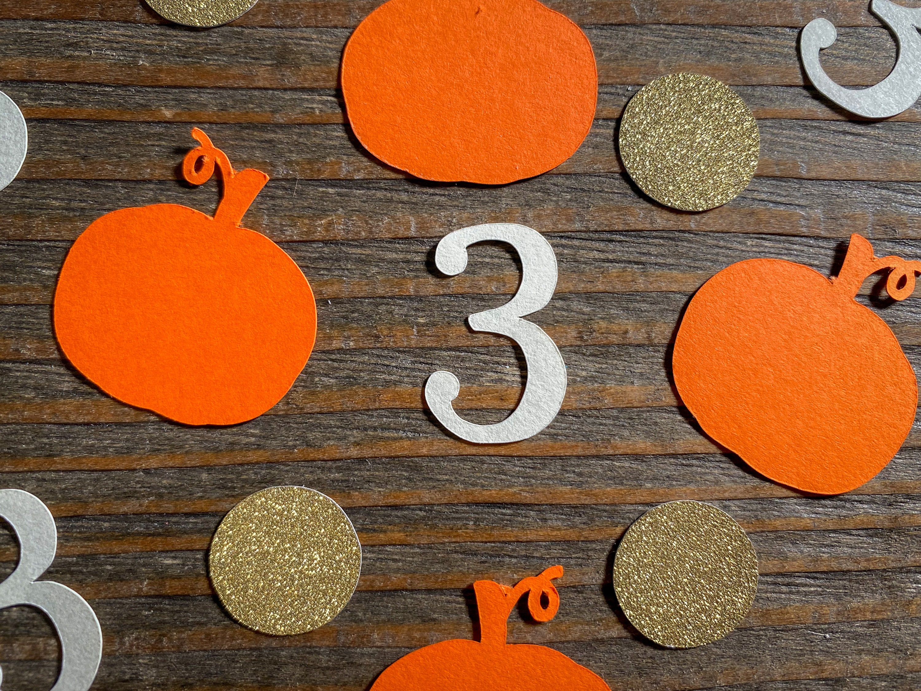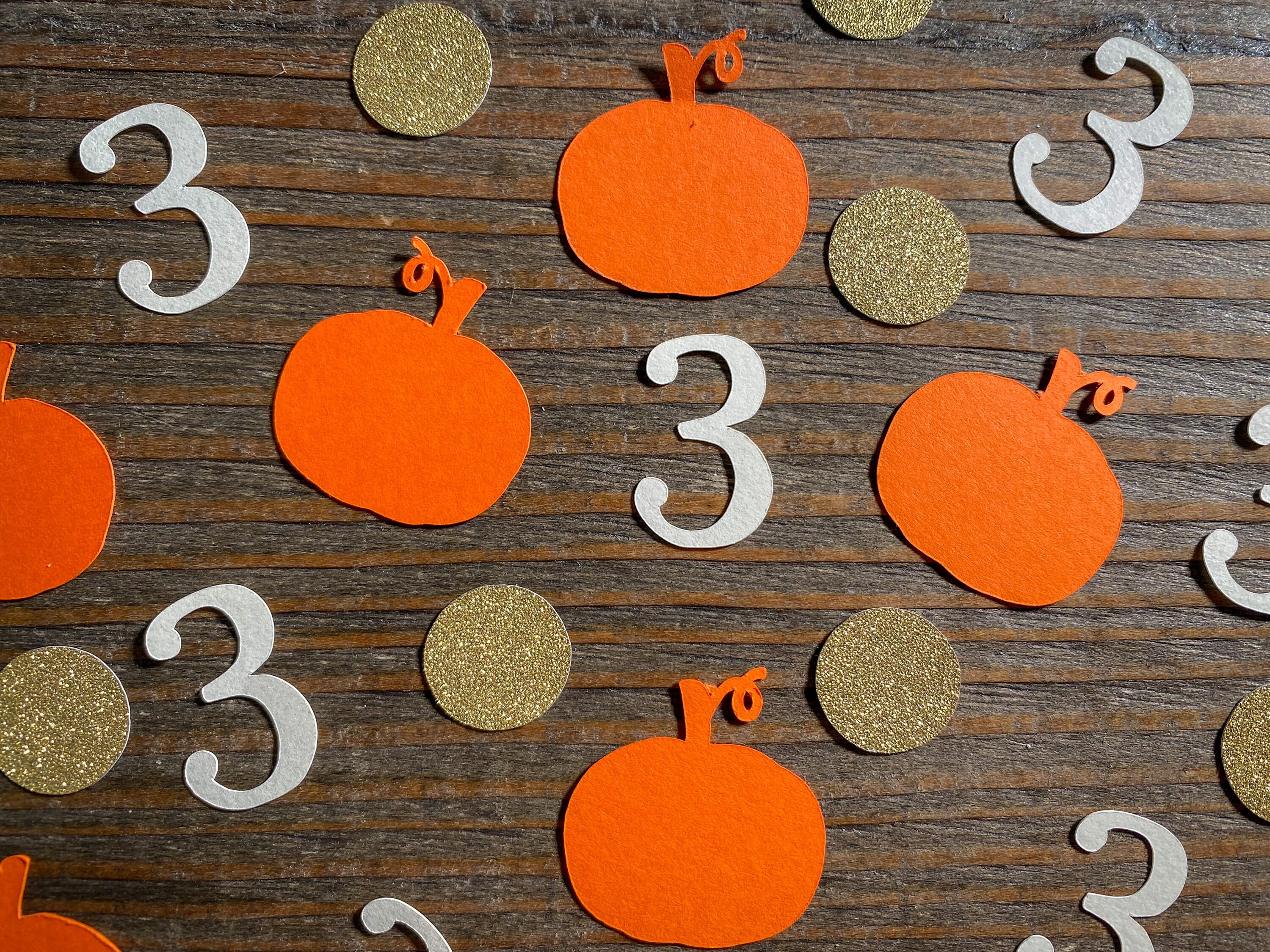 This listing is for 100 pieces of confetti. It includes 25 pieces of cream numbers, 25 pieces of orange pumpkins, and 50 pieces of gold circles. The confetti is made from premium cardstock. The pumpkins measure approximately 1.25 inches wide. The circles measure approximately
