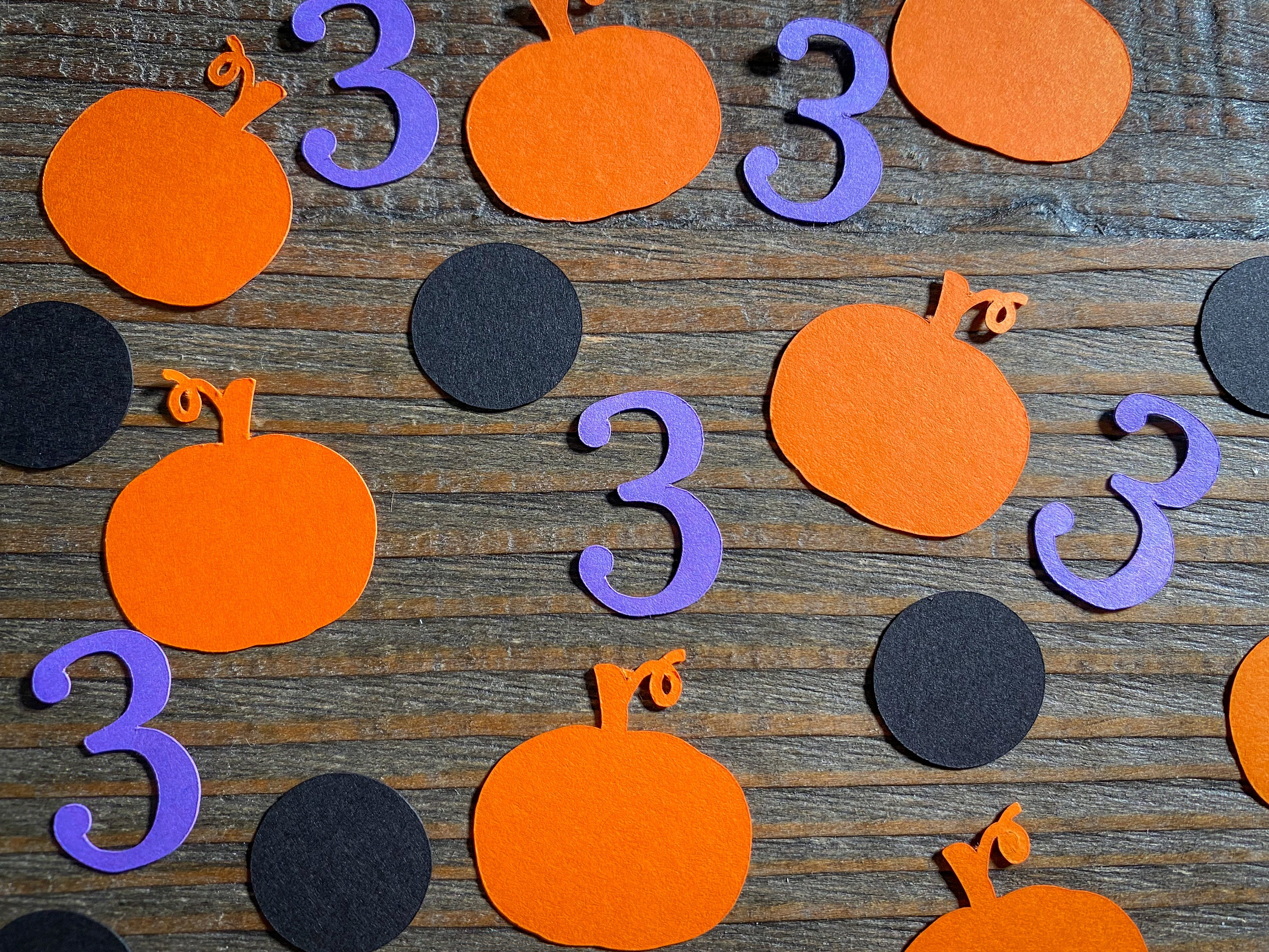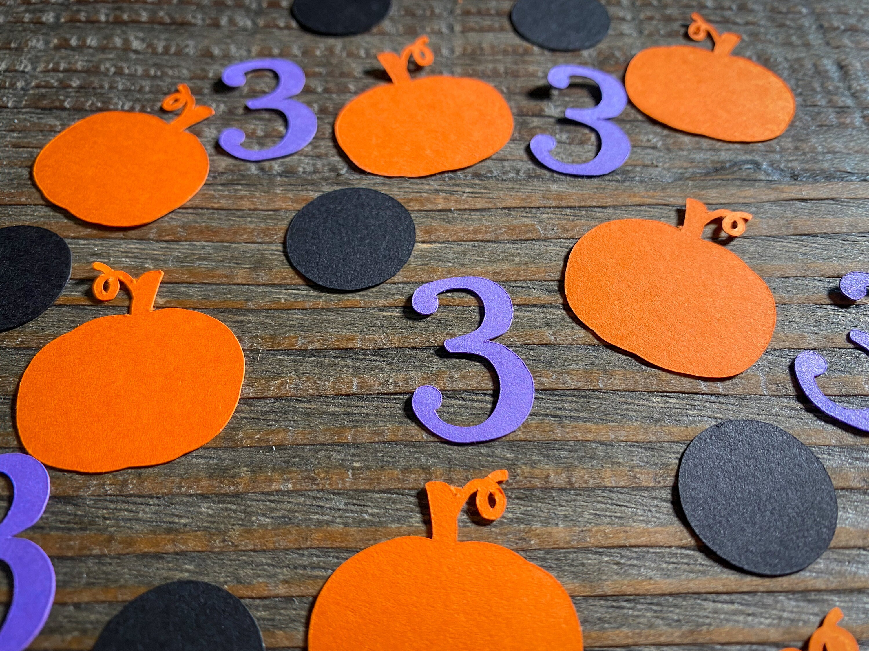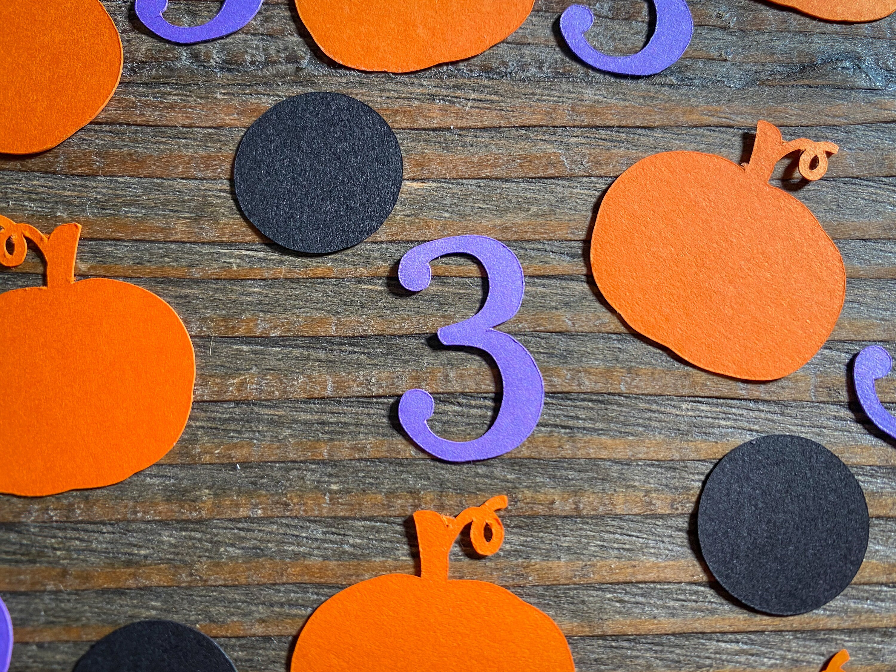 This listing is for 100 pieces of confetti. It includes 25 pieces of purple numbers, 25 pieces of orange pumpkins, and 50 pieces of black circles. The confetti is made from premium cardstock. The pumpkins measure approximately 1.25 inches wide. The circles measure approximately