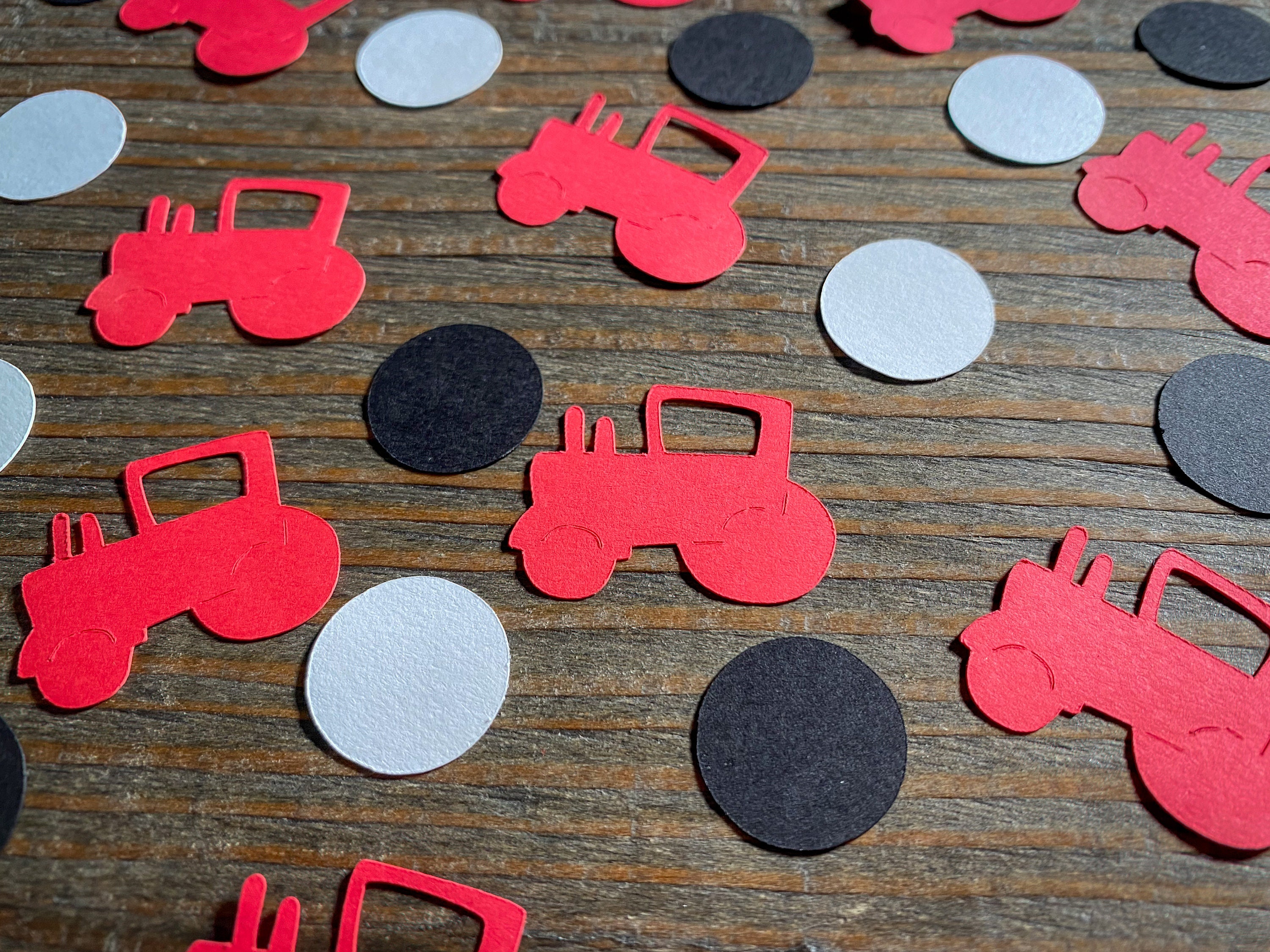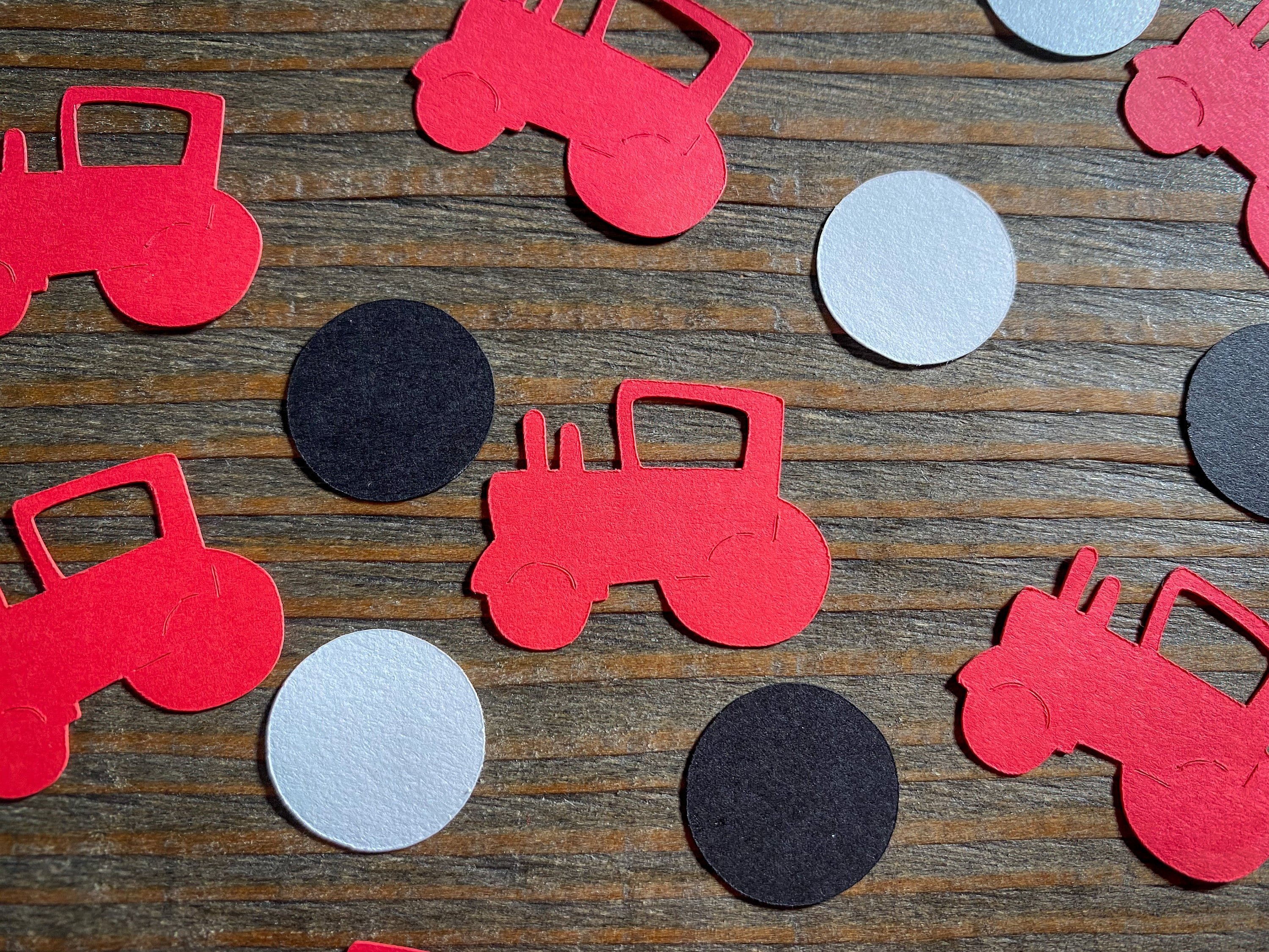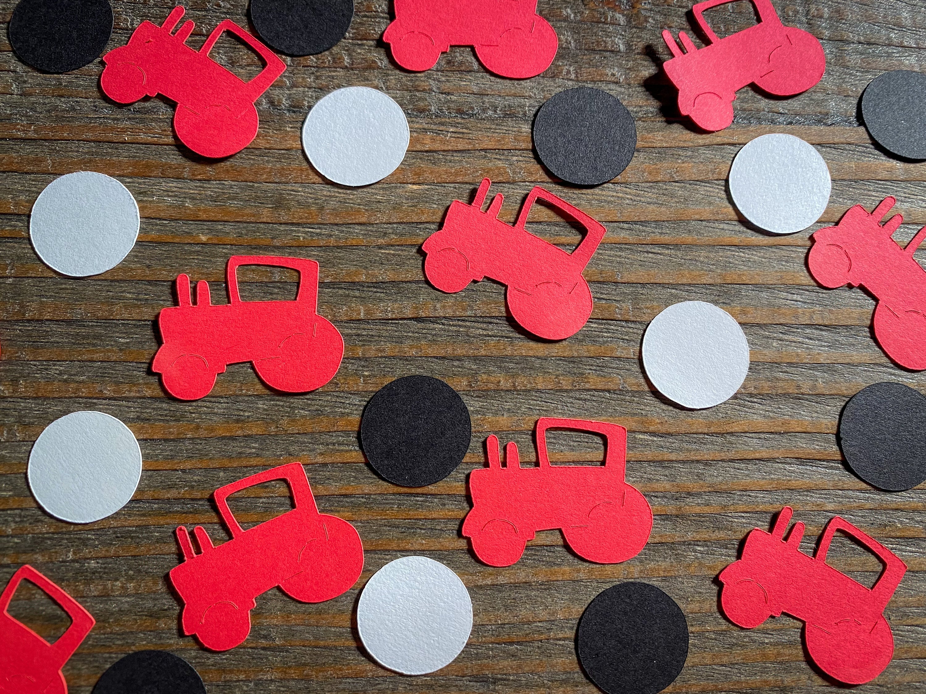 This listing is for 100 pieces of confetti! It includes 30 pieces of red tractor confetti, 35 pieces of black circles, and 35 pieces of white circles. The circles measure approximately .75 inches in diameter. The tractors measure approximately 1.25 in width by 1 inch in height.