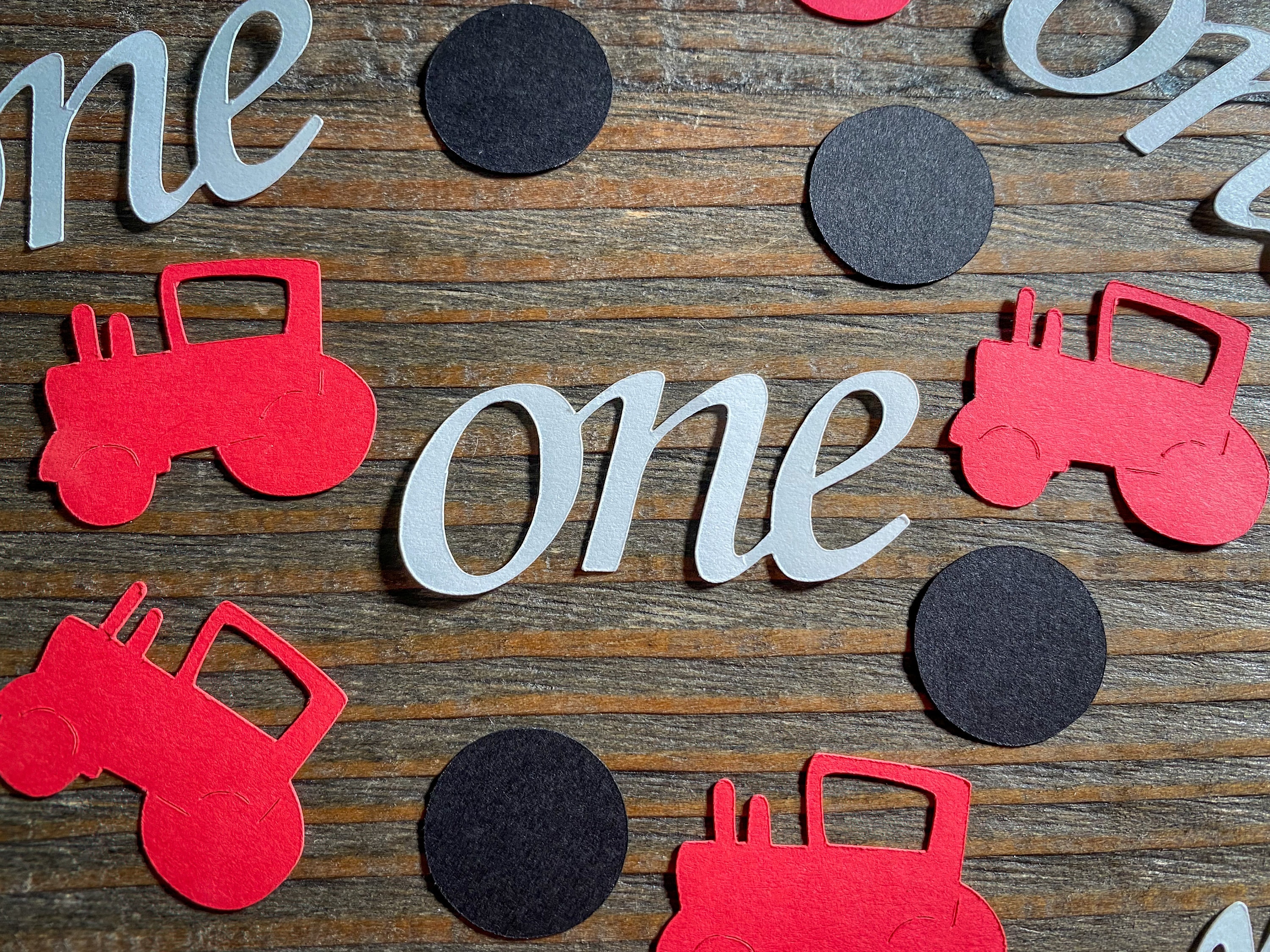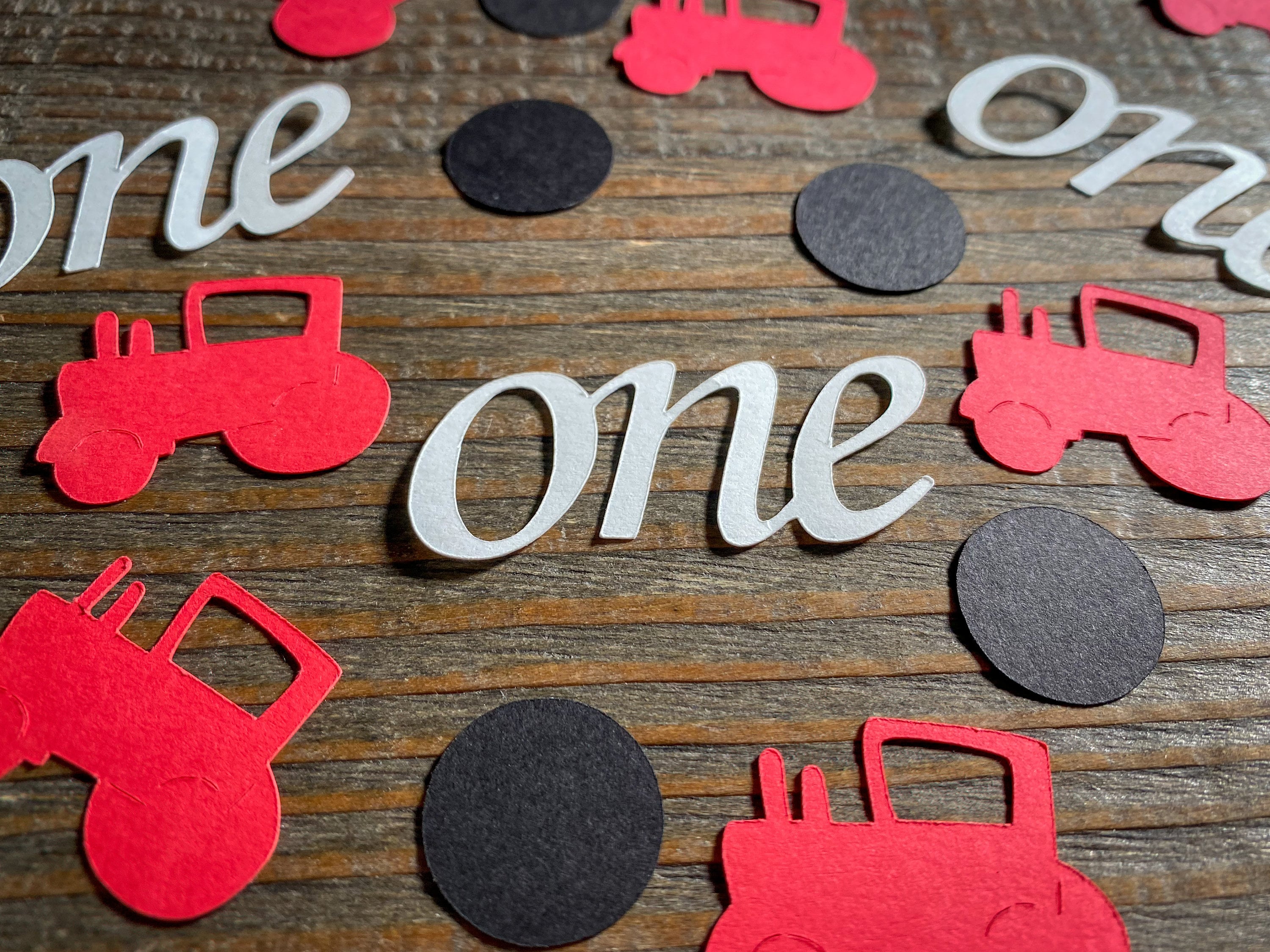 This listing is for 100 pieces of confetti! It includes 20 pieces of white one confetti, 50 pieces of black circles, and 30 pieces of red tractor confetti. The tractor pieces measure approximately 1 inch in height by 1.25 inches in width. The circles measure approximately .75 inches in diameter.