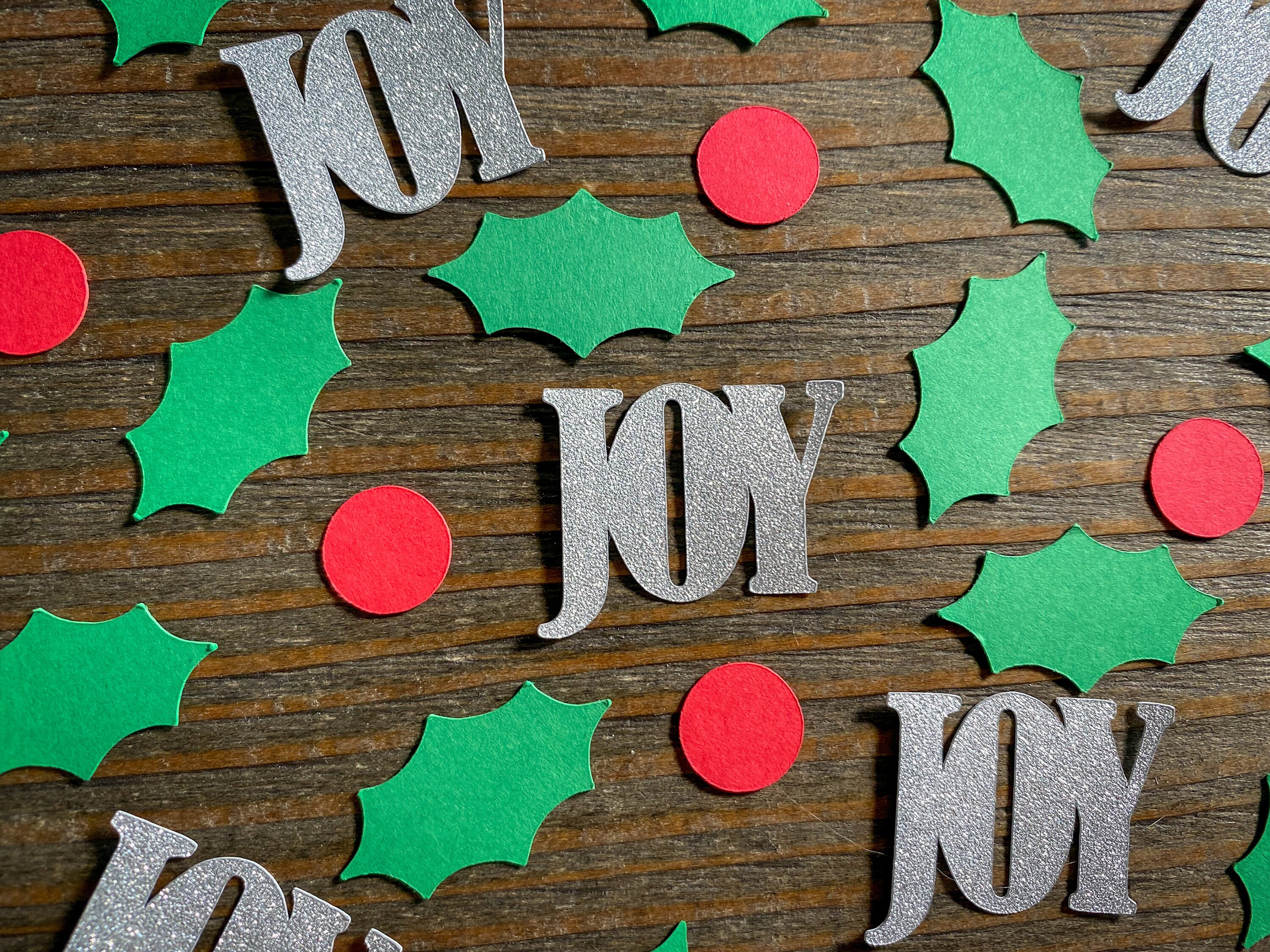 This listing is for 100 pieces of confetti. It includes 50 green holly leaves that measure 1.25 inches in length, 30 red berries that measure .5 inches in diameter and 20 pieces of silver joy that measure 1.25 inches. The silver confetti is white on the reverse side.