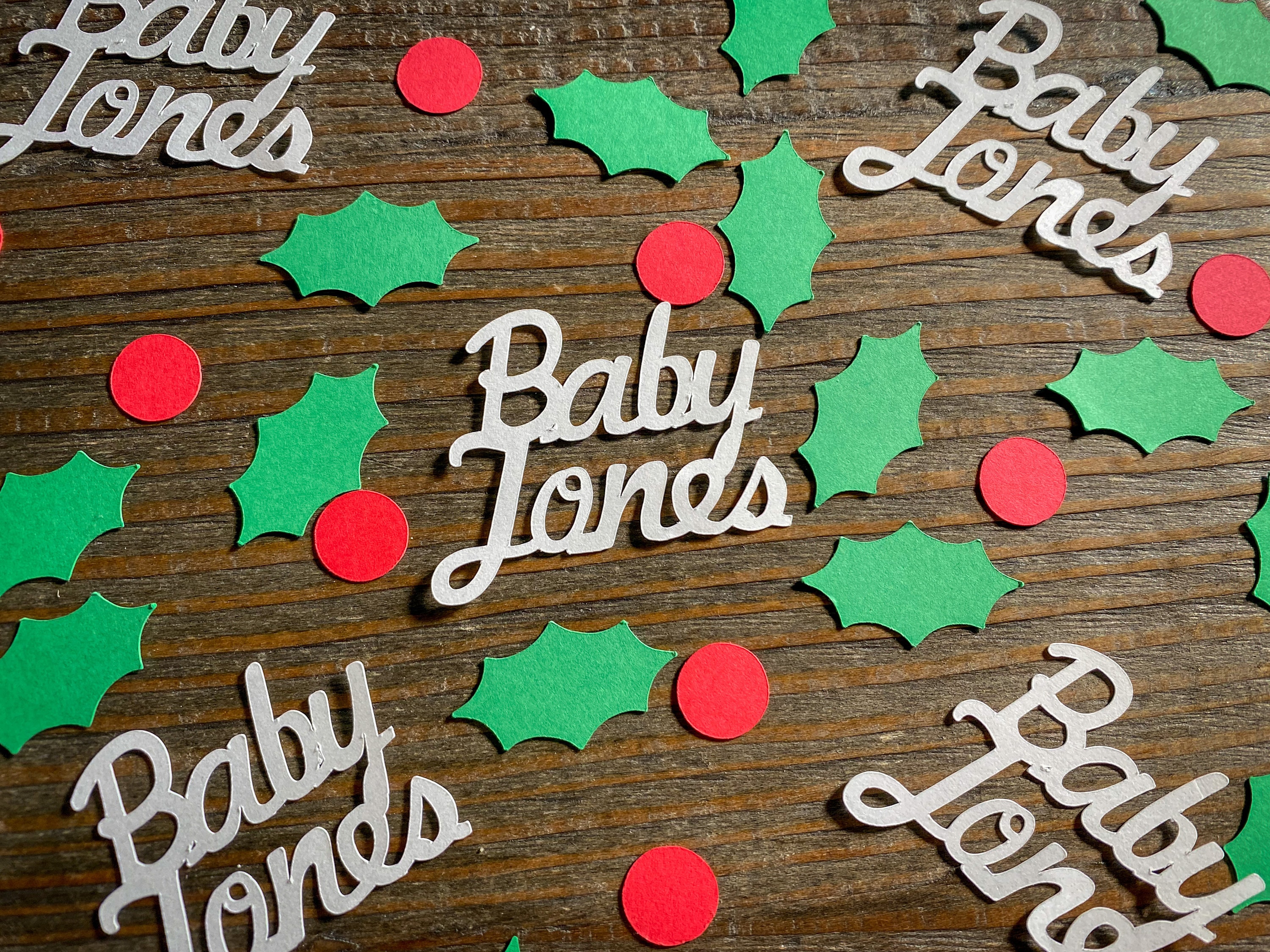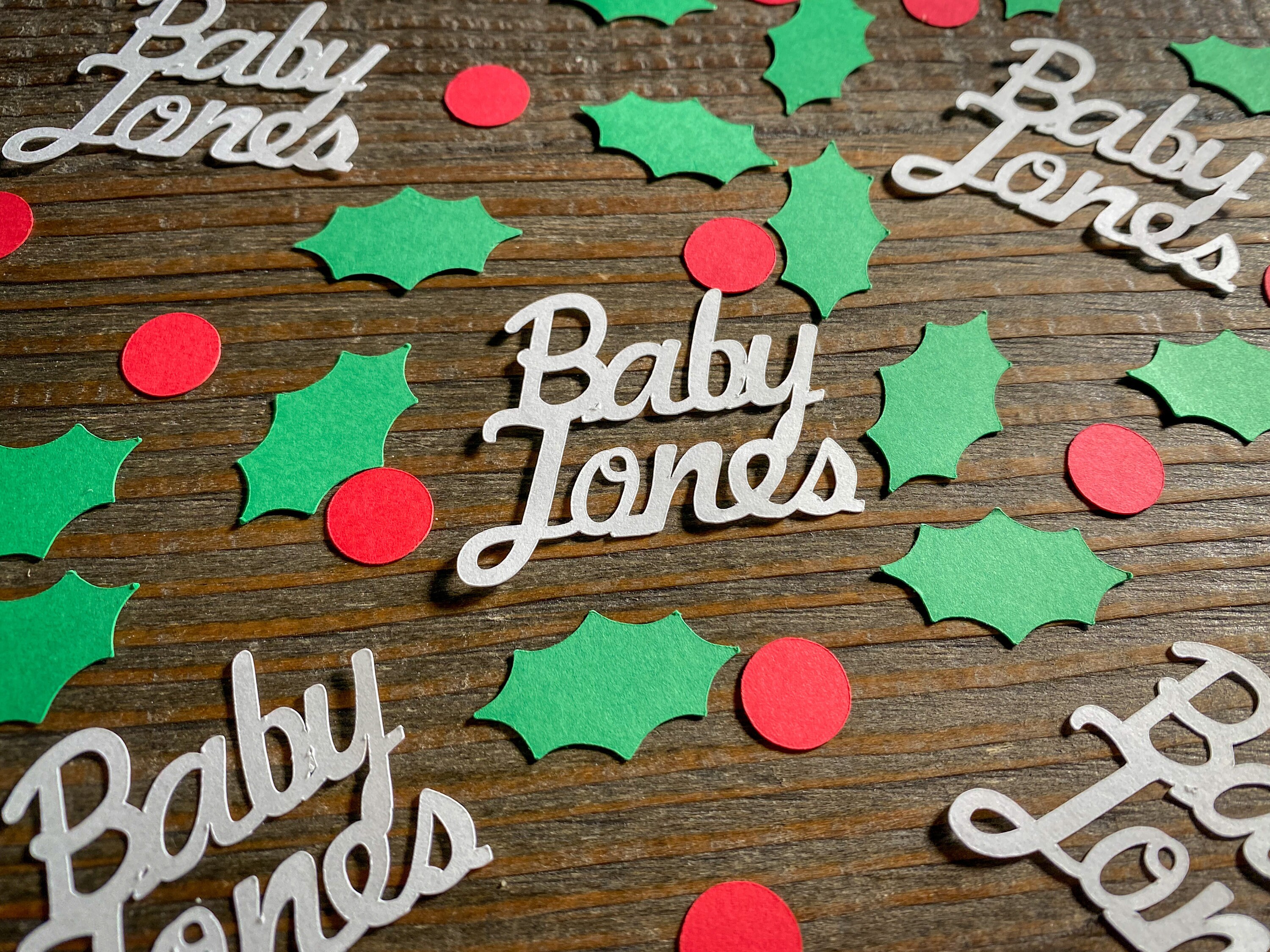 Are you hosting a winter themed baby shower? Add this personalized name confetti with holly and berries to your tables for the perfect finishing touch to your decor!