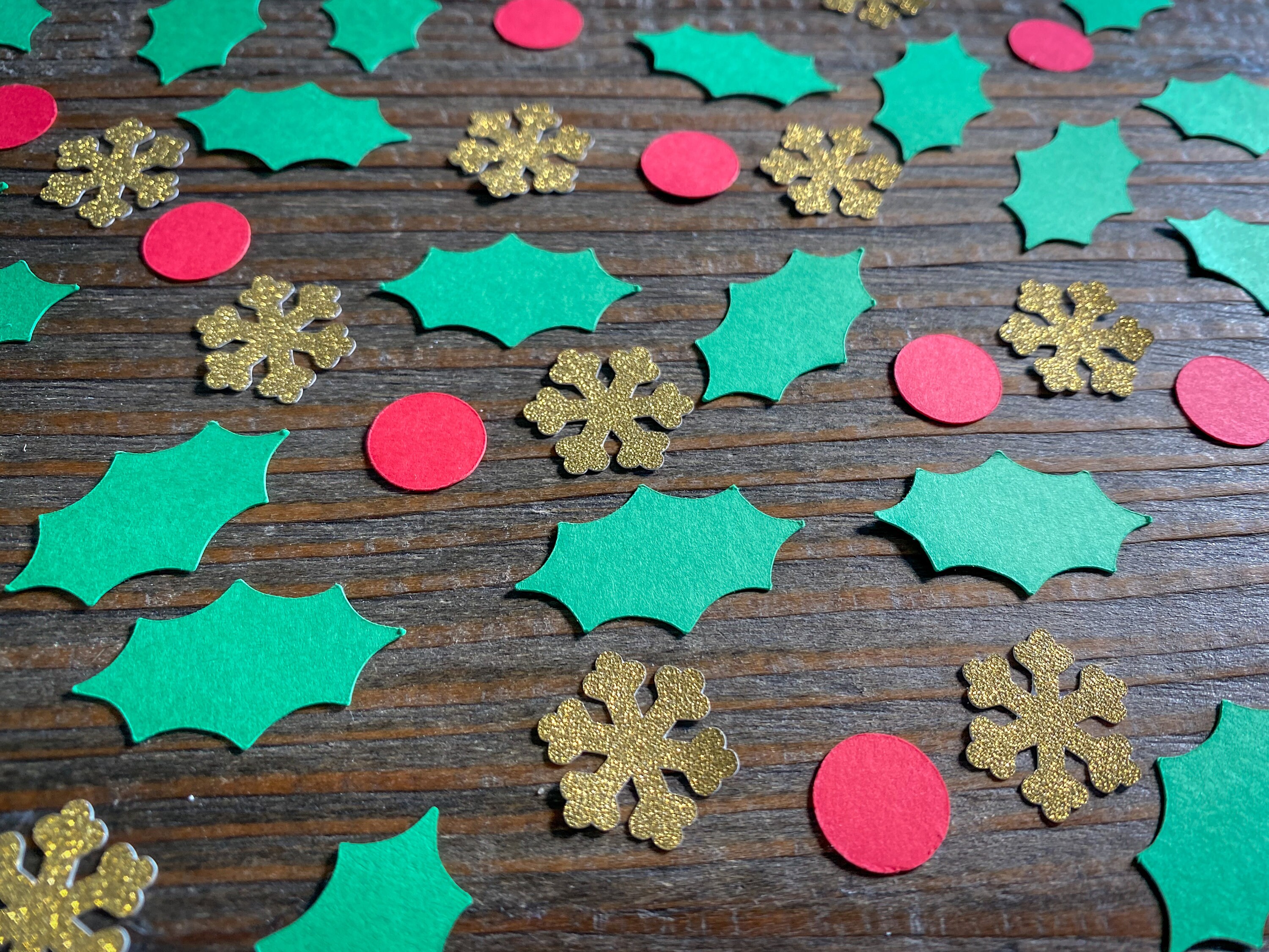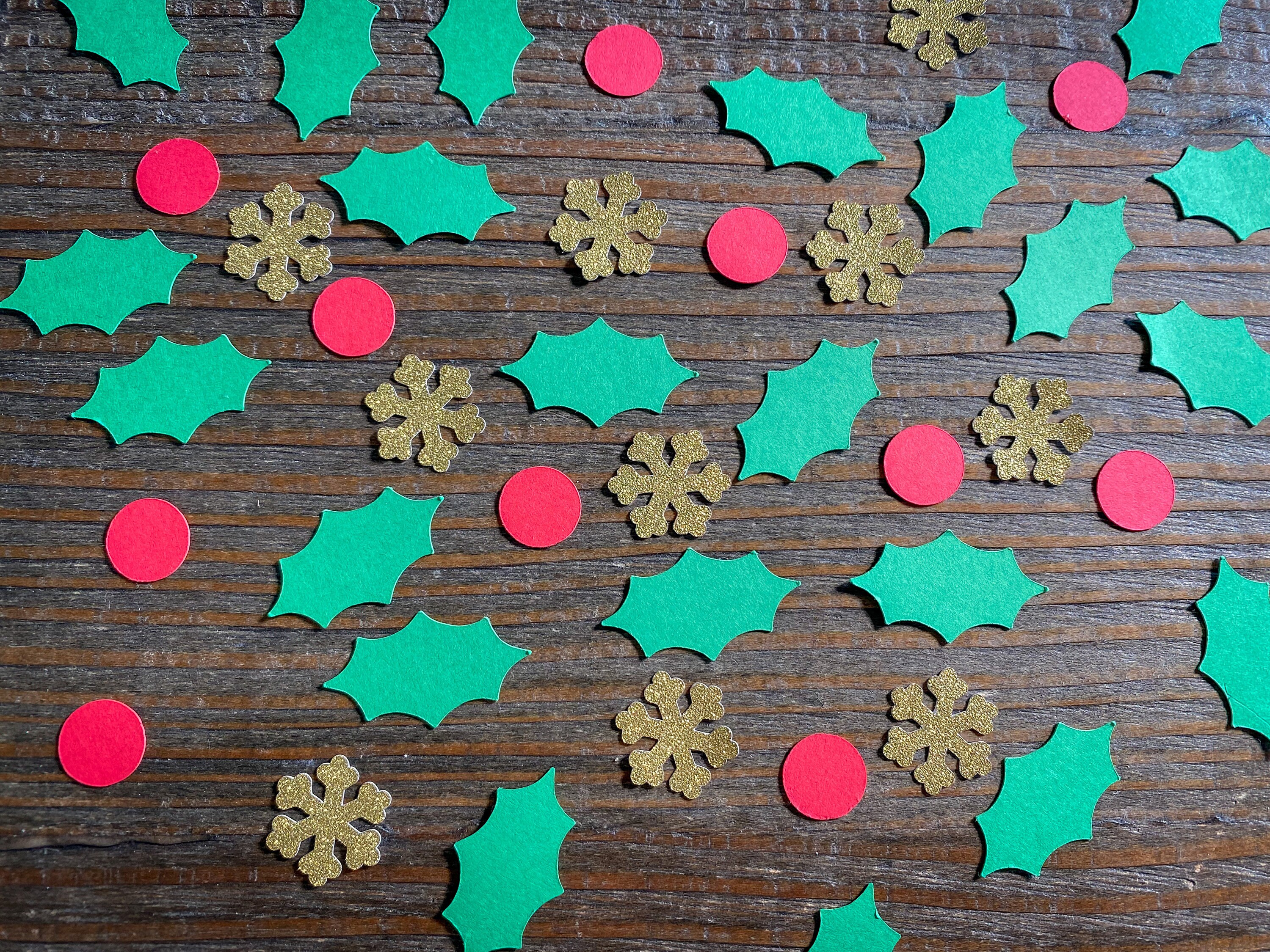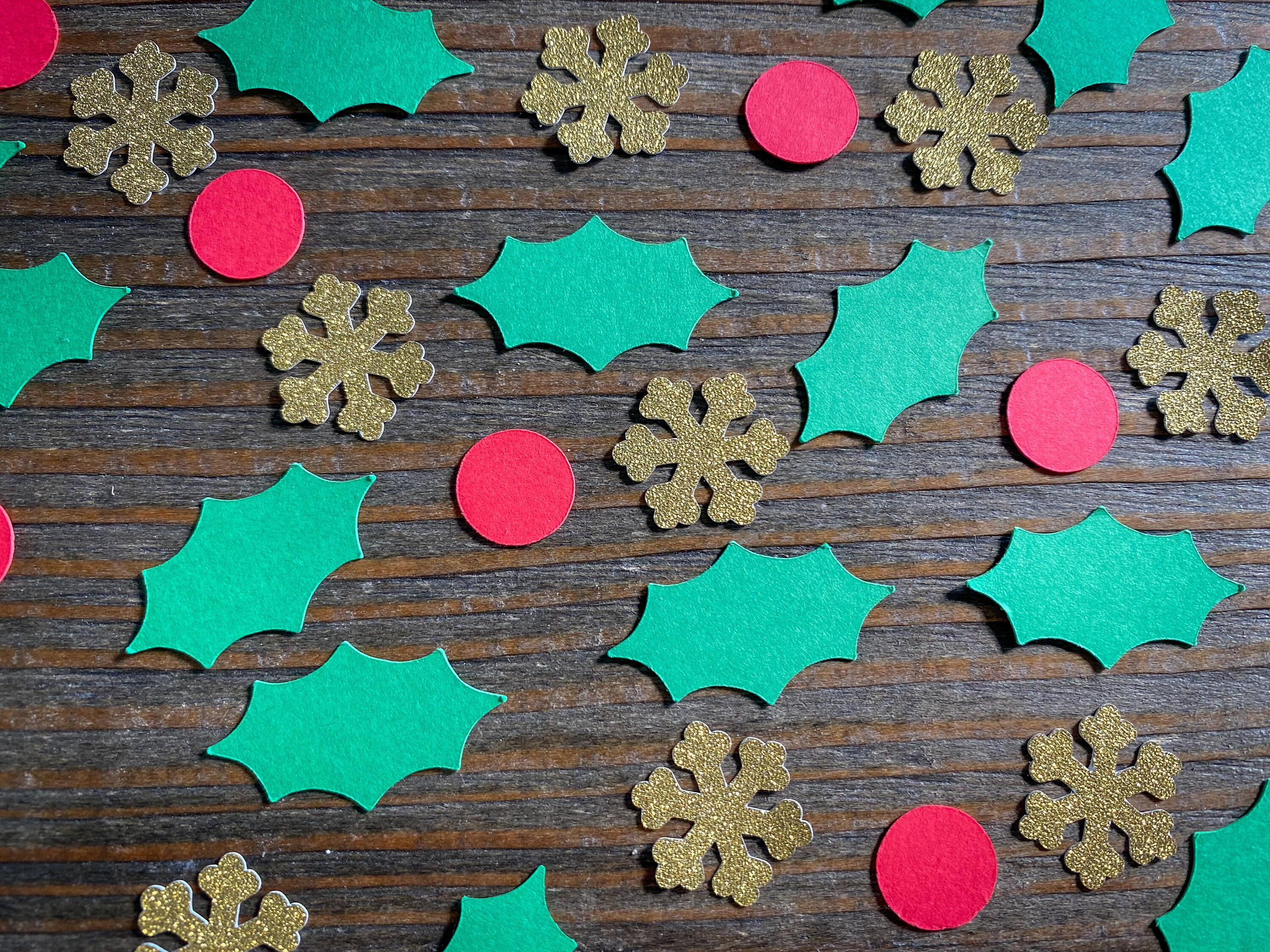 This listing is for 100 pieces of confetti. It includes 50 green holly leaves that measure 1.25 inches in length, 30 red berries that measure .5 inches in diameter and 20 pieces of gold snowflakes that measure .75 inches. The gold confetti is white on the reverse side.