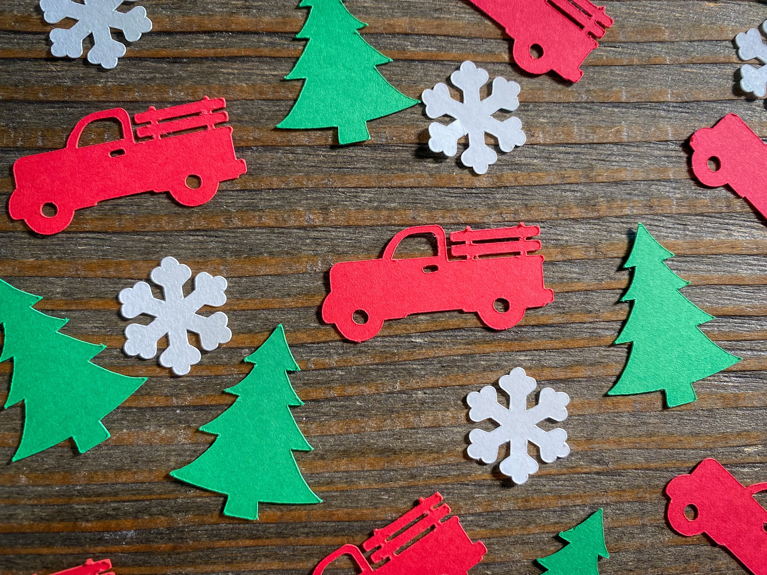 This listing is for 100 pieces of confetti. It includes 30 red trucks, 30 green Christmas trees, and 40 white snowflakes. The trucks measure approximately 1.5 inches in length, the trees measure approximately 1.25 inches, and the snowflakes measure .75 inches in width.