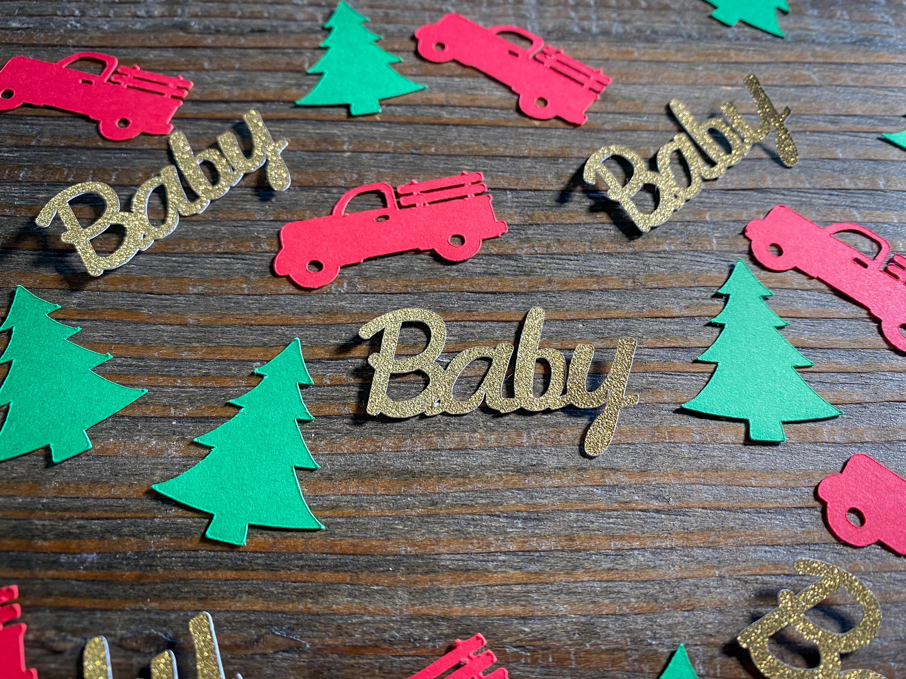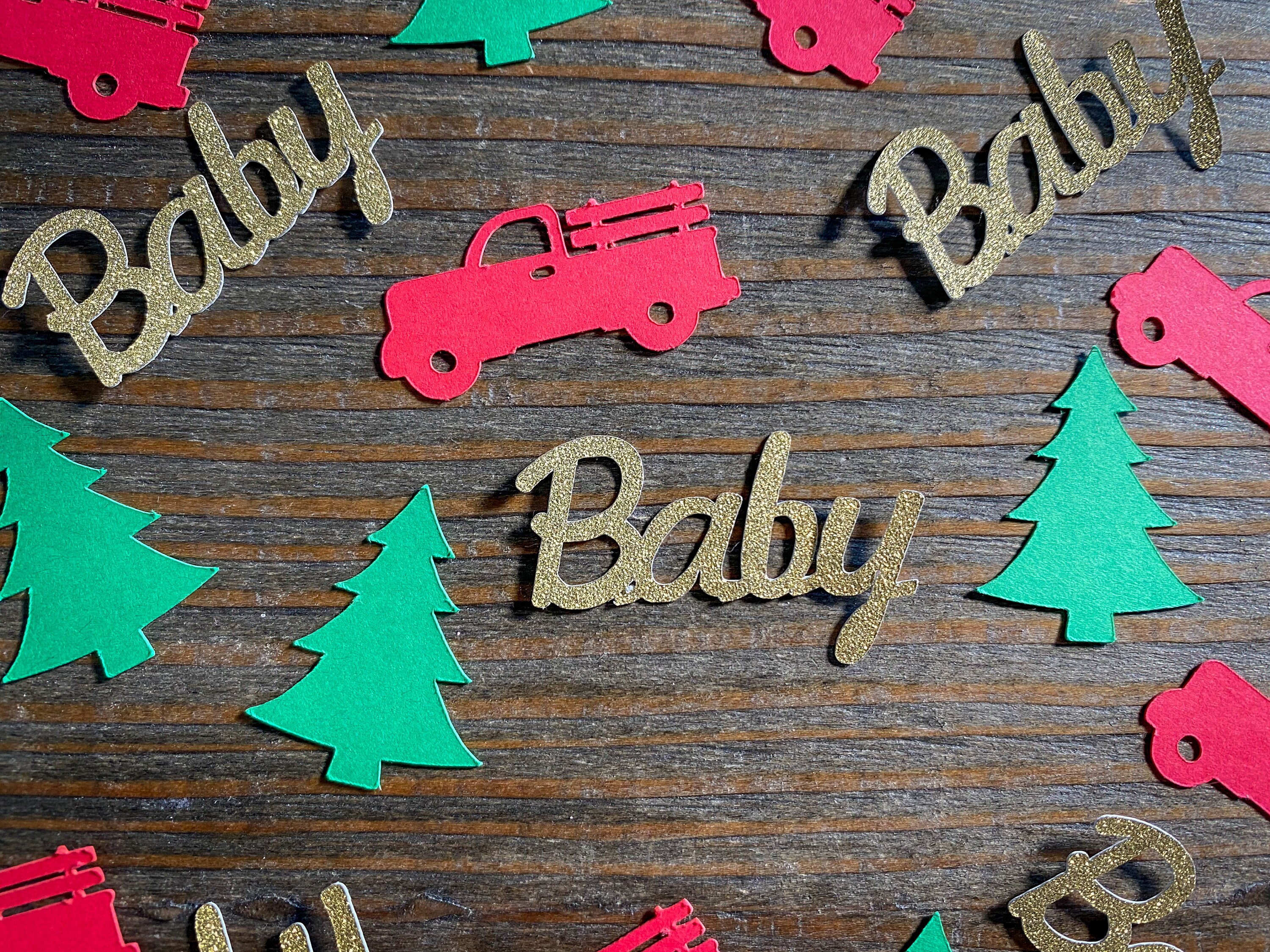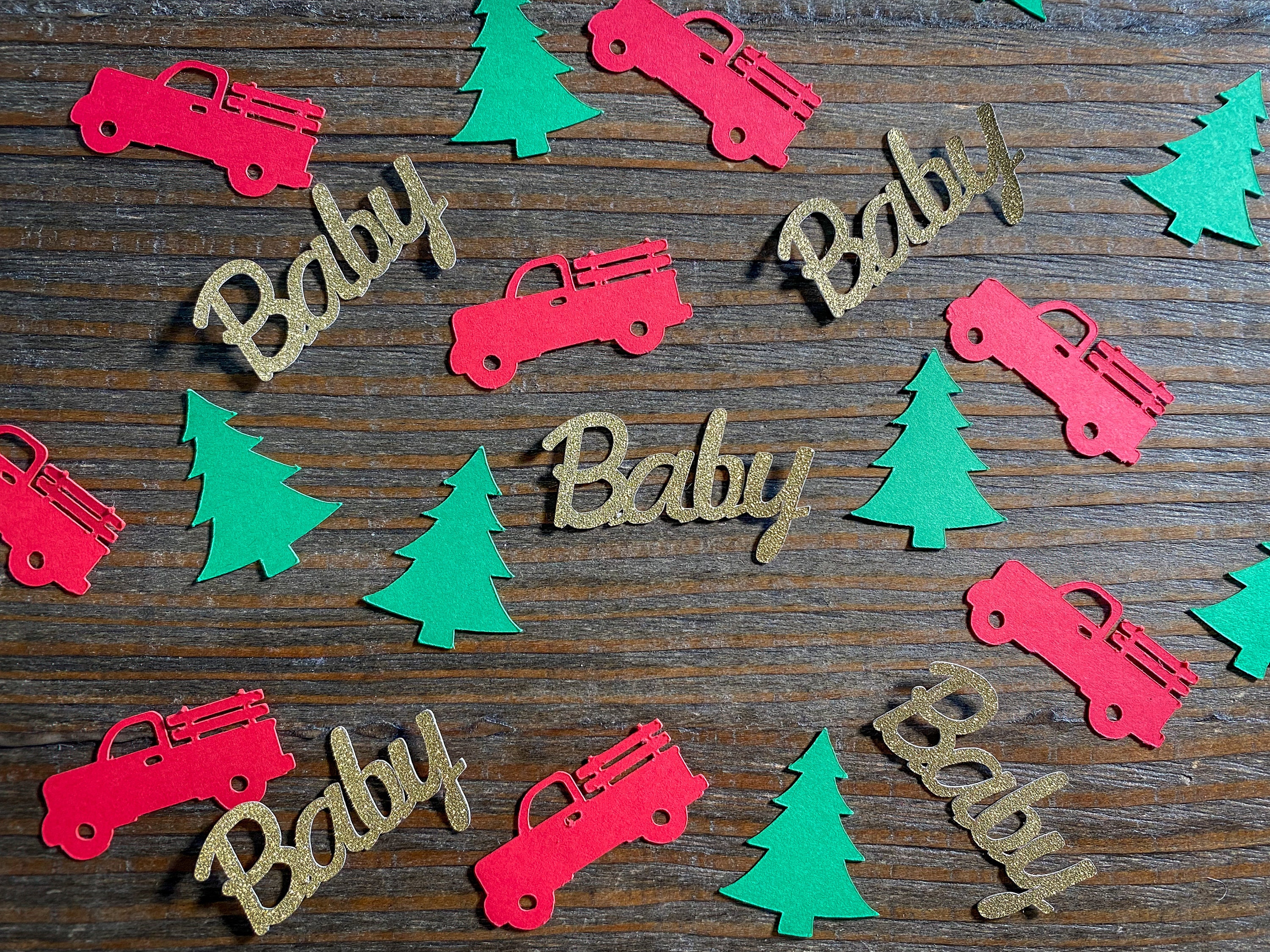 This listing is for 100 pieces of confetti. It includes 40 red trucks, 40 green Christmas trees, and 20 gold baby pieces. The trucks measure approximately 1.5 inches in length, the trees measure approximately 1.25 inches, and the baby measure 1.5inches in width. The baby pieces are white on the reverse side.