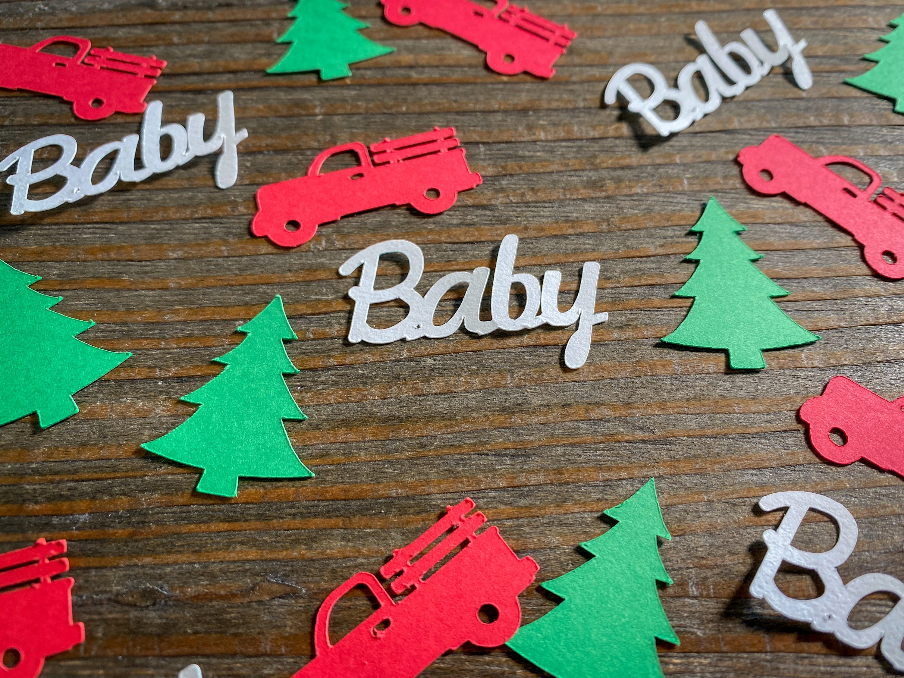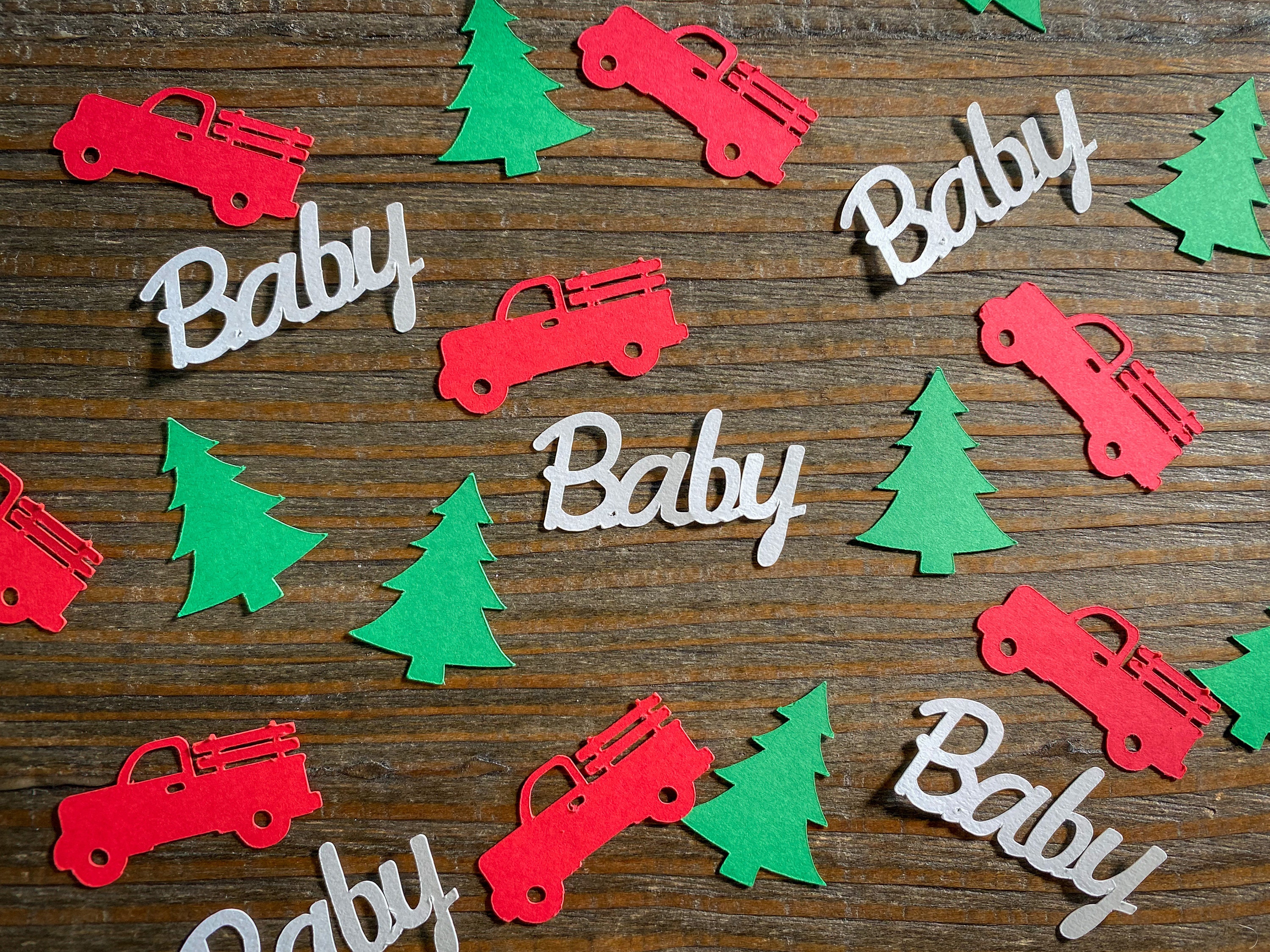 This listing is for 100 pieces of confetti. It includes 40 red trucks, 40 green Christmas trees, and 20 white baby pieces. The trucks measure approximately 1.5 inches in length, the trees measure approximately 1.25 inches, and the baby measure 1.5inches in width..