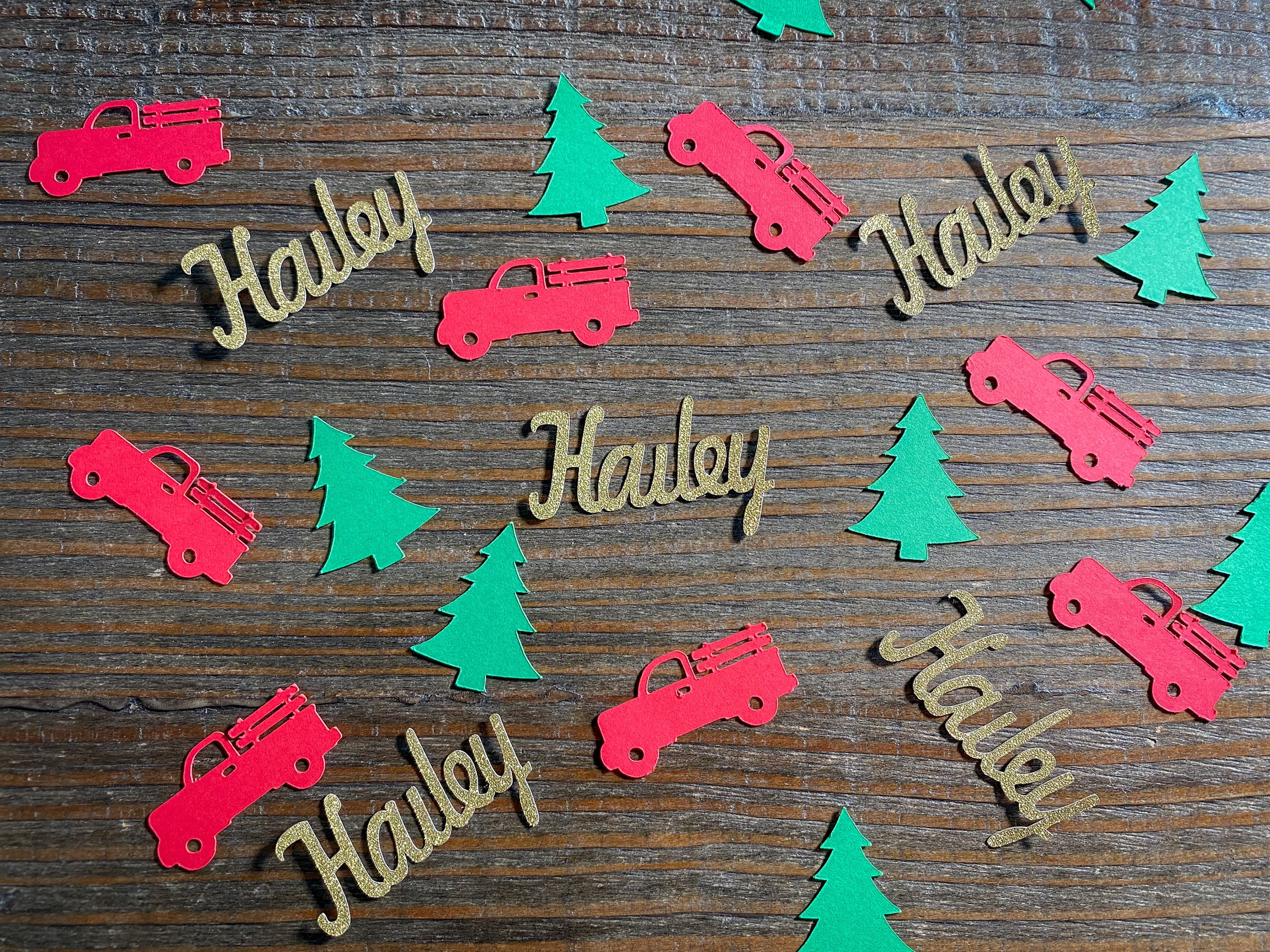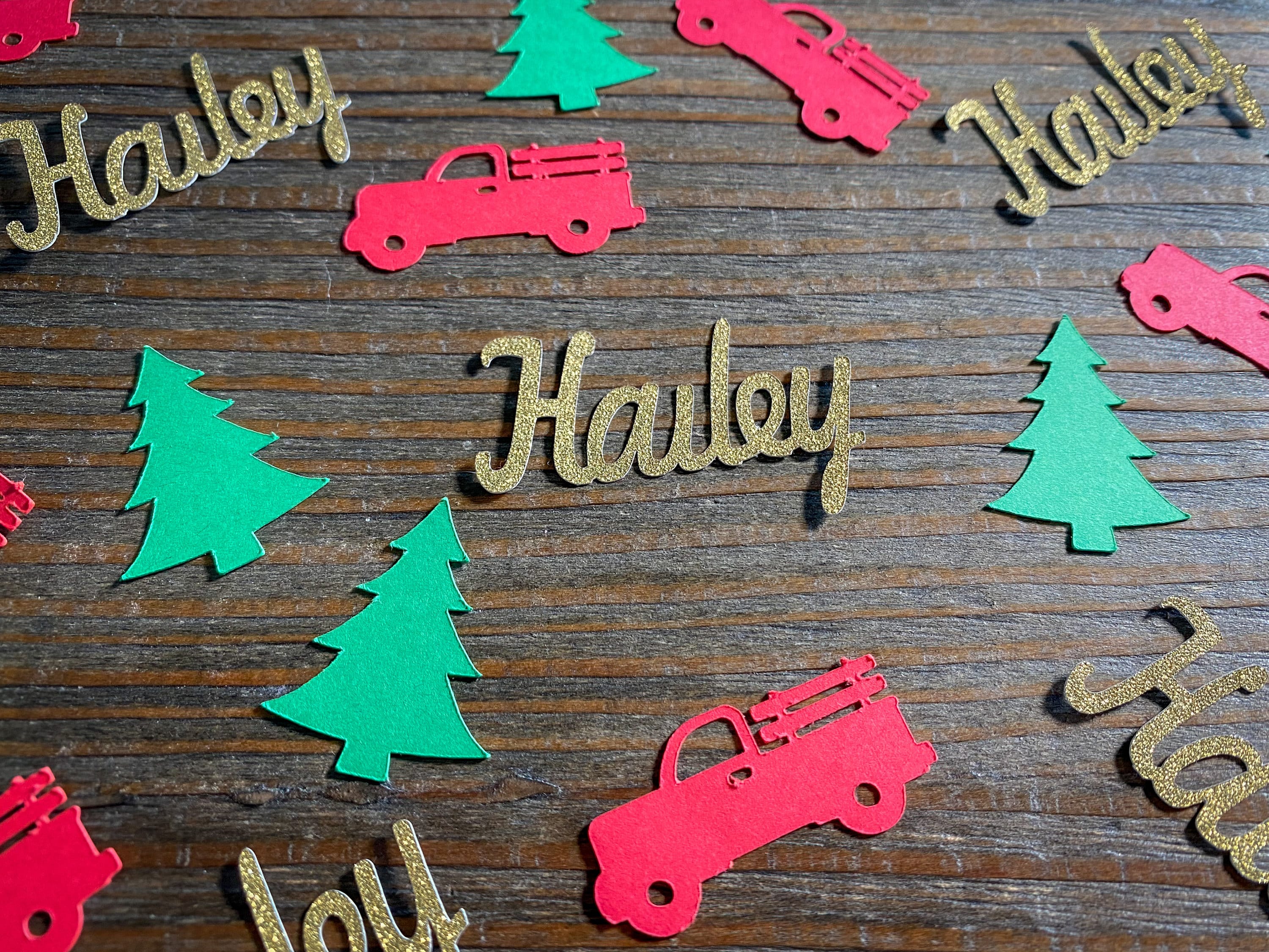 This listing is for 100 pieces of confetti. It includes 40 red trucks, 40 green Christmas trees, and 20 gold name pieces. The trucks measure approximately 1.5 inches in length and the trees measure approximately 1.25 inches. The name pieces are white on the reverse side.