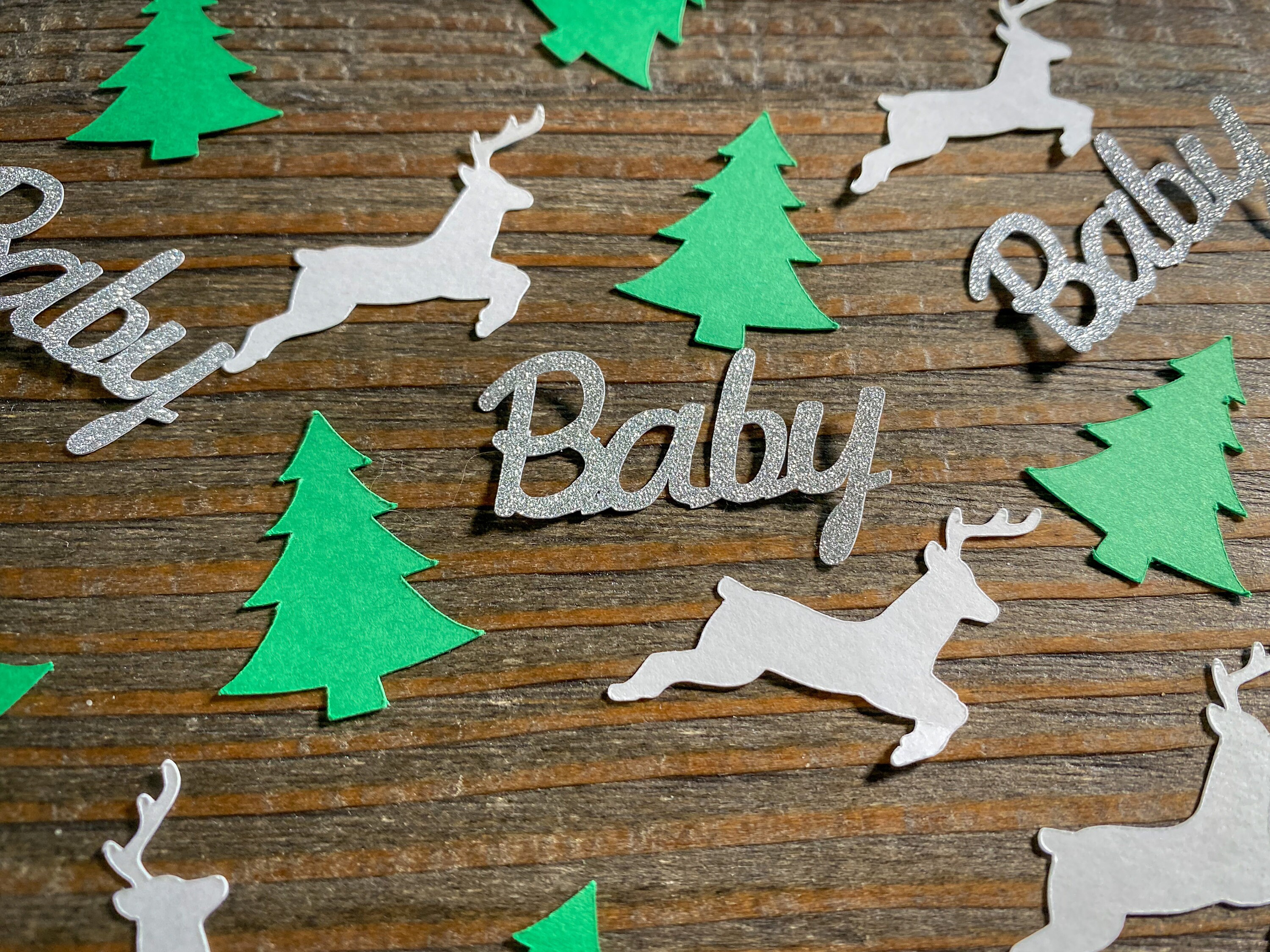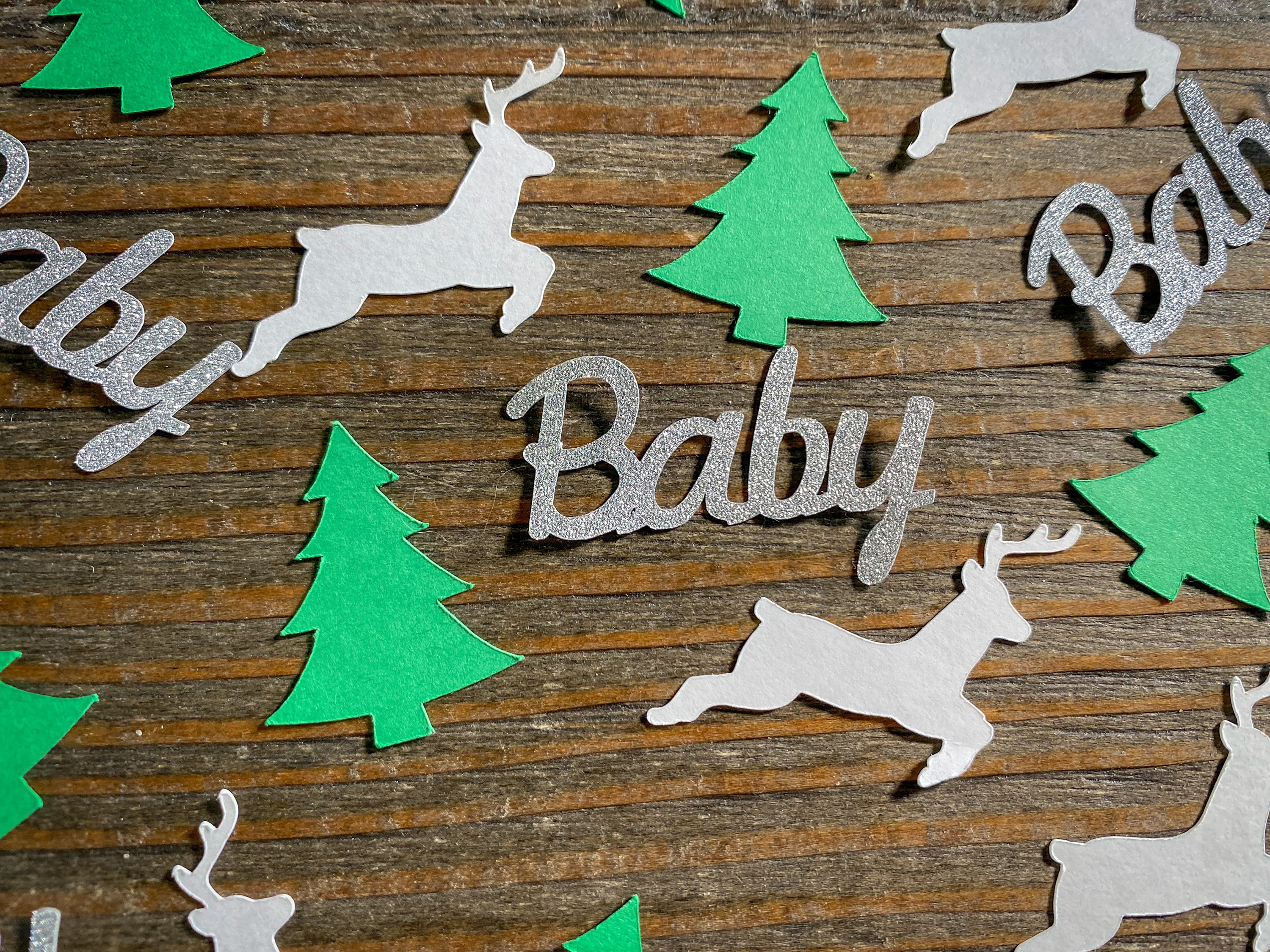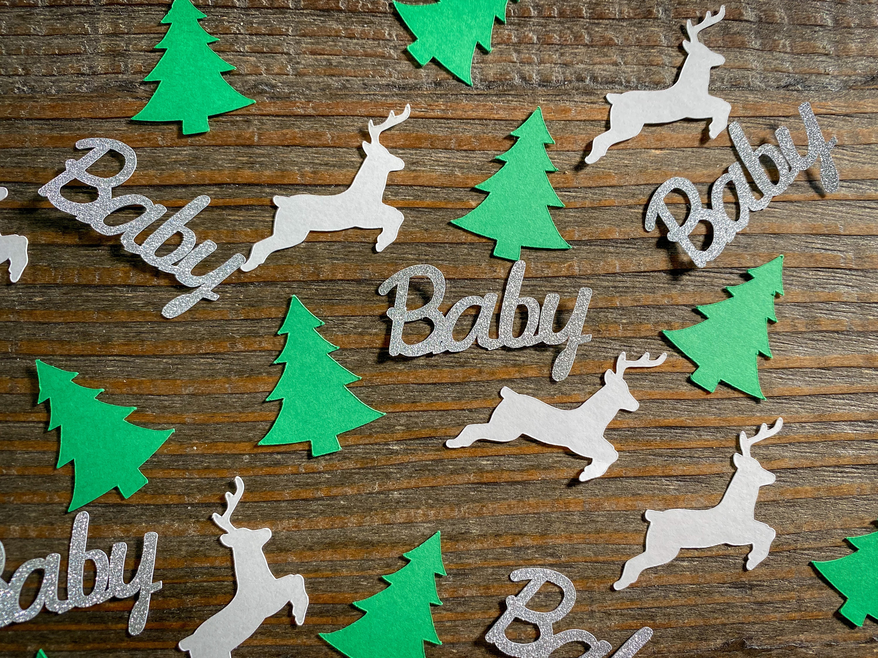 This listing is for 100 pieces of confetti. It includes 40 green trees, 40 white deer, and 20 silver baby pieces. The trees measure approximately 1.25 inches, the deer measure approximately 1.25 inches, and the baby measures approximately 1.5 inches. The glitter baby is white on the reverse side.