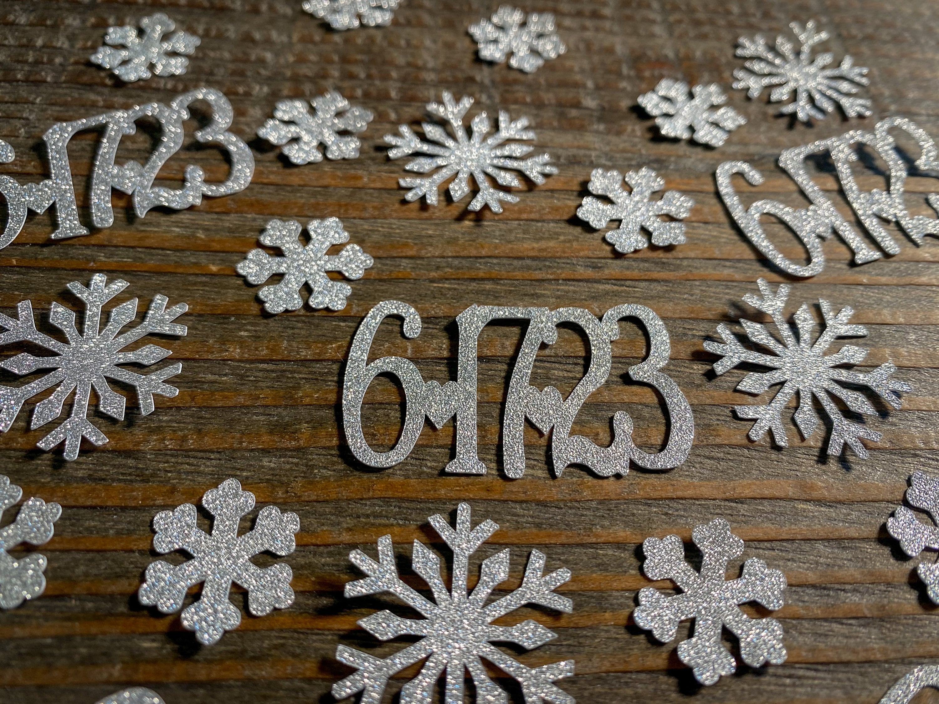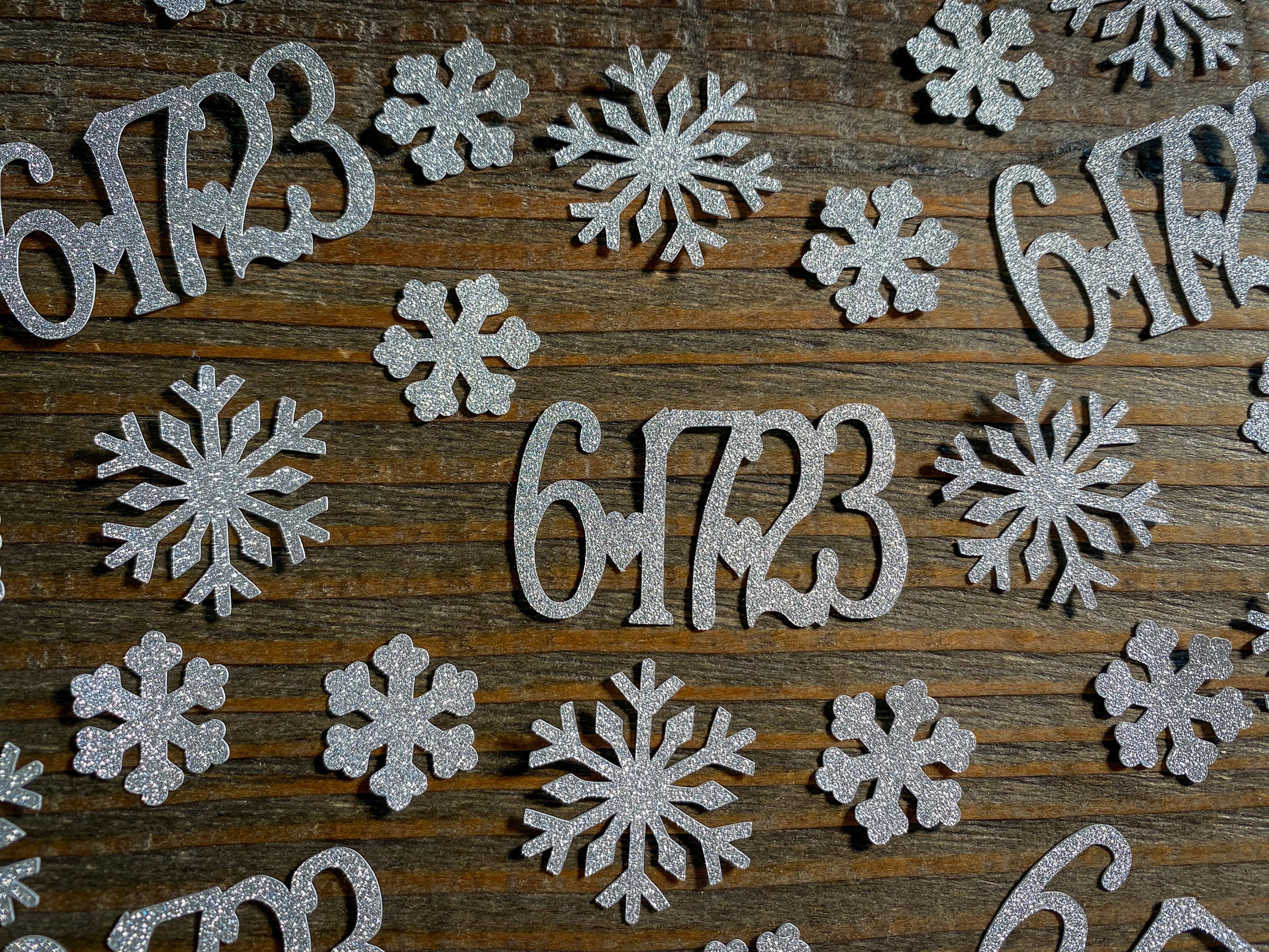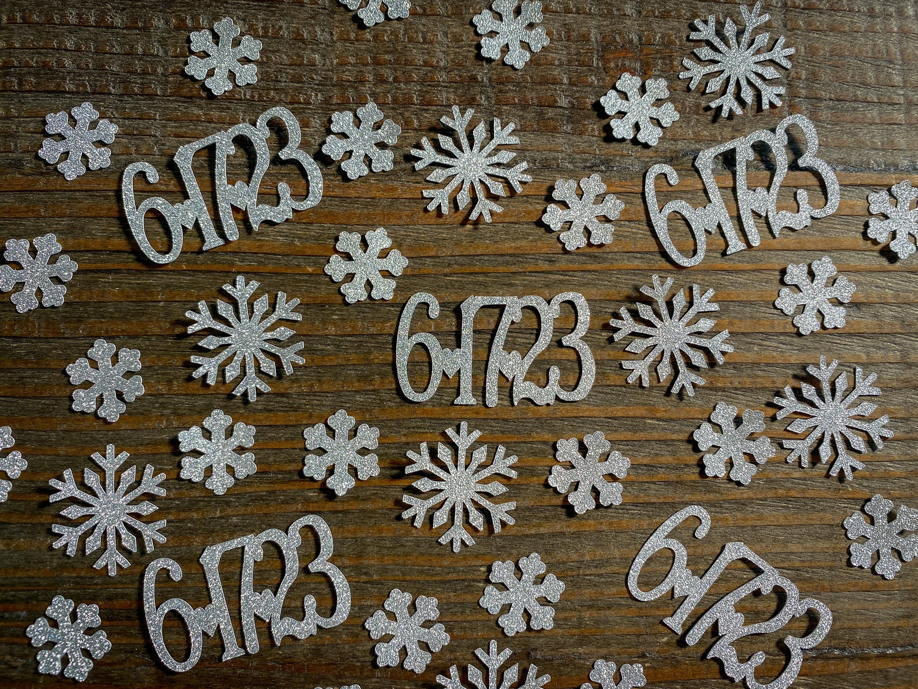 This listing is for 75 pieces of confetti! It includes 25 silver dates, 25 small silver snowflakes, and 25 large silver snowflakes. The dates measure approximately 1 inch in height and length varies depending on date, the small snowflakes measure approximately .75 inches, and the large snowflakes measure 1.25 inches. The glitter confetti is white on the reverse side.