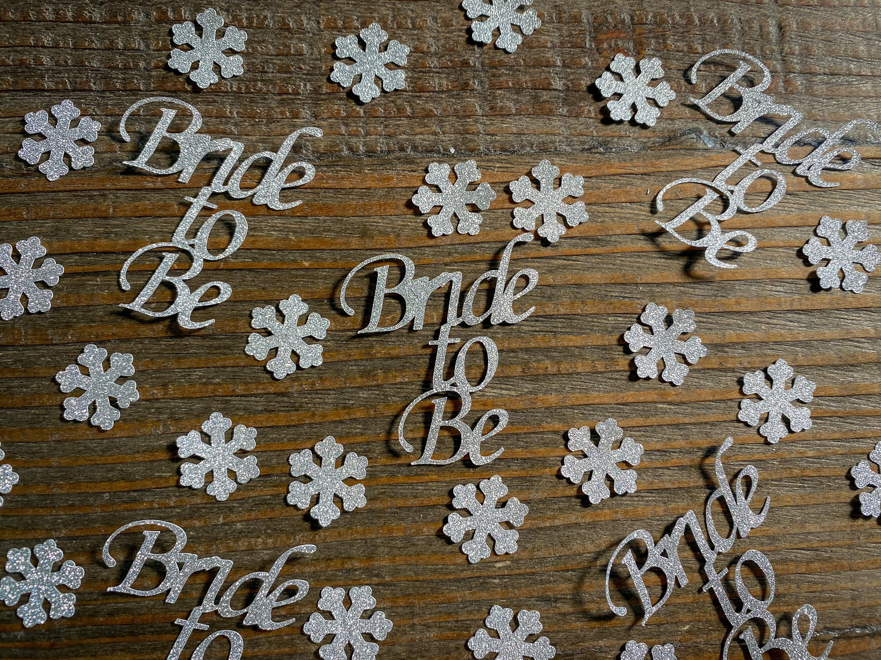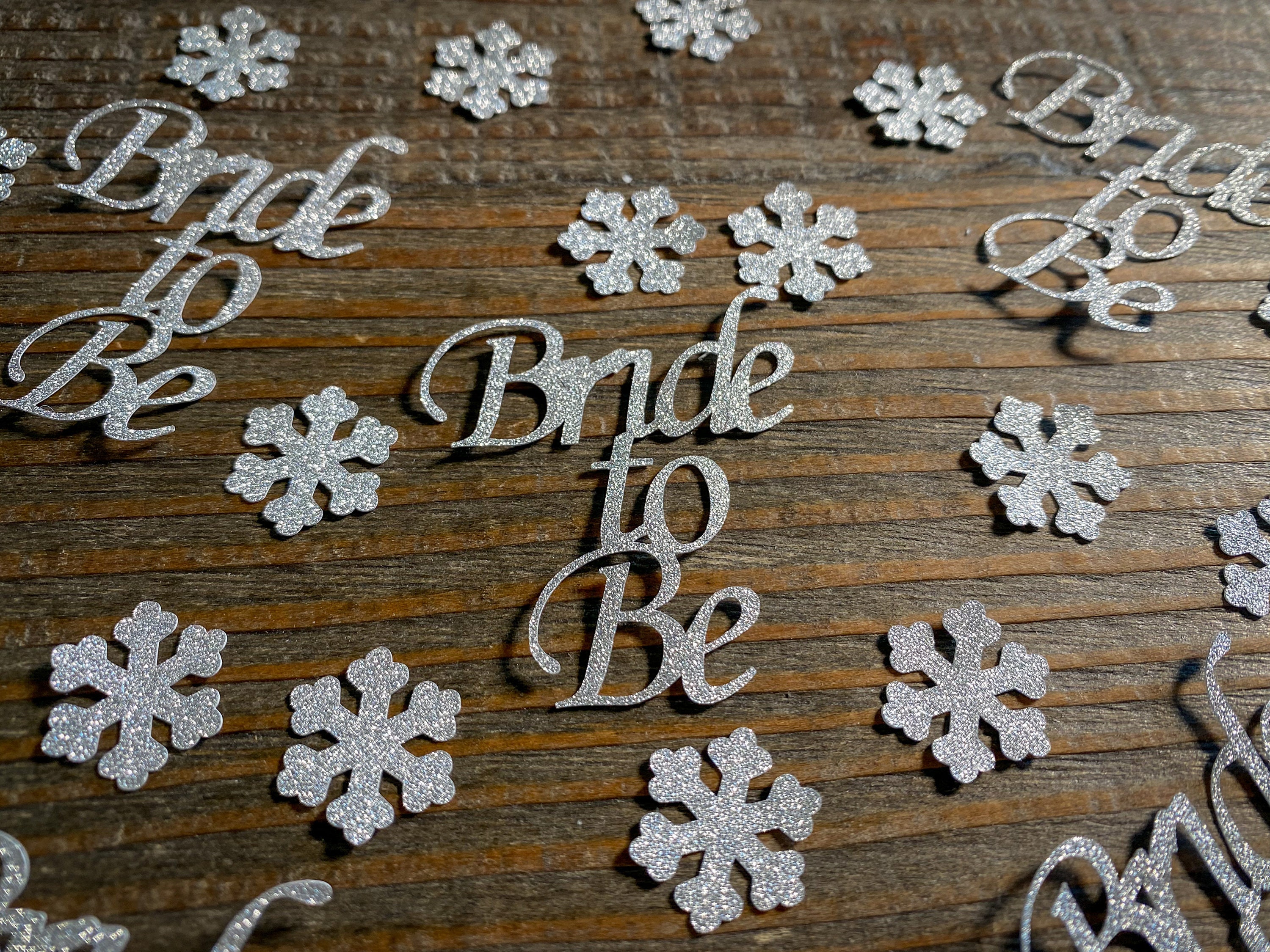 This listing is for 75 pieces of confetti! It includes 20 silver bride to be pieces and 55 small silver snowflake pieces. The bride to be pieces measure approximately 1.75 inches in length and height and the snowflakes measure .75 inches. The glitter confetti is white on the reverse side.