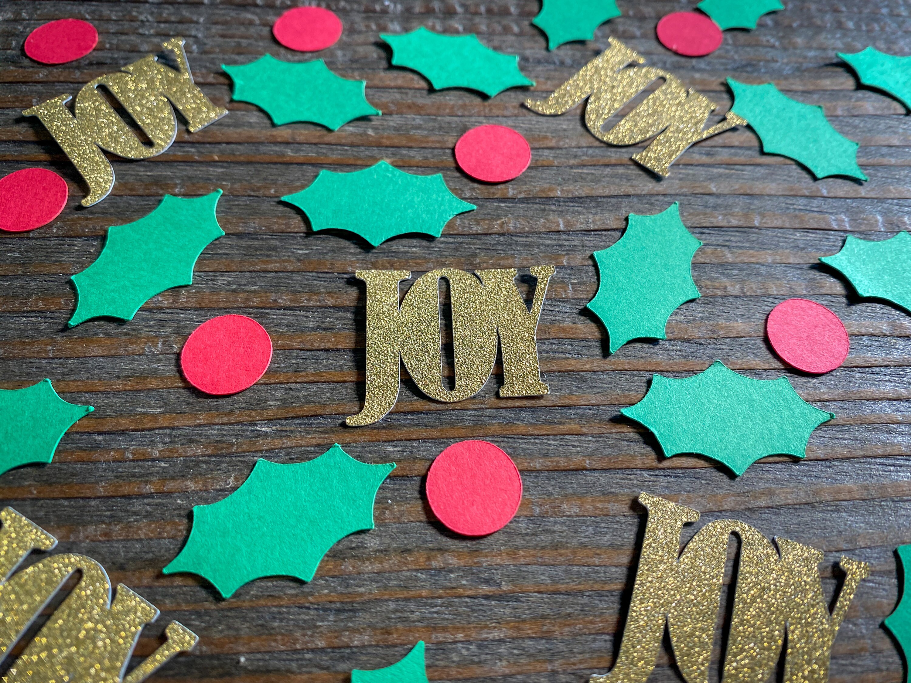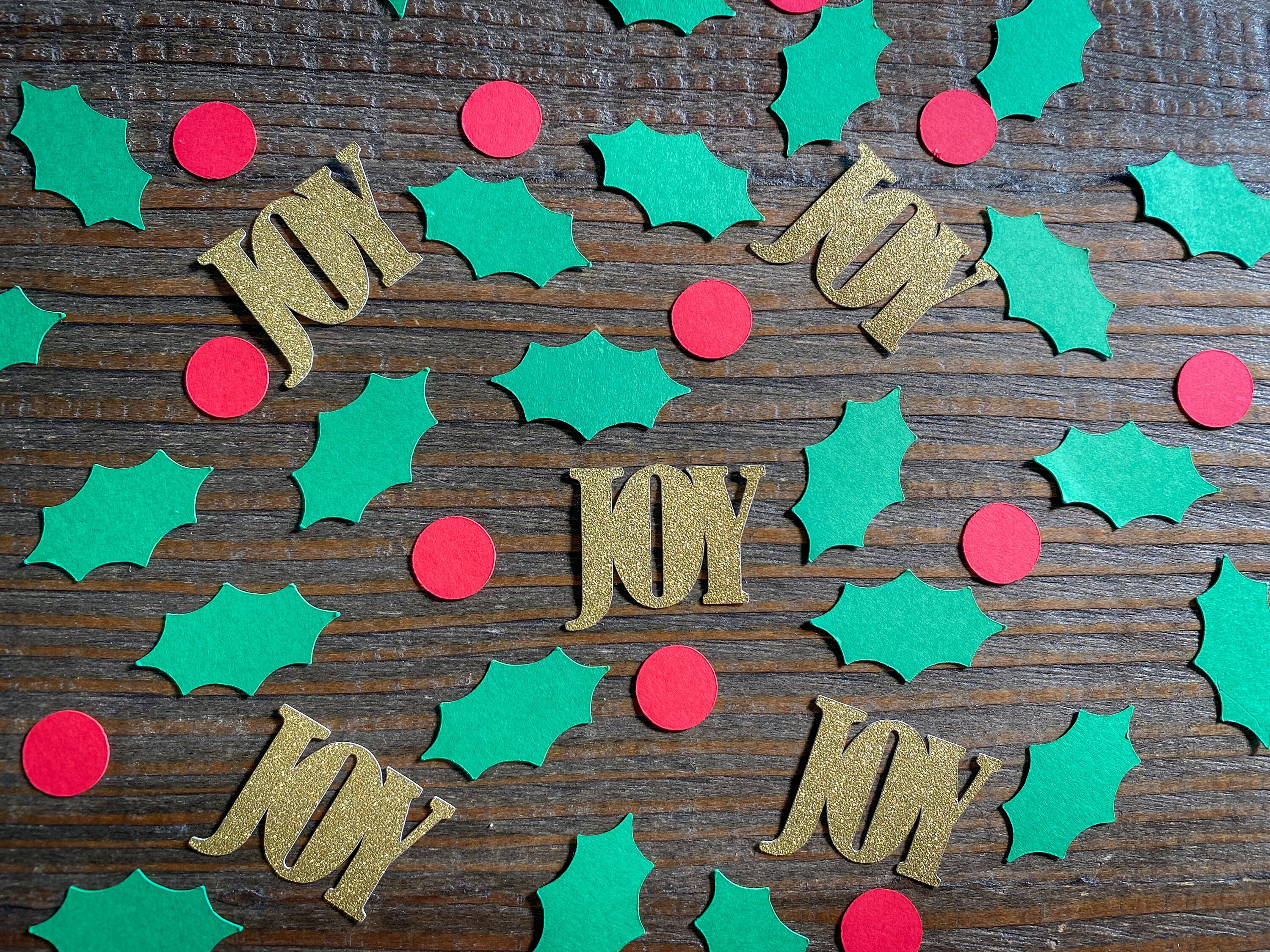 This listing is for 100 pieces of confetti. It includes 50 green holly leaves that measure 1.25 inches in length, 30 red berries that measure .5 inches in diameter and 20 pieces of gold joy that measure 1.25 inches. The gold confetti is white on the reverse side.