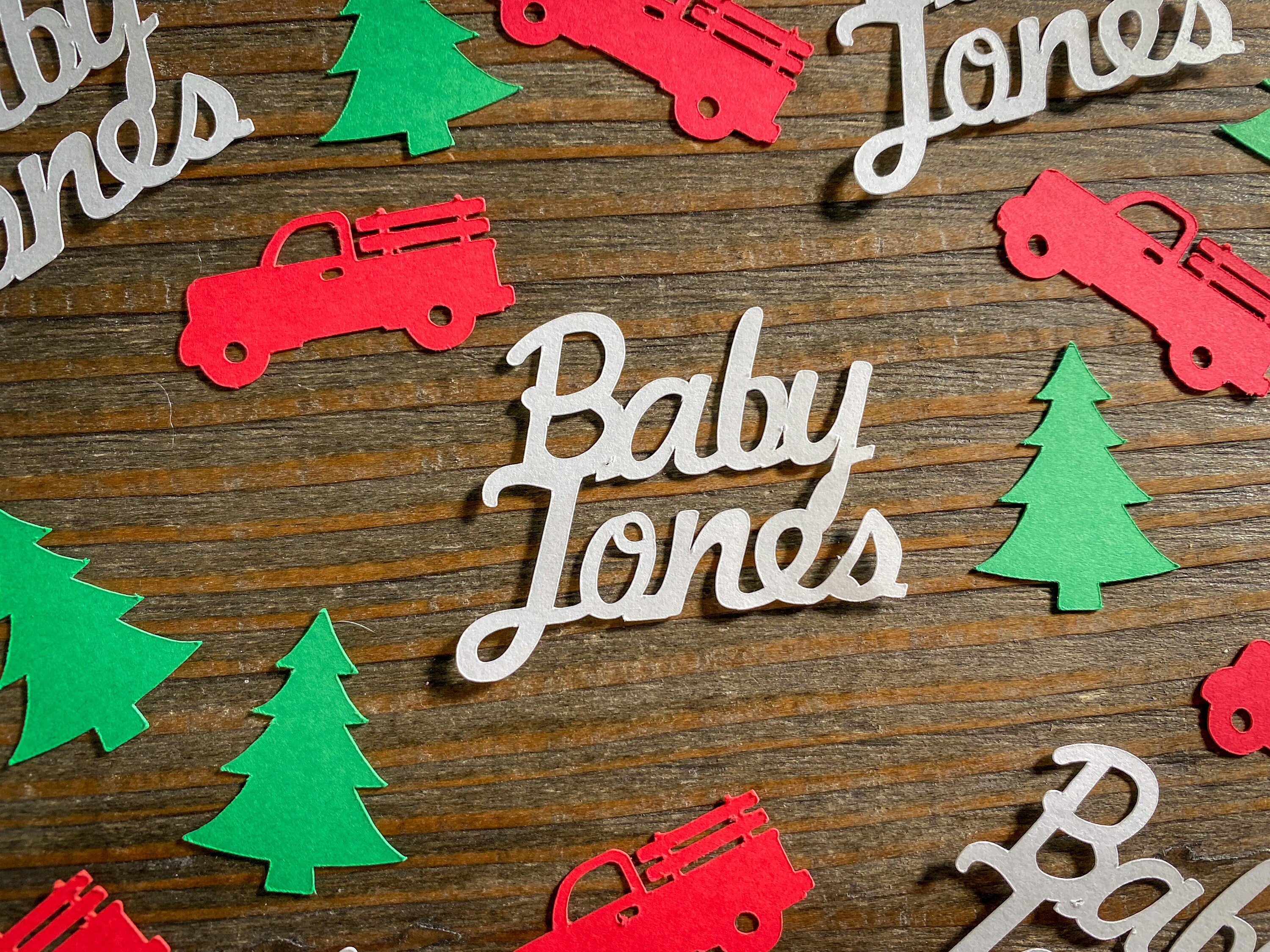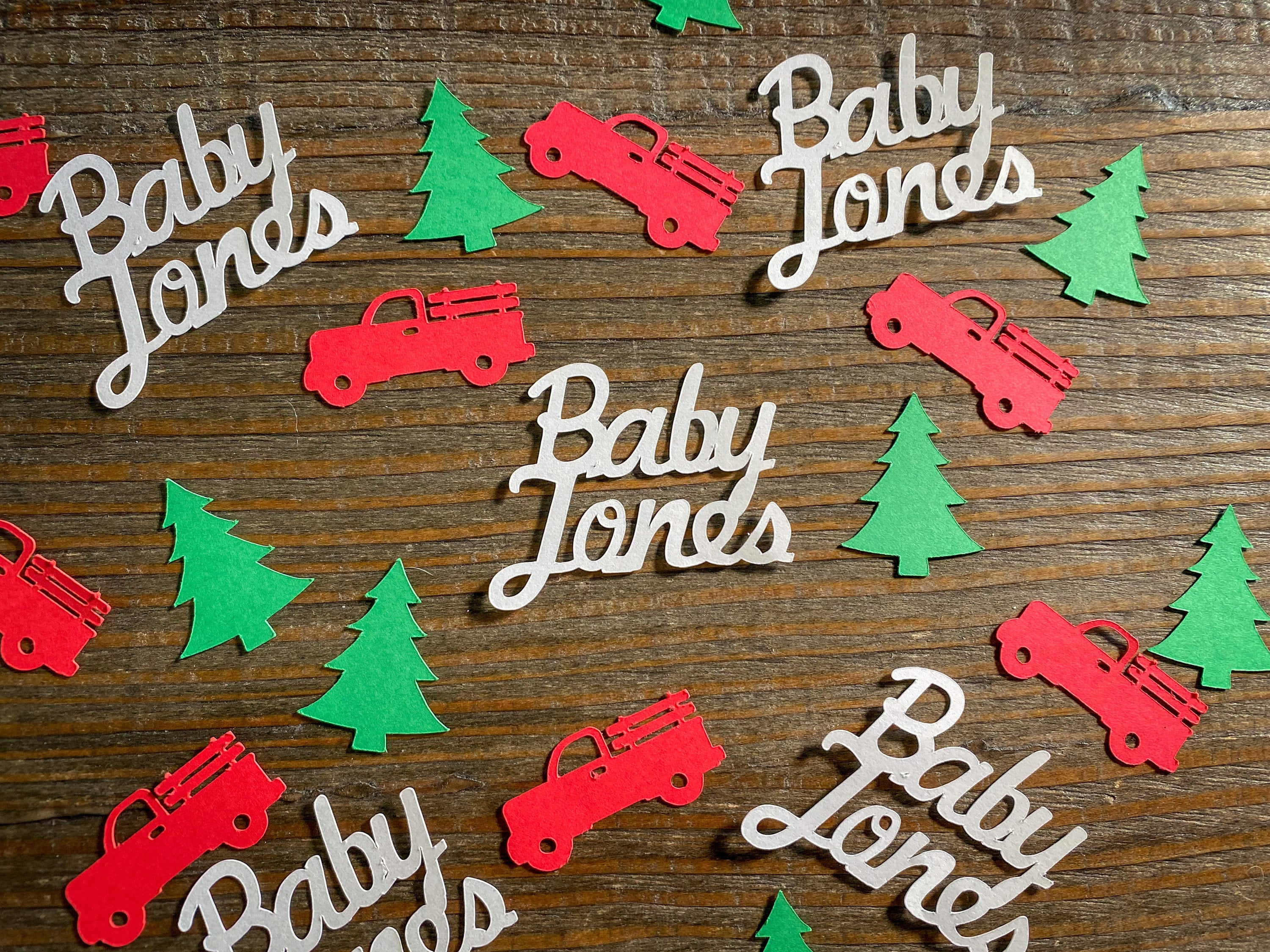 This listing is for 100 pieces of confetti. It includes 40 red trucks, 40 green Christmas trees, and 20 white baby pieces. The trucks measure approximately 1.5 inches in length, the trees measure approximately 1.25 inches, and the baby measure 1.5inches in width. The baby pieces are white on the reverse side.