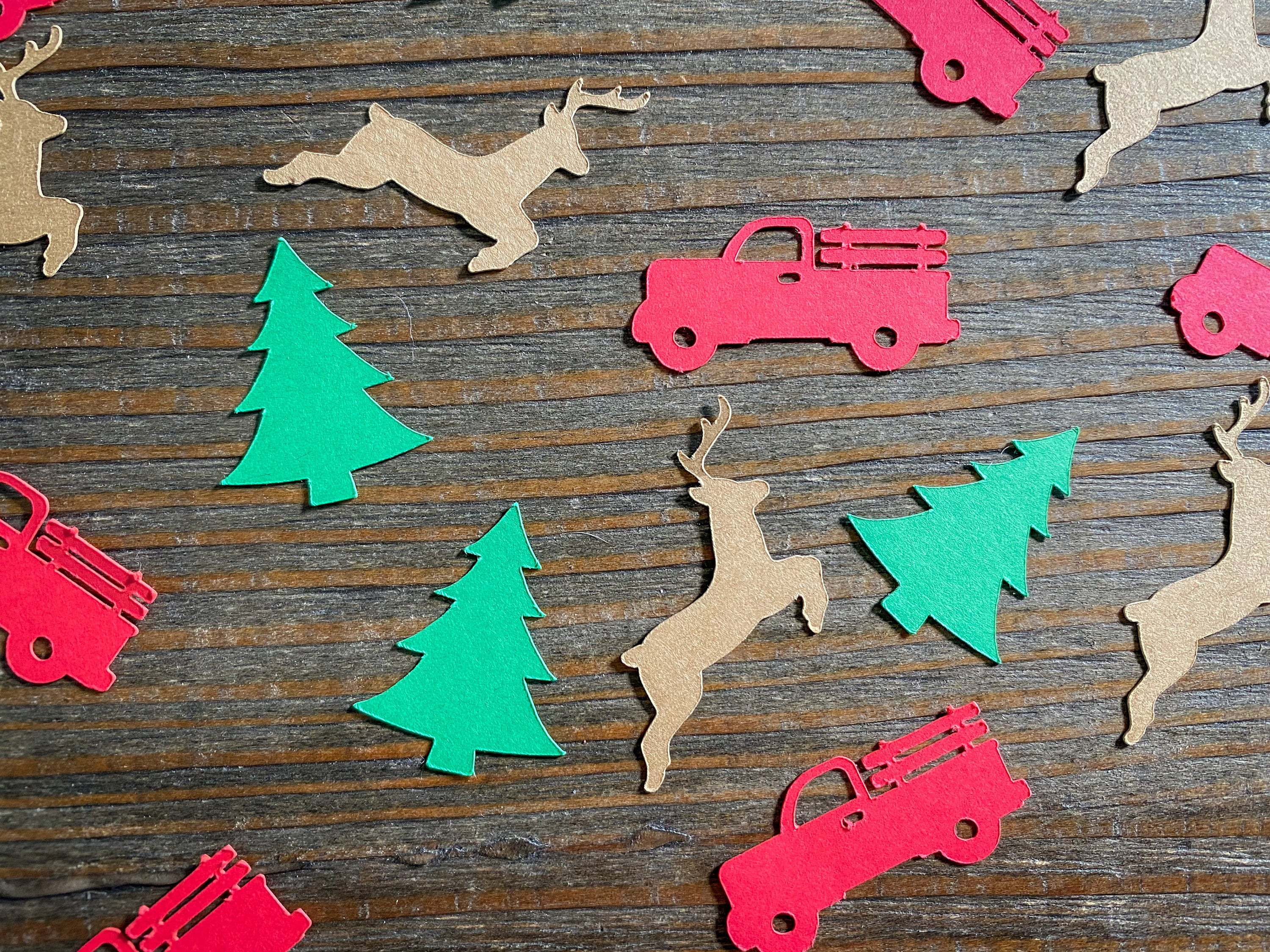 This listing is for 100 pieces of confetti. It includes 35 red trucks, 35 green Christmas trees, and 30 brown reindeer. The trucks measure approximately 1.5 inches in length, the trees measure approximately 1.25 inches, and the reindeer measure 1.25 inches in width.
