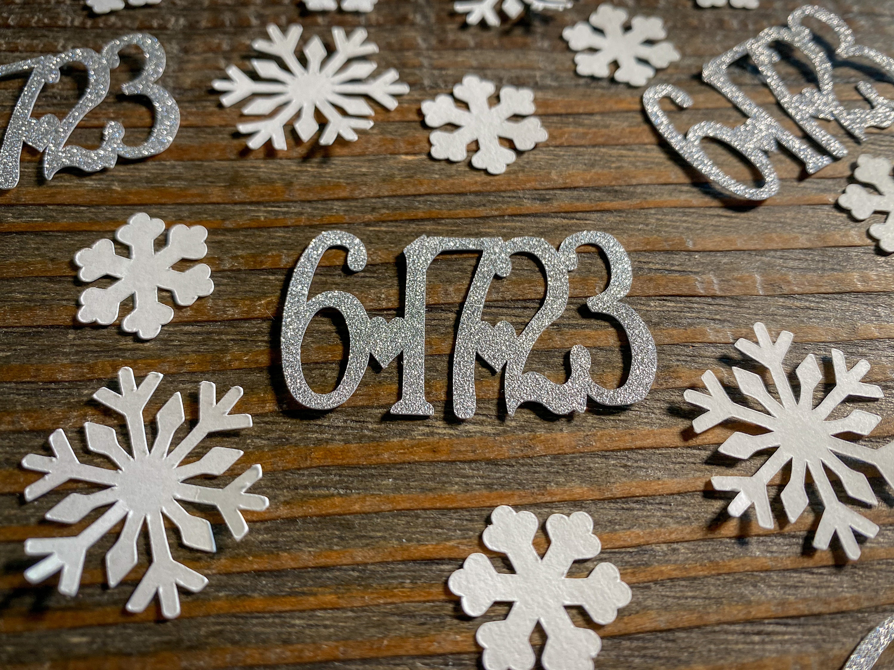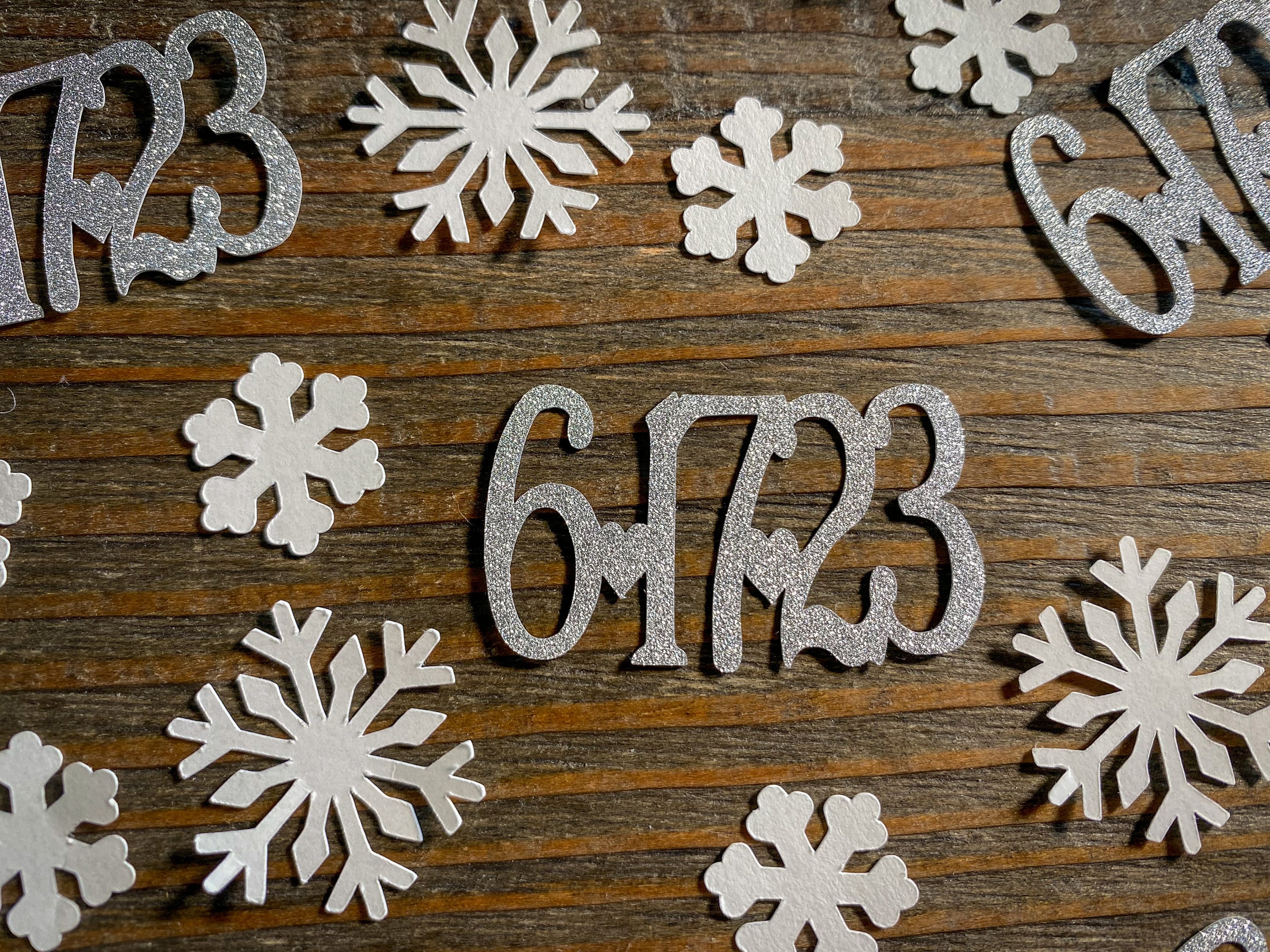 This listing is for 75 pieces of confetti! It includes 25 silver dates, 25 small white snowflakes, and large white snowflakes. The dates measure approximately 1 inch in height and length varies depending on date, the small snow flakes measure .75 inches, and the large snowflakes measure 1.25 inches. The glitter confetti is white on the reverse side.