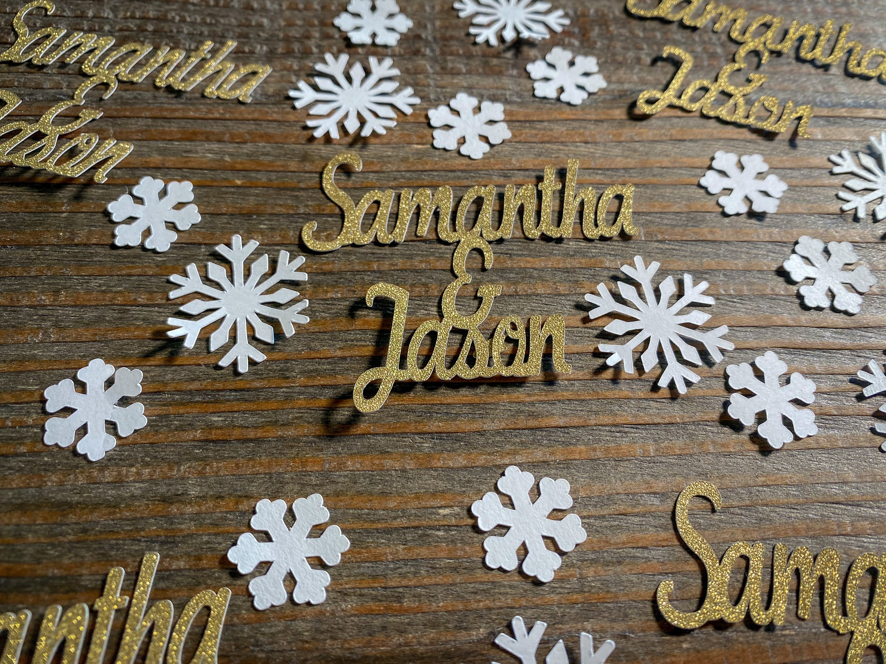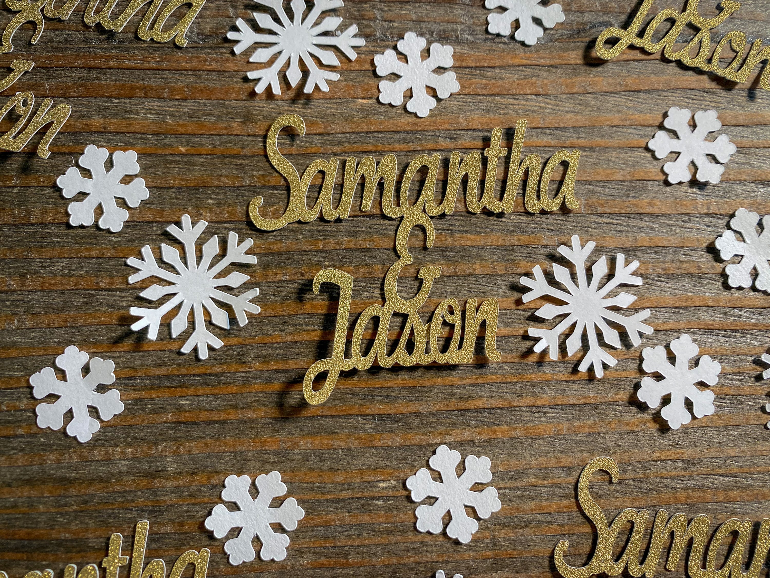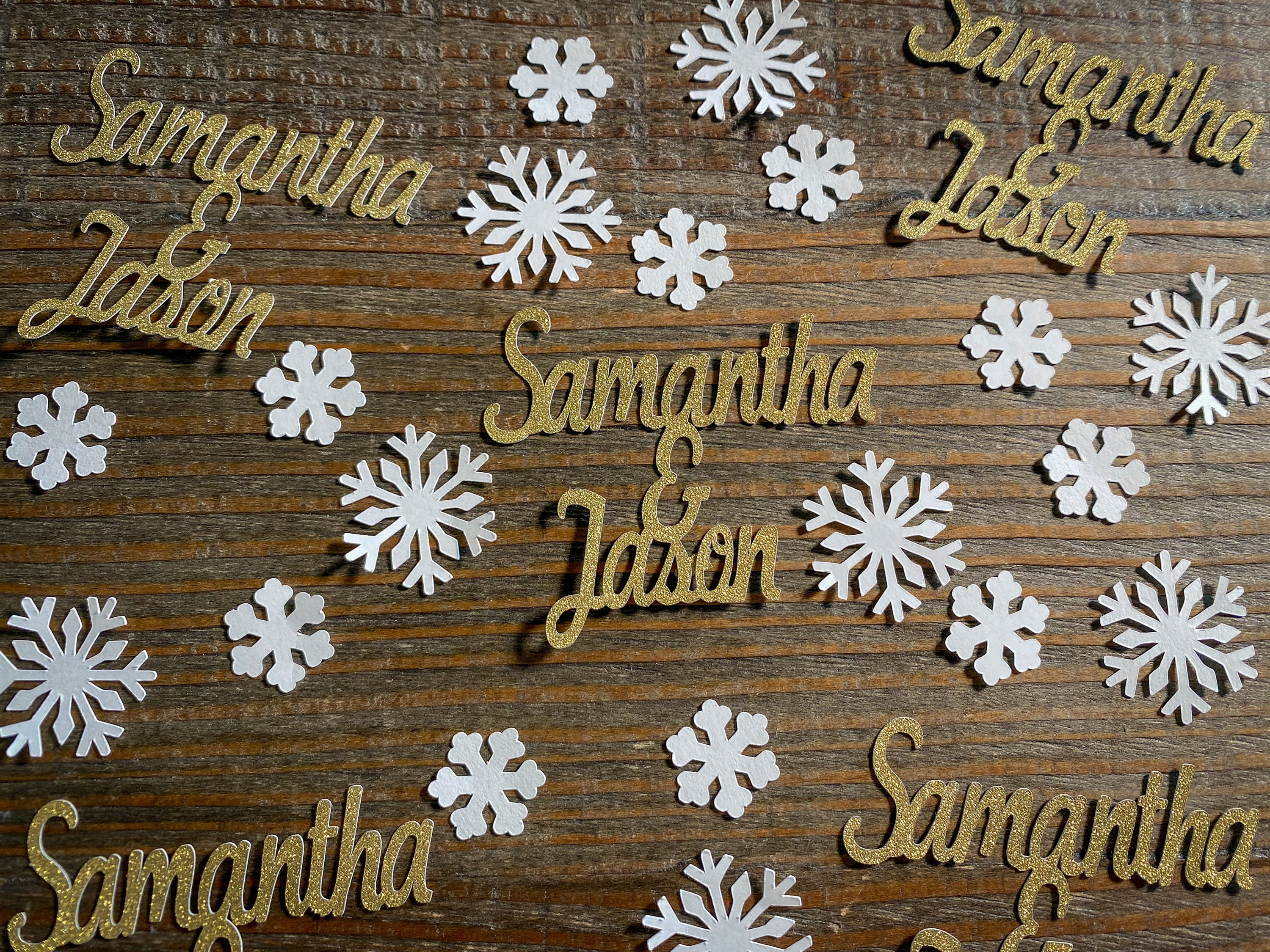 This listing is for 75 pieces of confetti! It includes 15 gold couple names, 30 small white snowflakes, and 30 large white snowflakes. The dates measure approximately 2 inches in height and length varies depending on names, the small snow flakes measure .75 inches, and the large snowflakes measure 1.25 inches. The glitter confetti is white on the reverse side.
