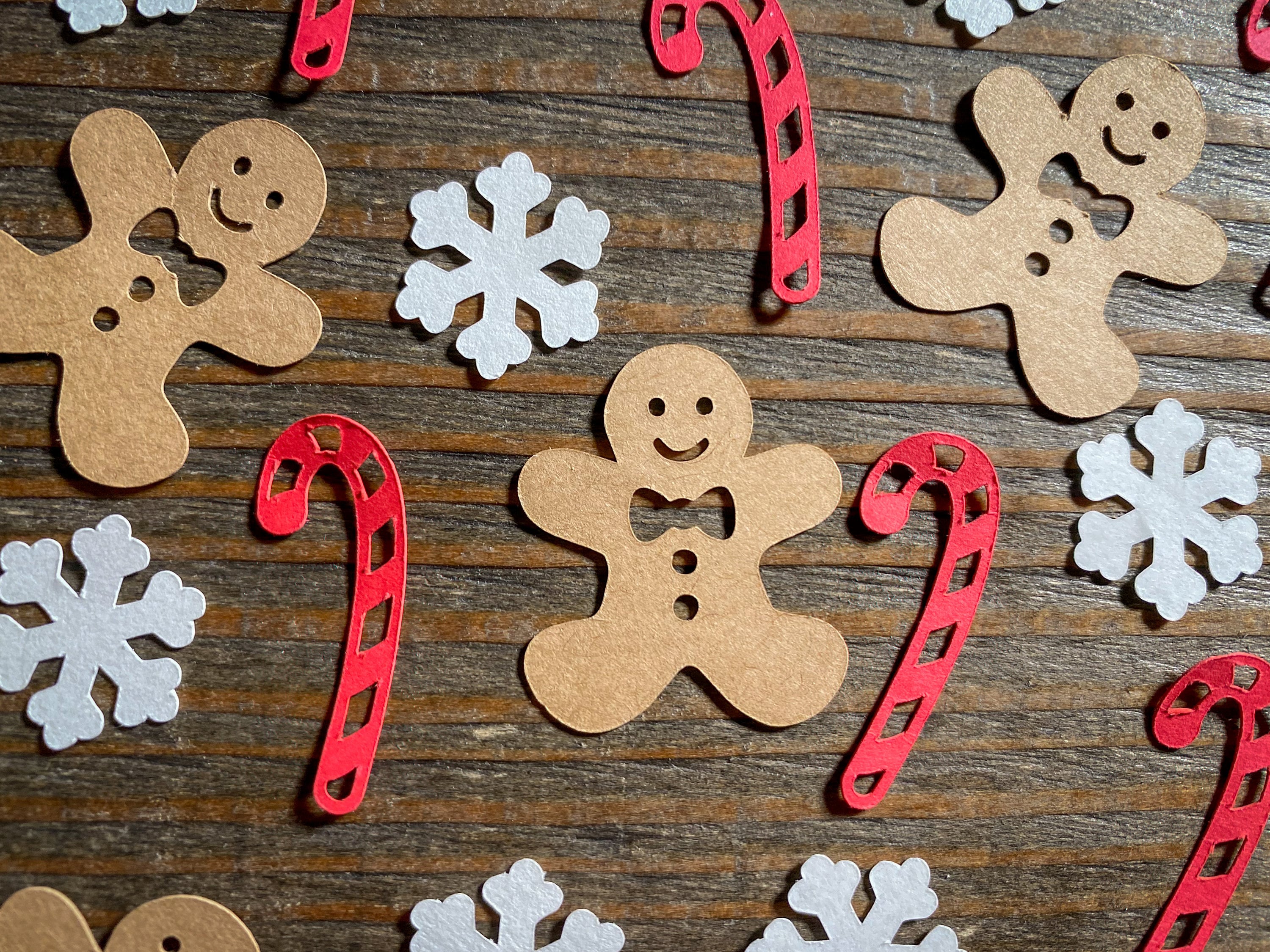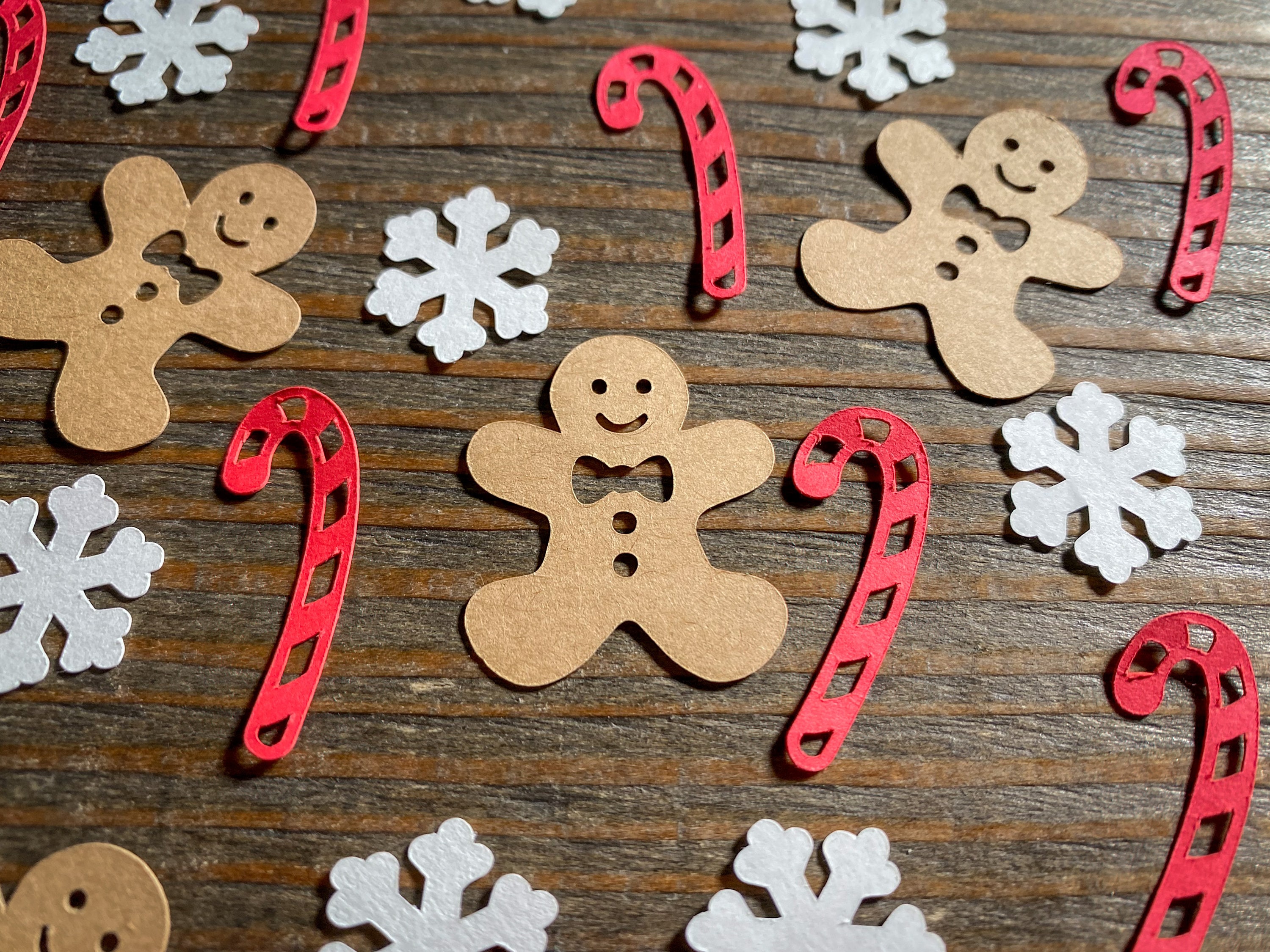 This listing is for 100 pieces of confetti. It includes 30 red candy canes, 30 gingerbread men, and 40 white snowflakes. The candy canes measure approximately 1.25 inches in length, the gingerbread men measure approximately 1.25 inches, and the snowflakes measure .75 inches in width. If choosing glitter snowflakes they are white on the reverse side.