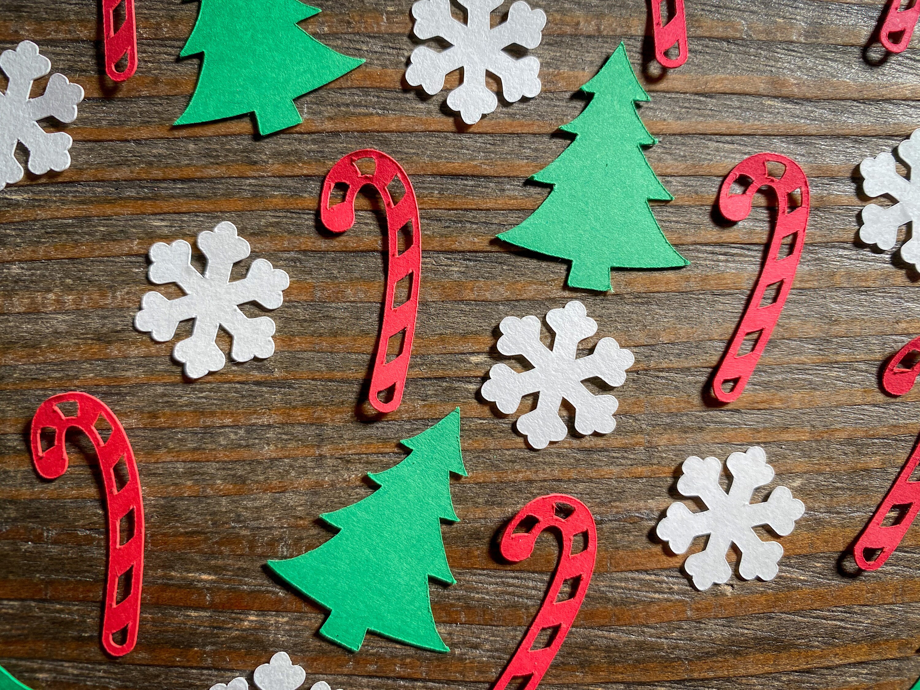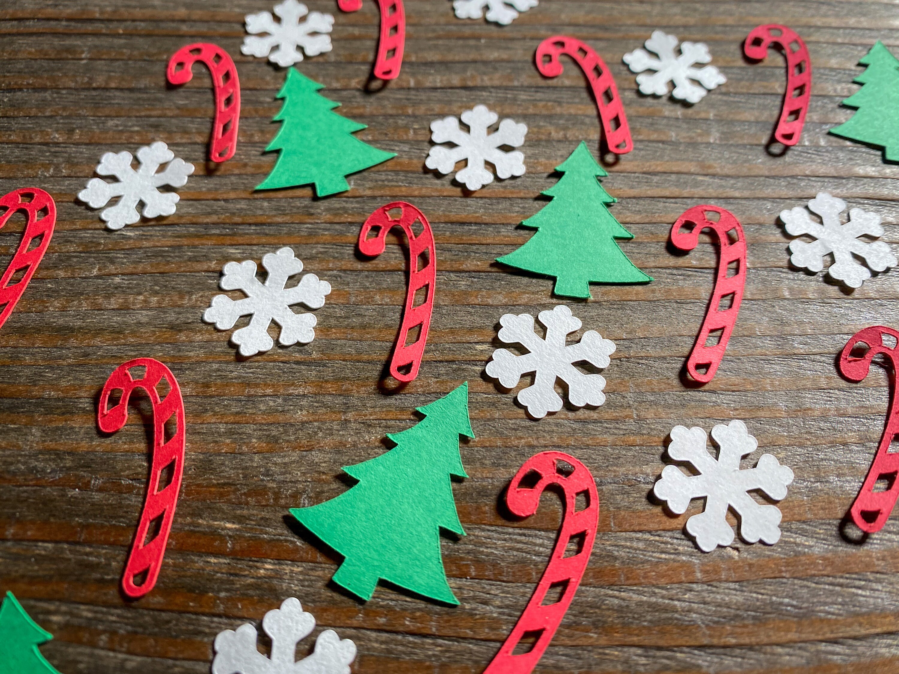 This listing is for 100 pieces of confetti. It includes 30 red candy canes, 30 trees, and 40 white snowflakes. The candy canes measure approximately 1.25 inches in length, the trees measure approximately 1.25 inches, and the snowflakes measure .75 inches in width. If choosing glitter snowflakes they are white on the reverse side.