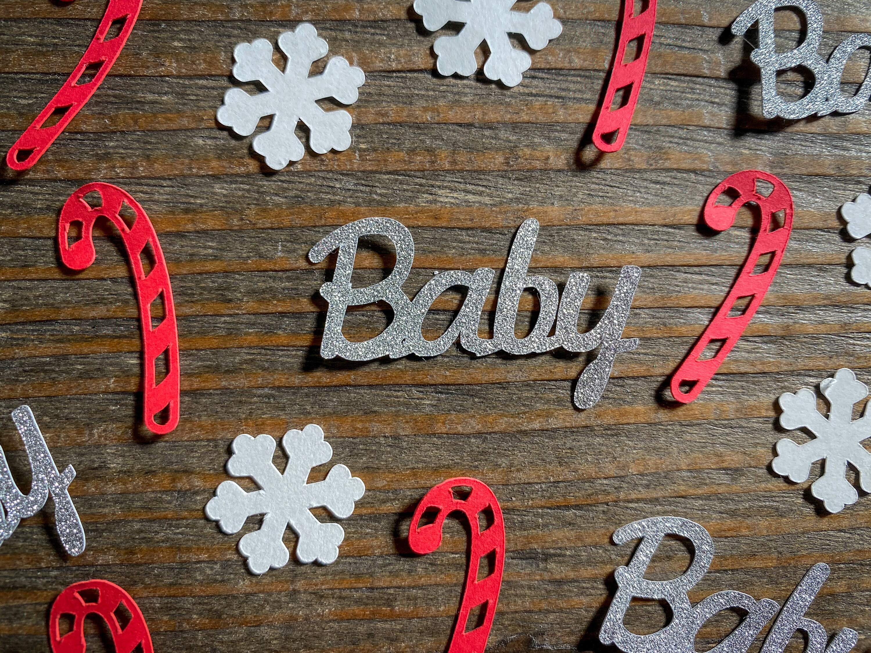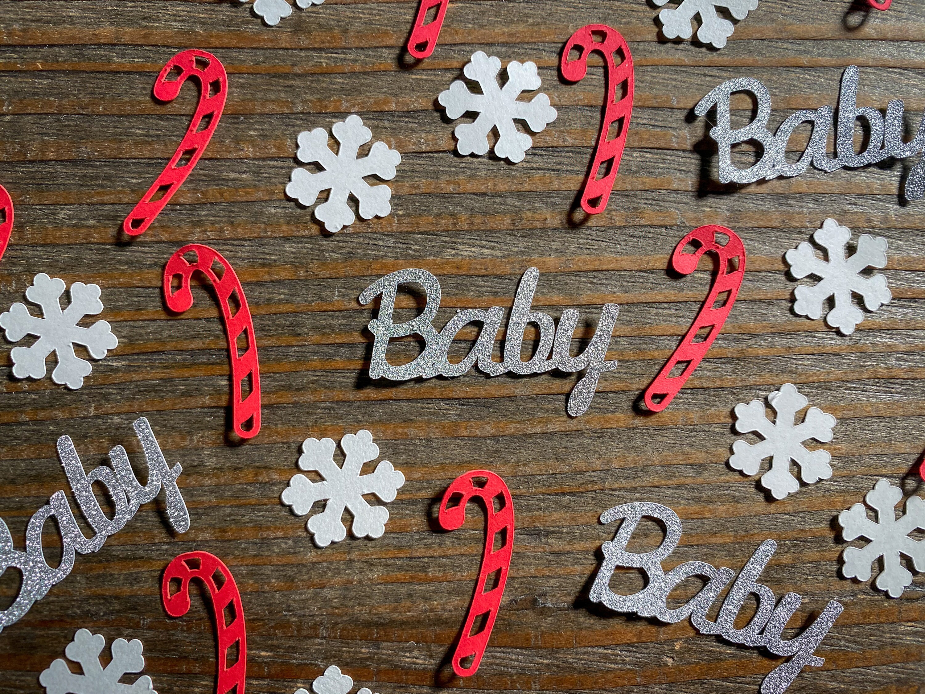 This listing is for 100 pieces of confetti. It includes 40 red candy canes, 40 white snowflakes, and 20 silver baby. The candy canes measure approximately 1.25 inches, the snowflakes measure approximately .75 inches, and the baby measures approximately 1.5 inches. The glitter baby is white on the reverse side.