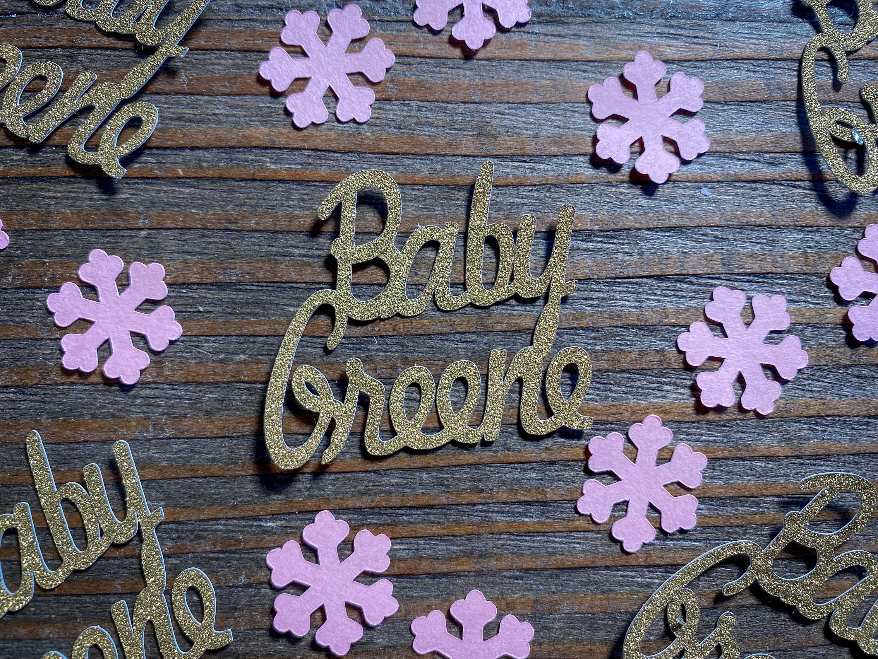This listing is for 100 pieces of confetti. It includes 80 small pink snowflakes and 20 gold baby name pieces. The snowflakes measure approximately .75 inches. The glitter names are white on the reverse side.