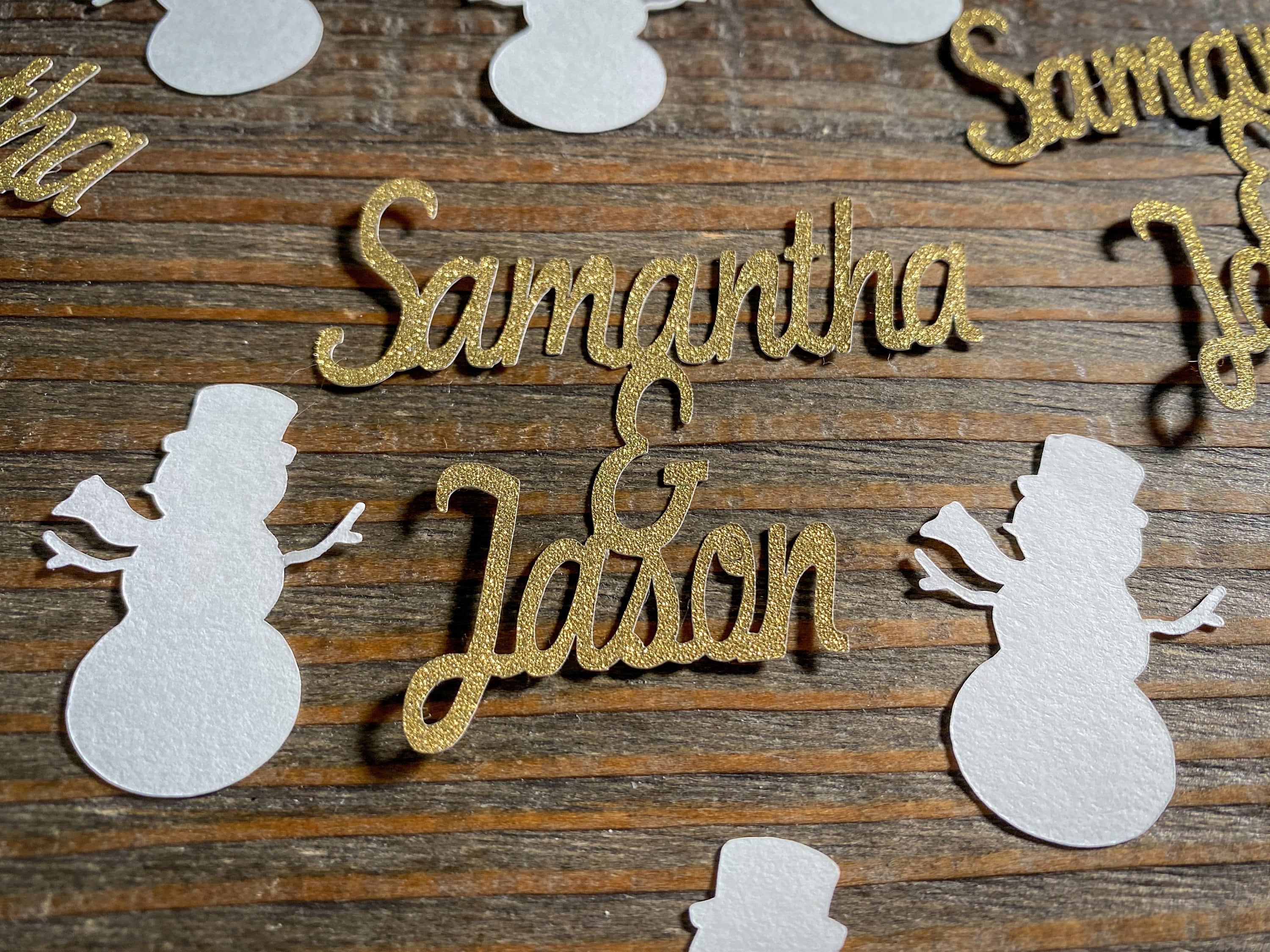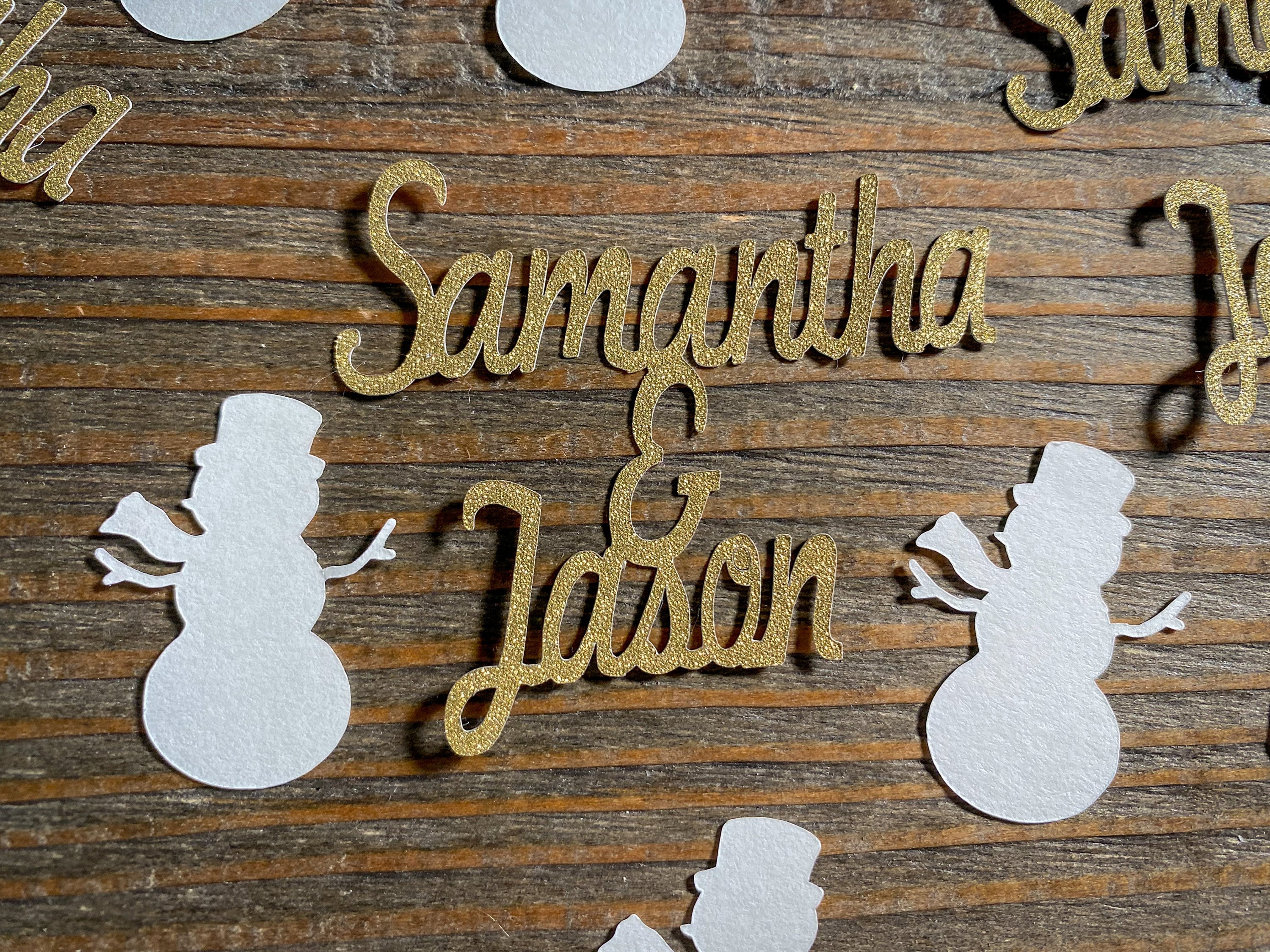 This listing is for 75 pieces of confetti! It includes 15 gold couple names and 60 small white snowmen. The names measure approximately 2 inches in height and length vary depending on names and the snowmen measure 1.25 inches. The glitter confetti is white on the reverse side.
