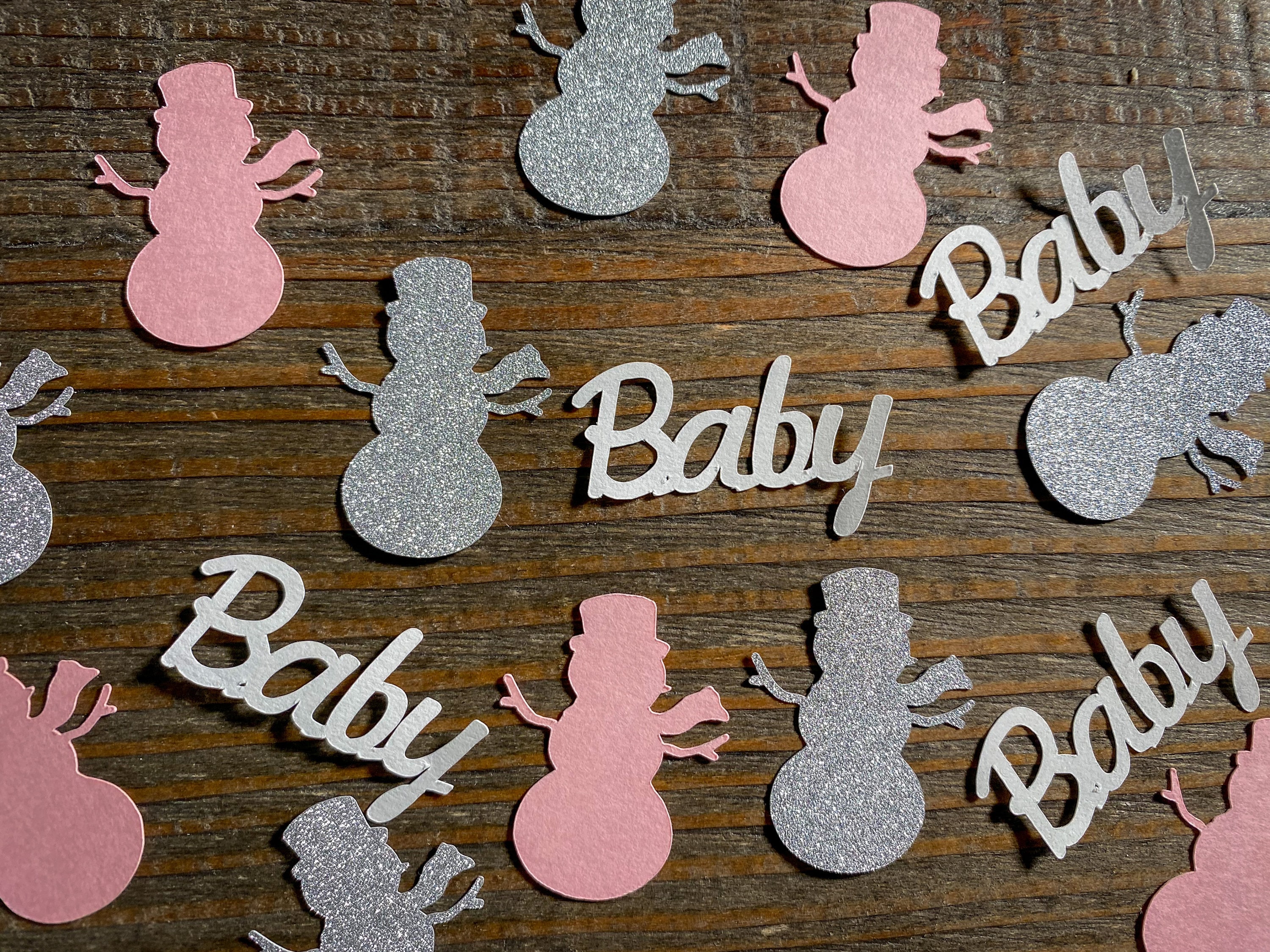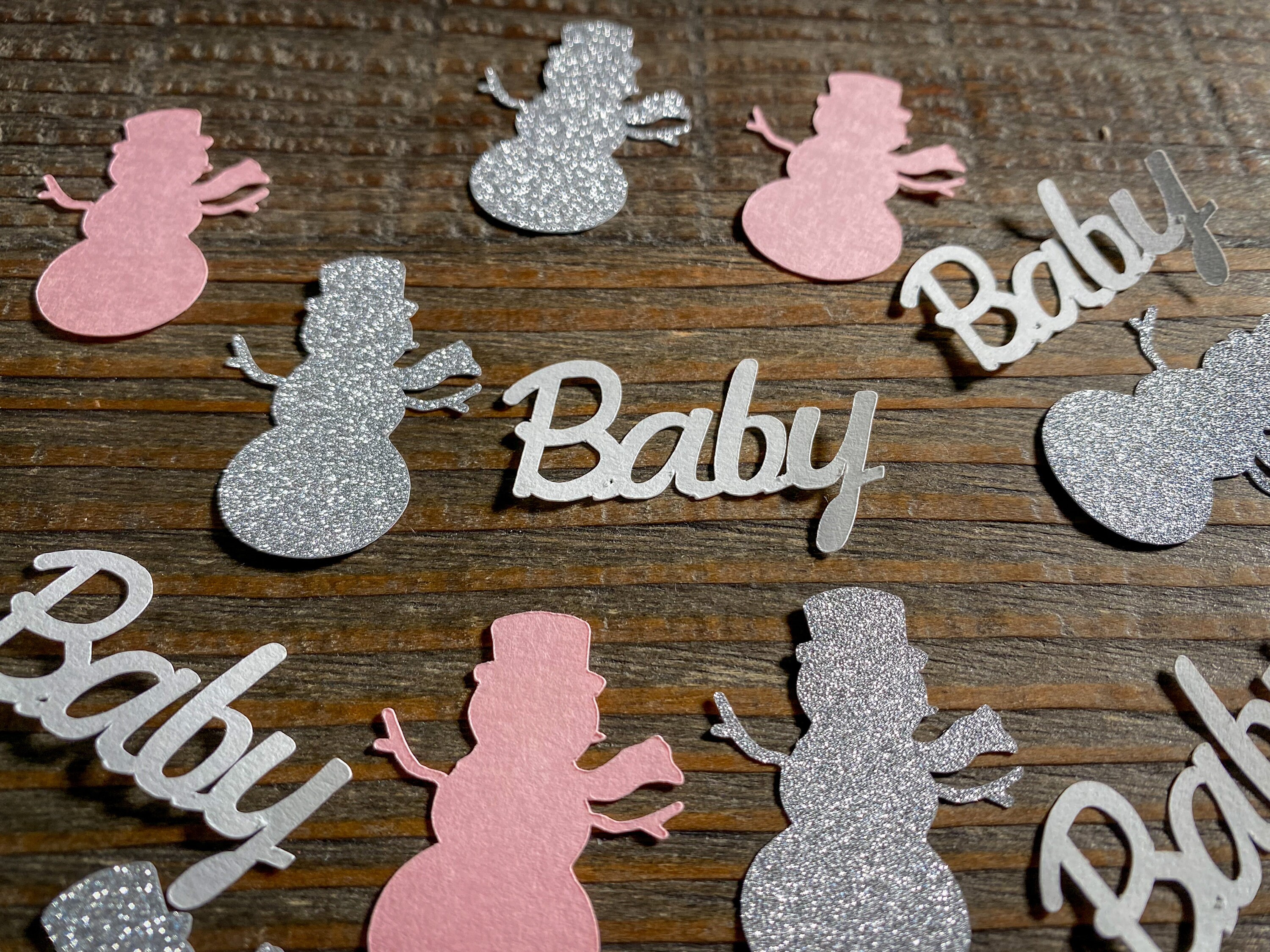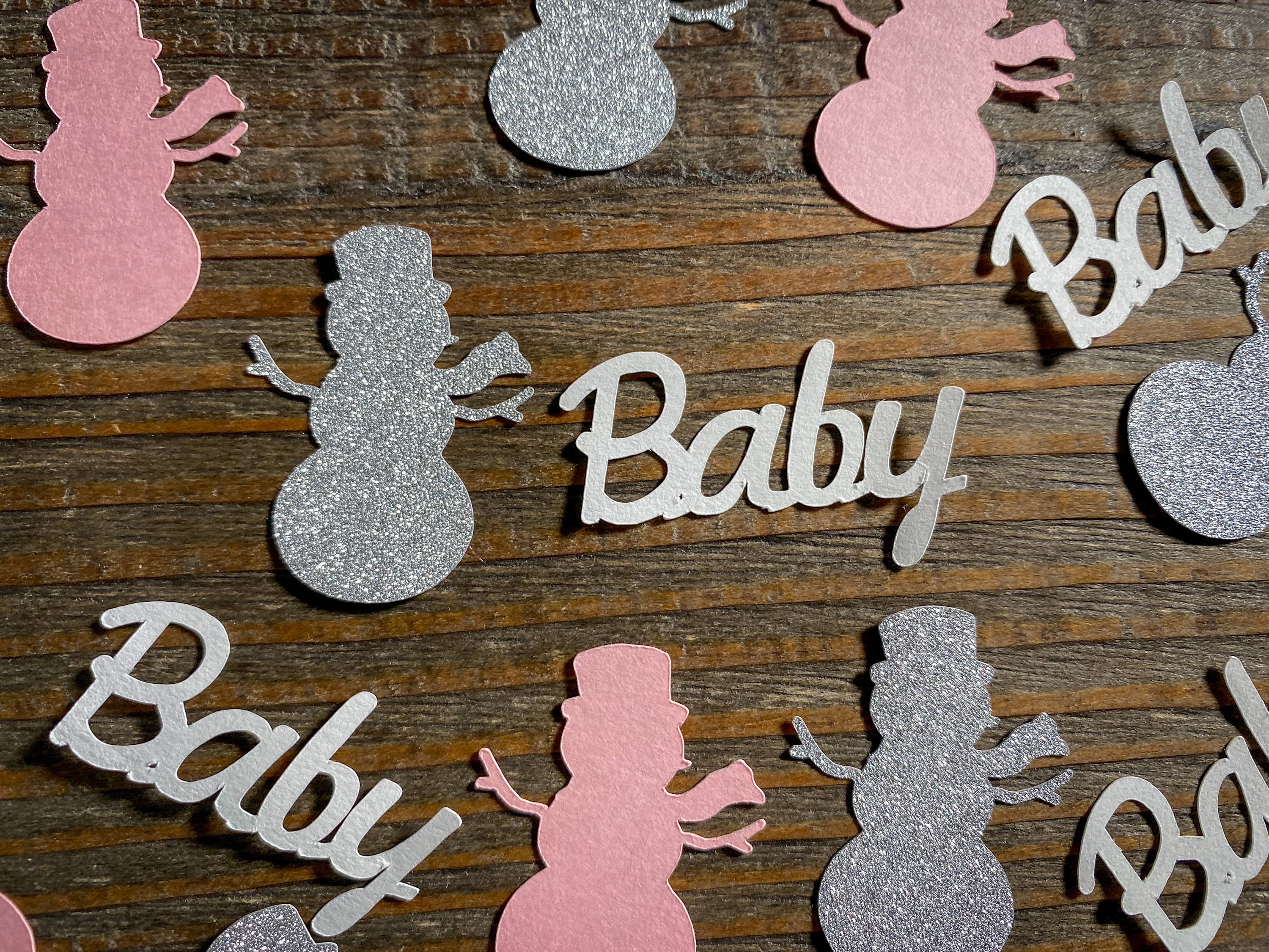 This listing is for 100 pieces of confetti! It includes 35 silver snowmen, 35 pink snowmen, and 30 white baby pieces. The snowmen measure approximately 1.25 inches and the snowflakes measure approximately .75 inches.