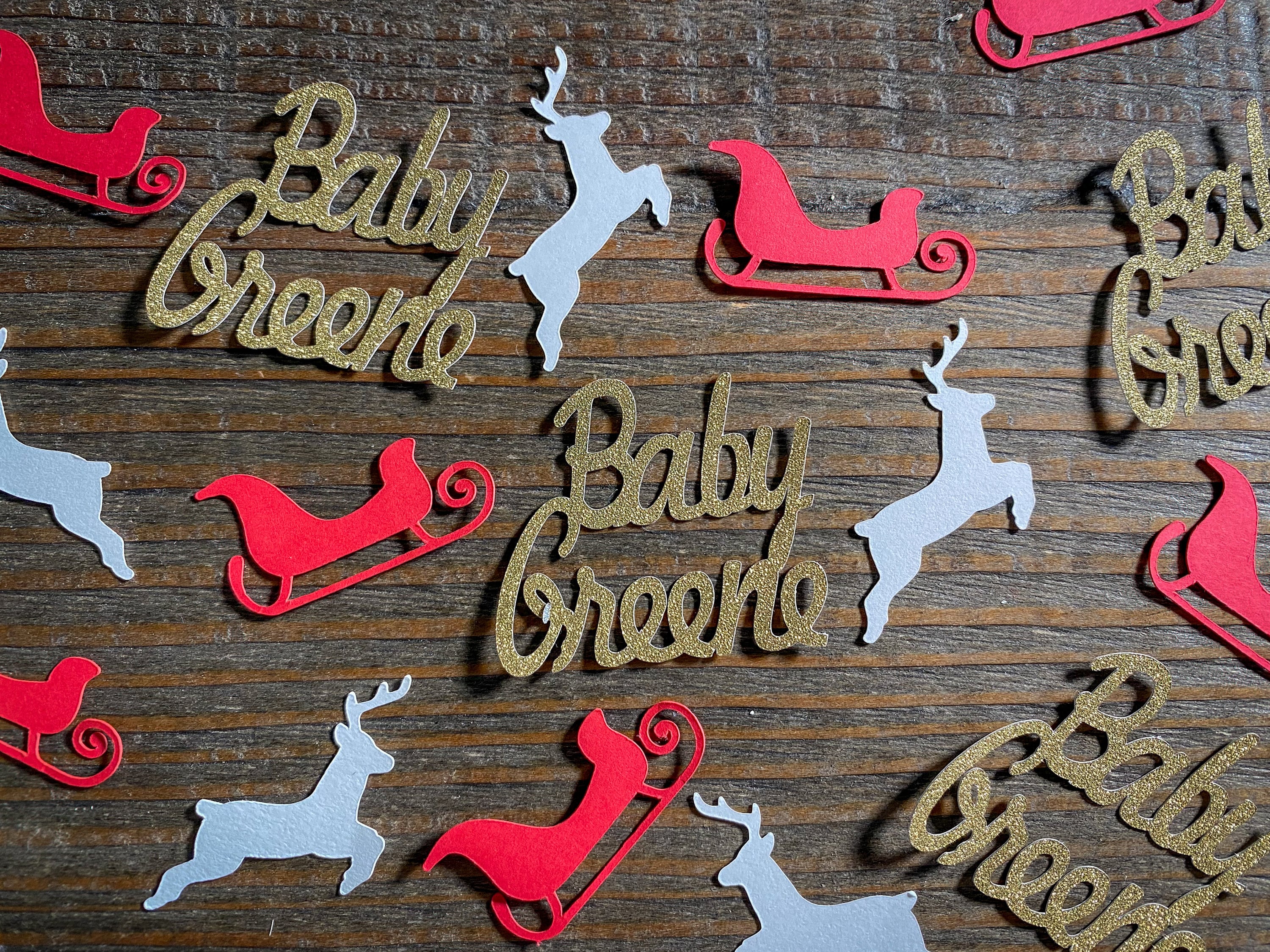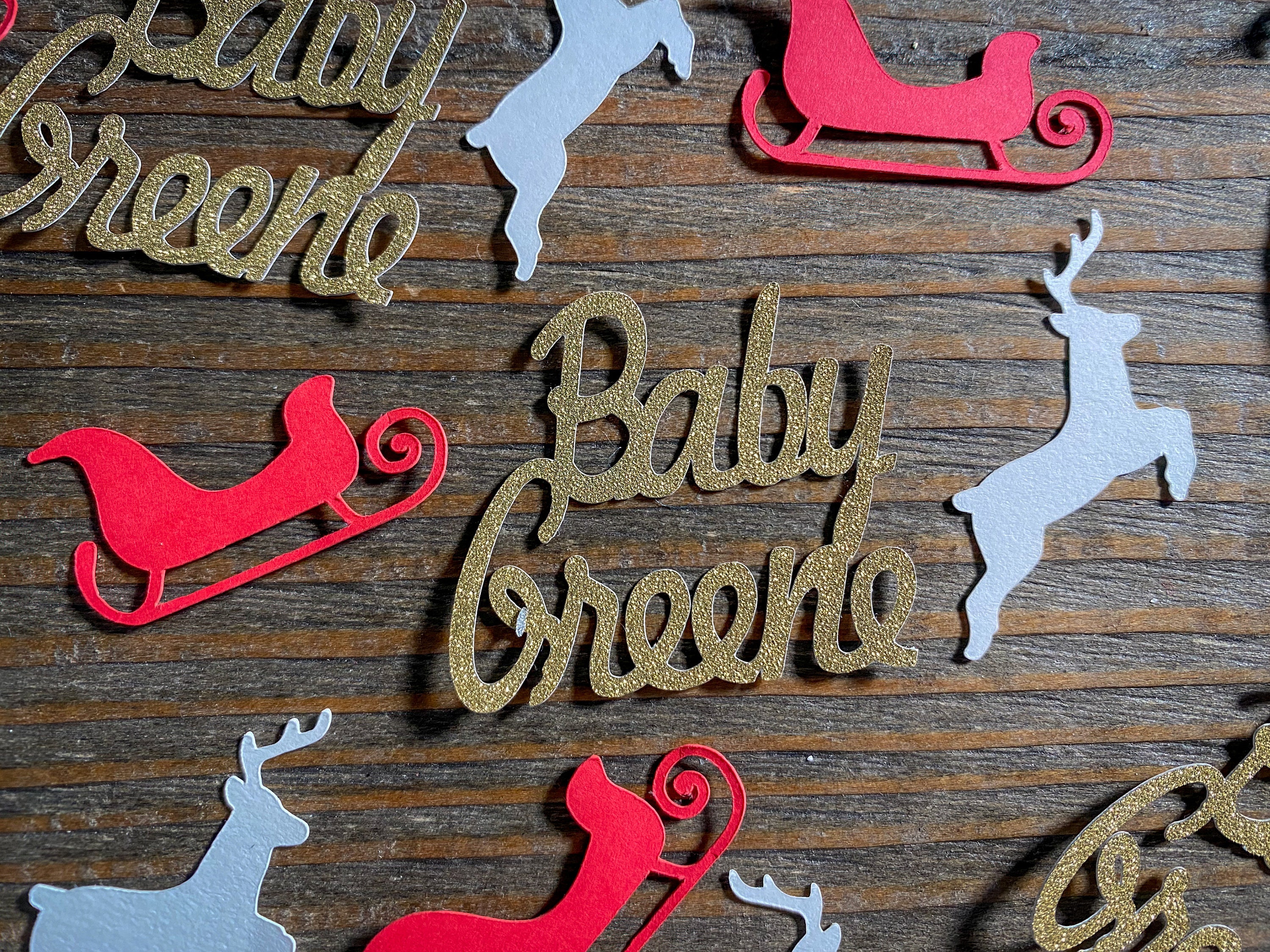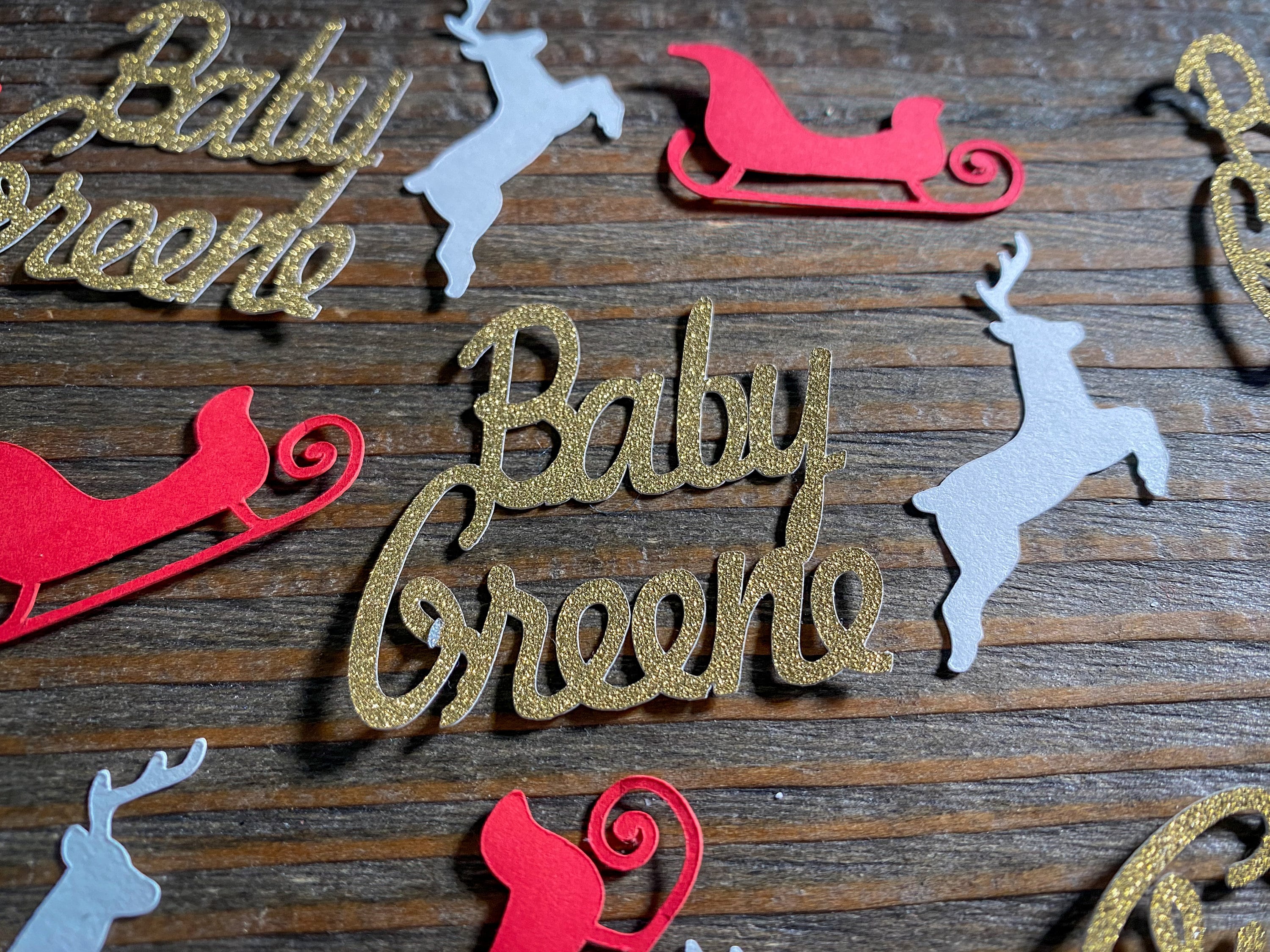 This listing is for 100 pieces of confetti. It includes 40 red sleighs, 40 white deer, and 20 gold baby name pieces. The sleighs measure approximately 1.25 inches and the deer measure approximately 1.25 inches. The glitter names are white on the reverse side.