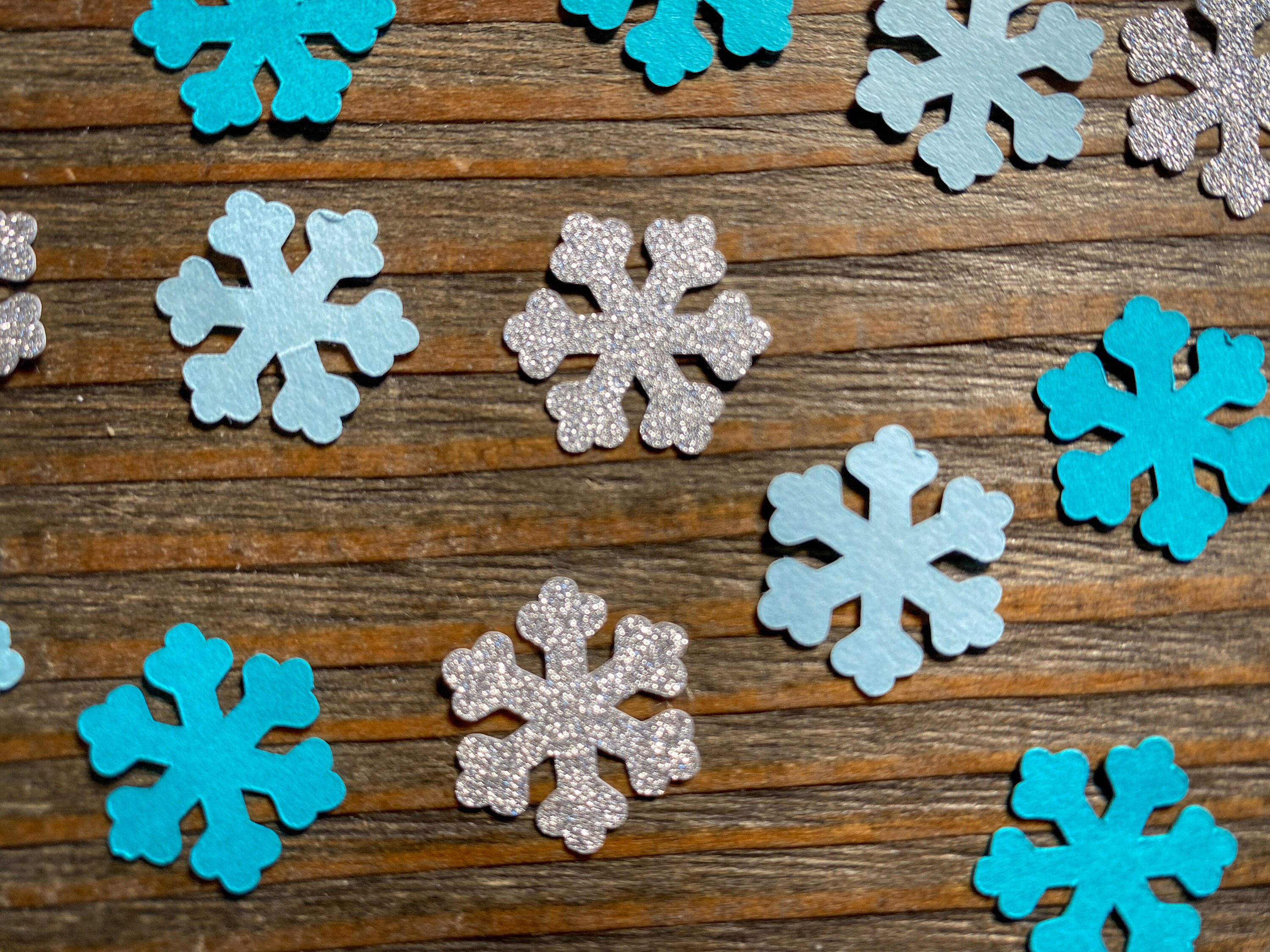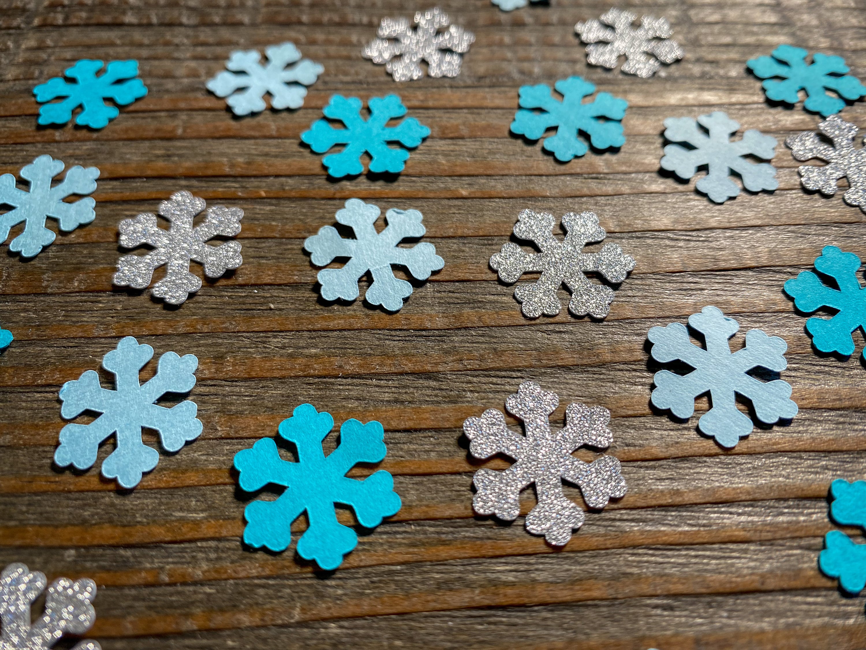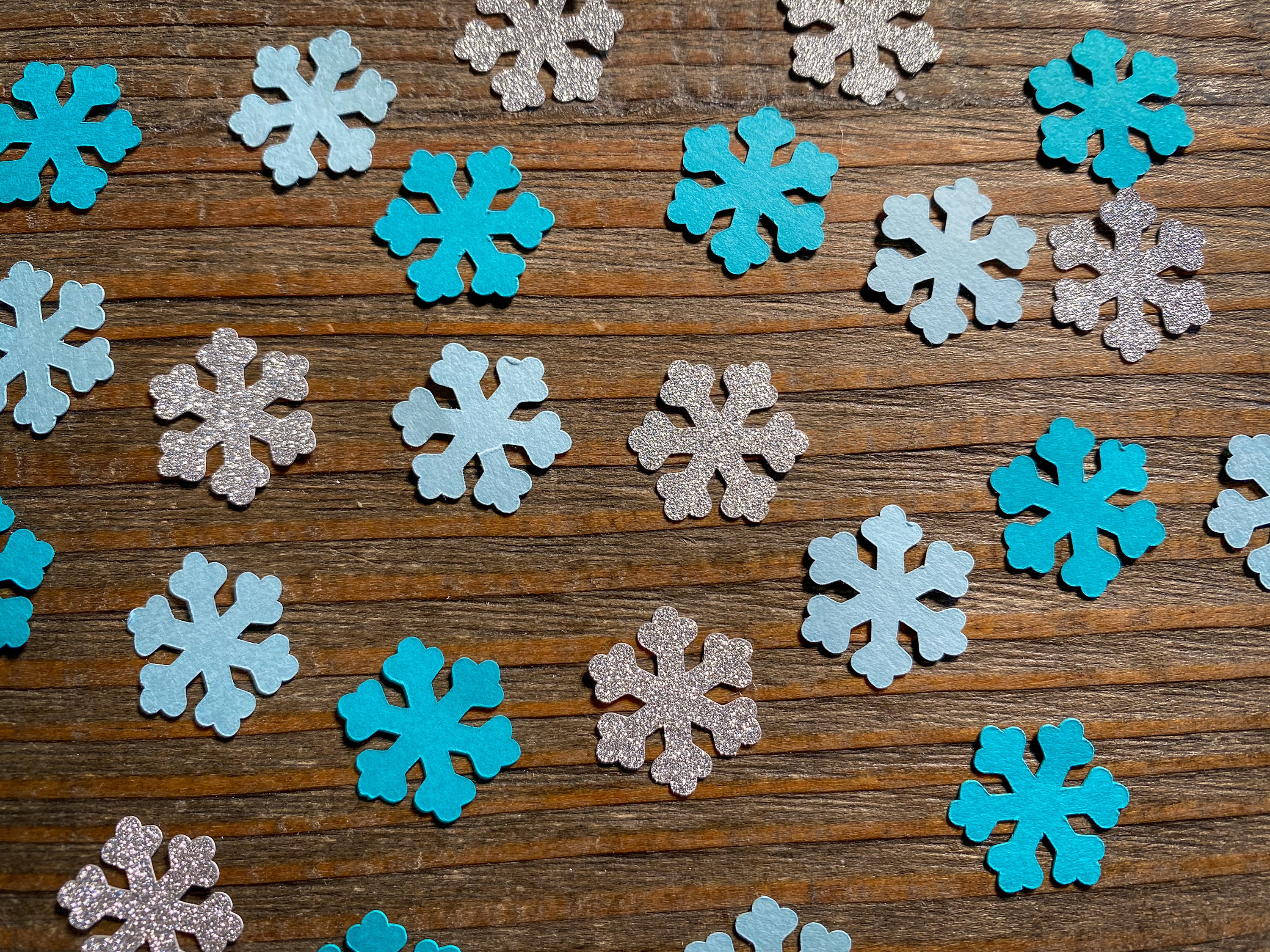 This listing is for 150 pieces of confetti! If includes 50 pieces of light blue snow, 50 pieces of teal snow, and 50 pieces of silver snow. The snowflakes are made of premium cardstock and measure .75 inches wide. The glitter snowflakes are white on the reverse side.