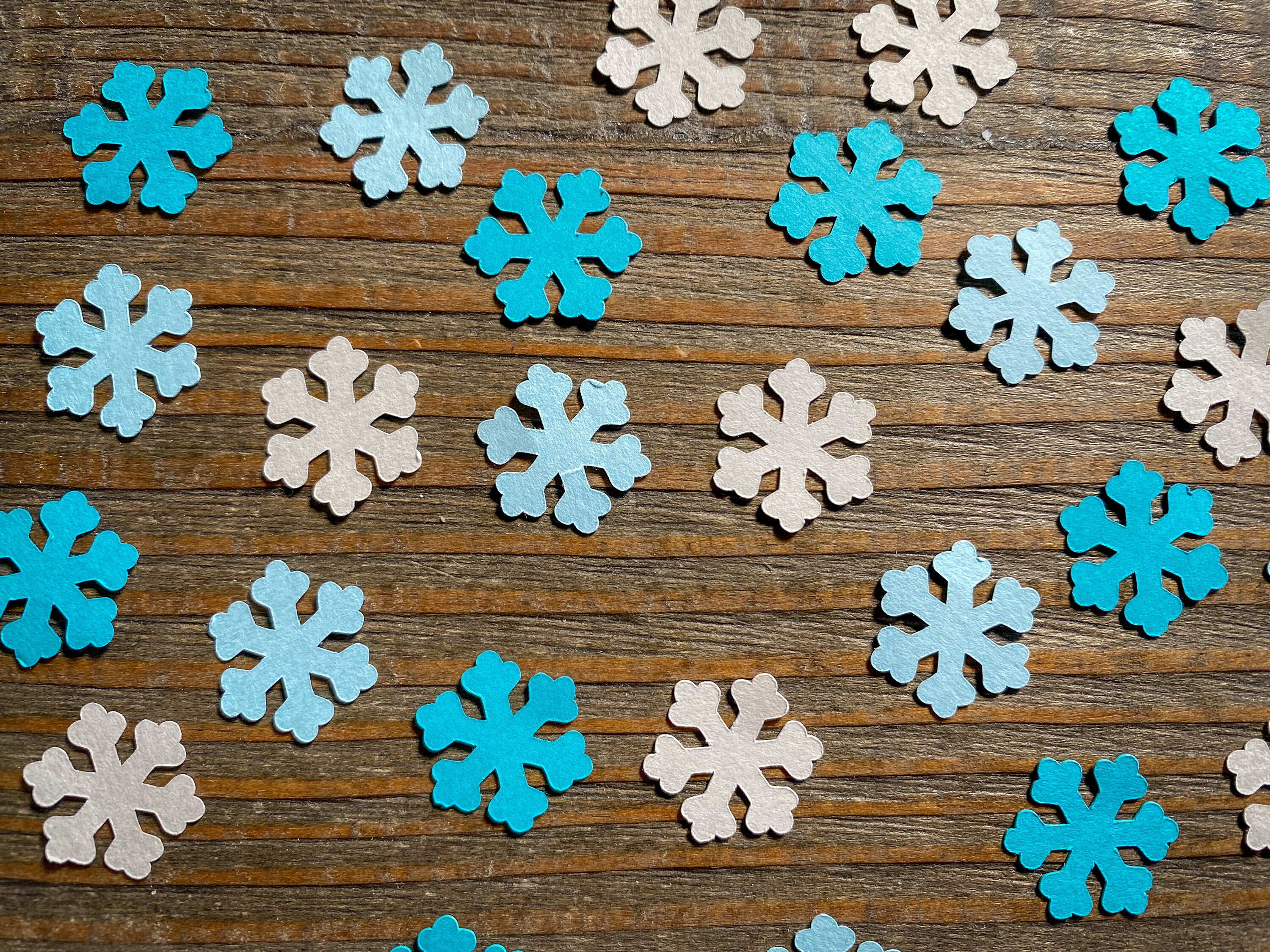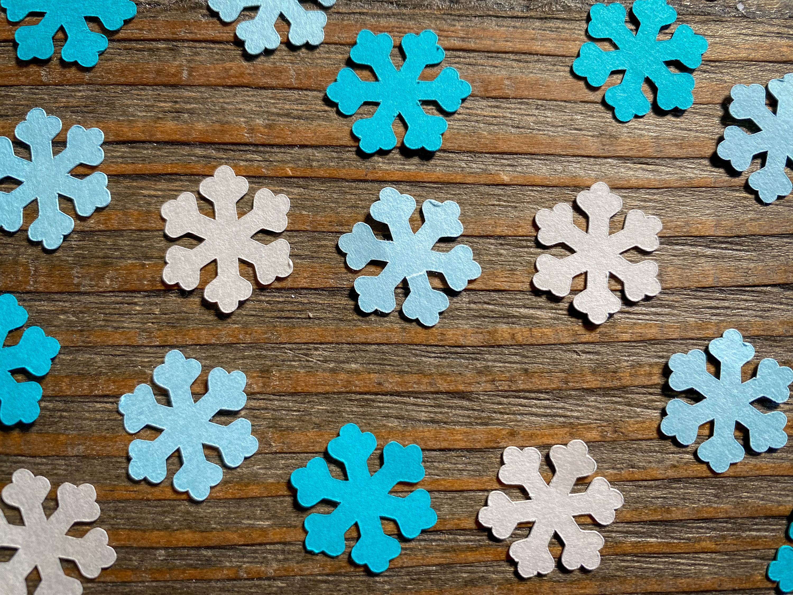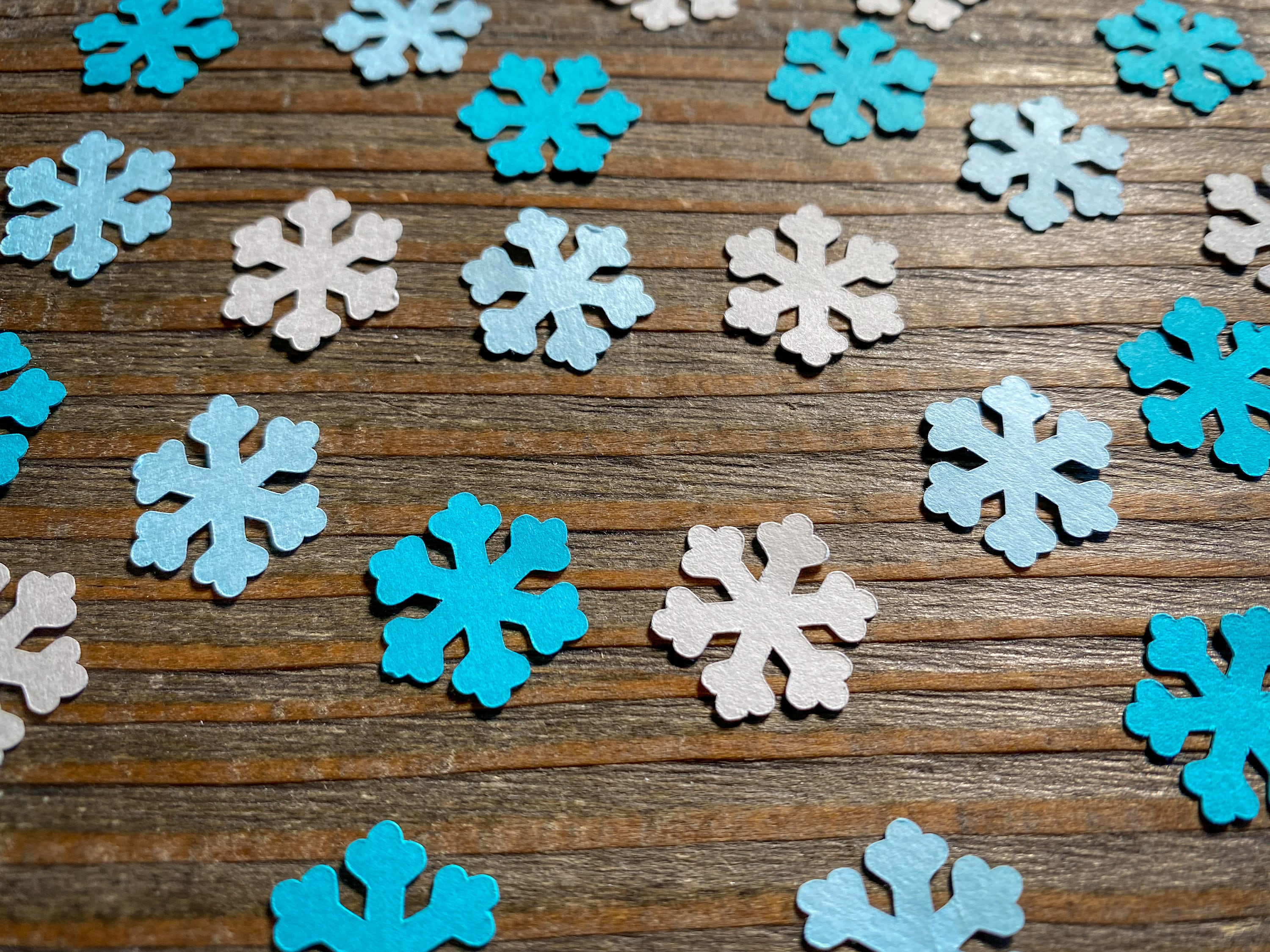 This listing is for 150 pieces of confetti! If includes 50 pieces of light blue snow, 50 pieces of teal snow, and 50 pieces of gray snow. The snowflakes are made of premium cardstock and measure .75 inches wide.