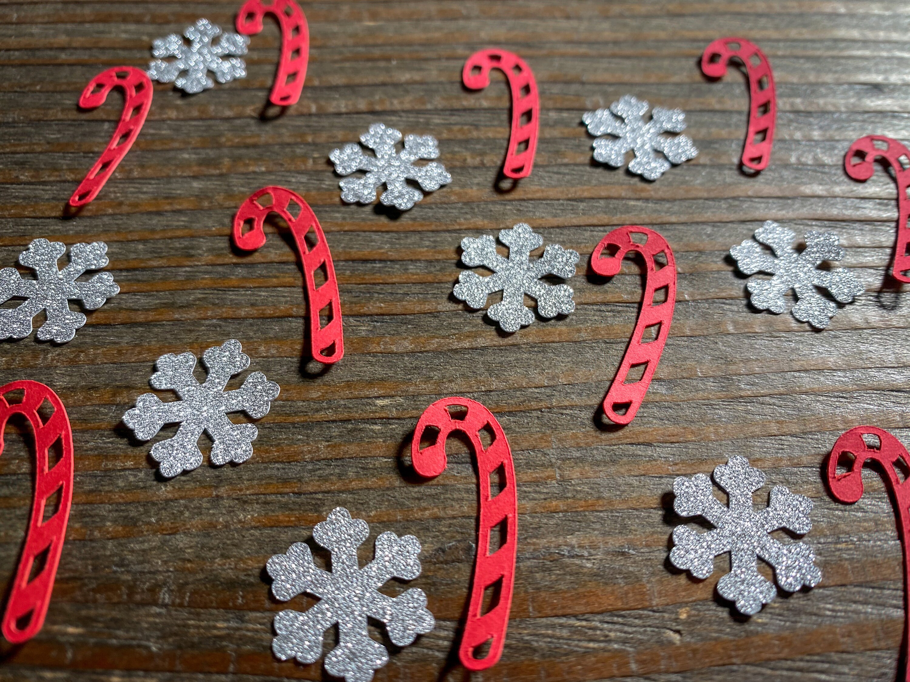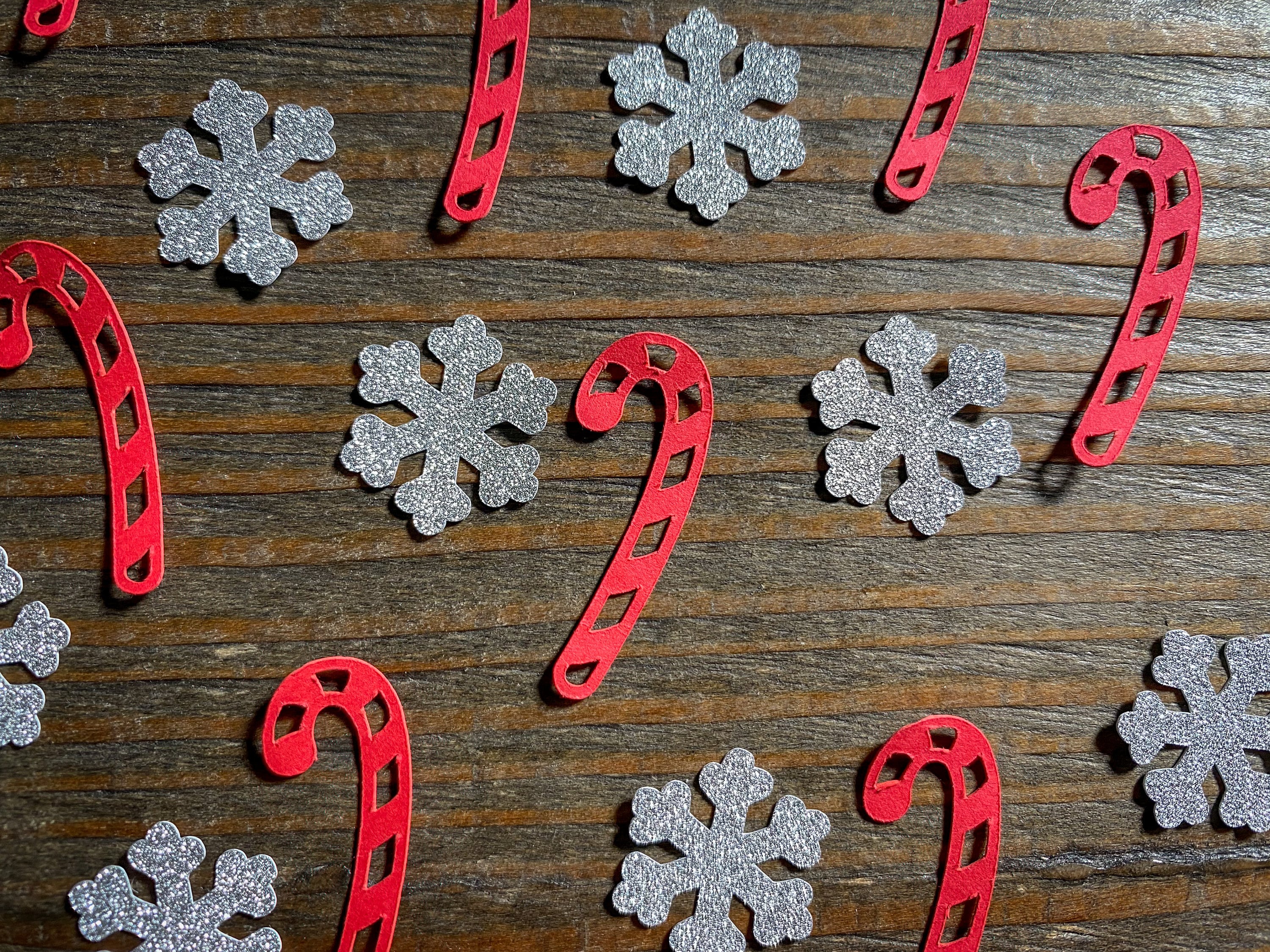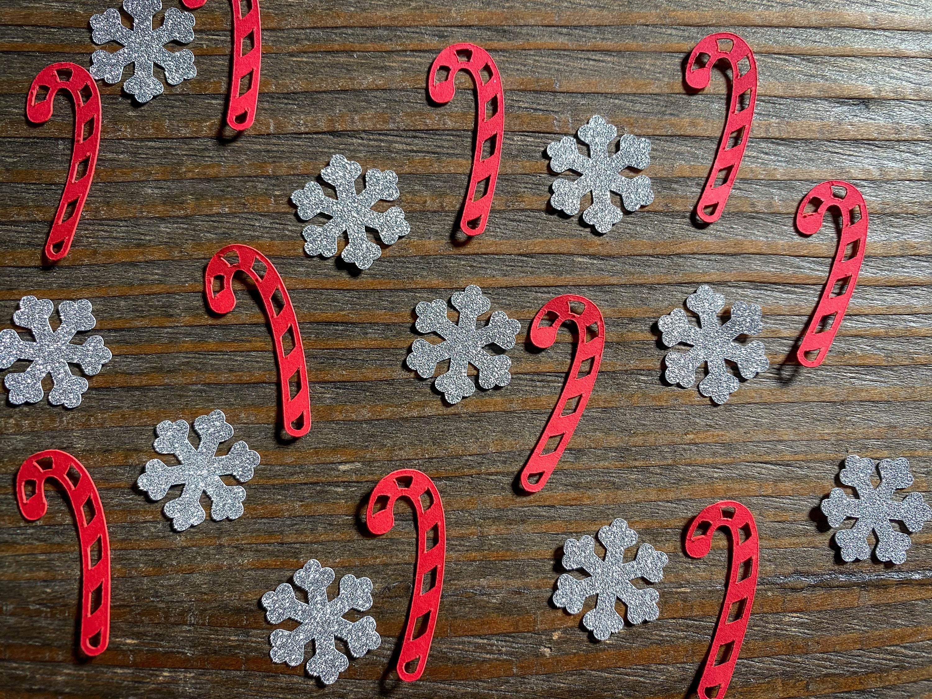 This listing is for 100 pieces of confetti. It includes 50 red candy canes and 50 silver snowflakes. The candy canes measure approximately 1.25 inches in length and the snowflakes measure .75 inches in width. The snowflake are white on the reverse side.