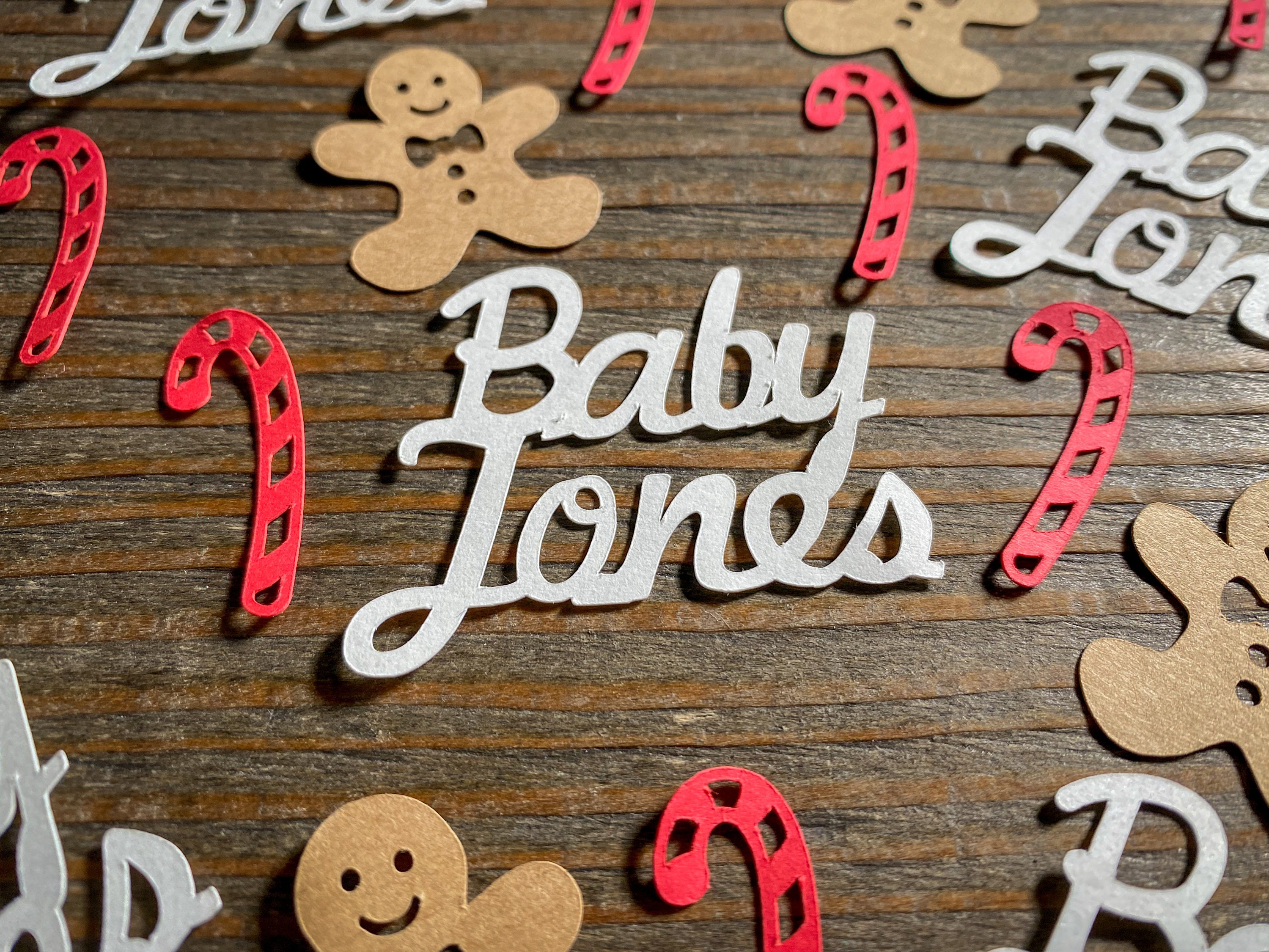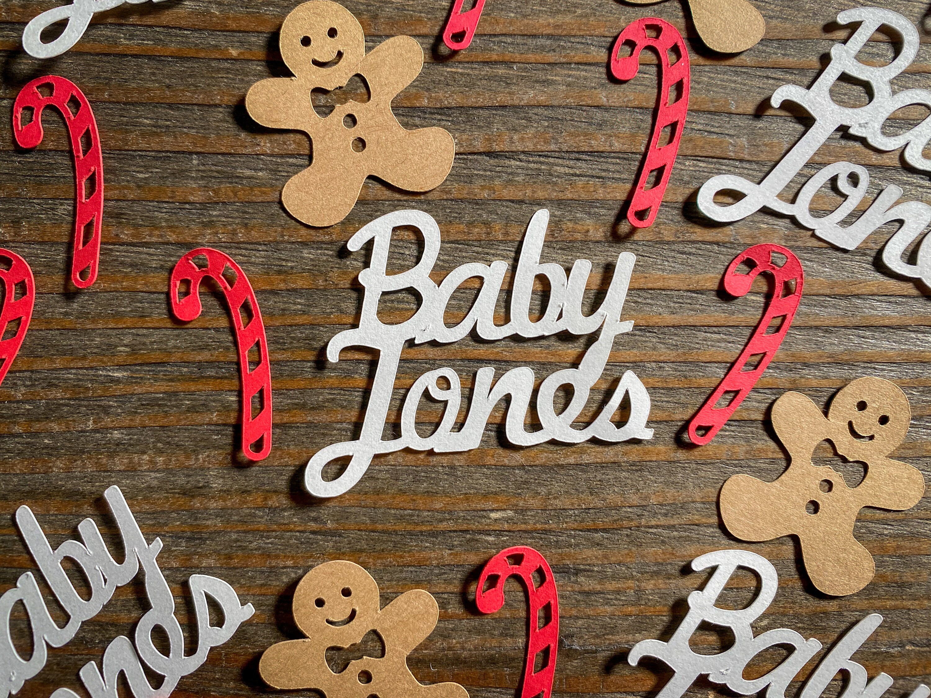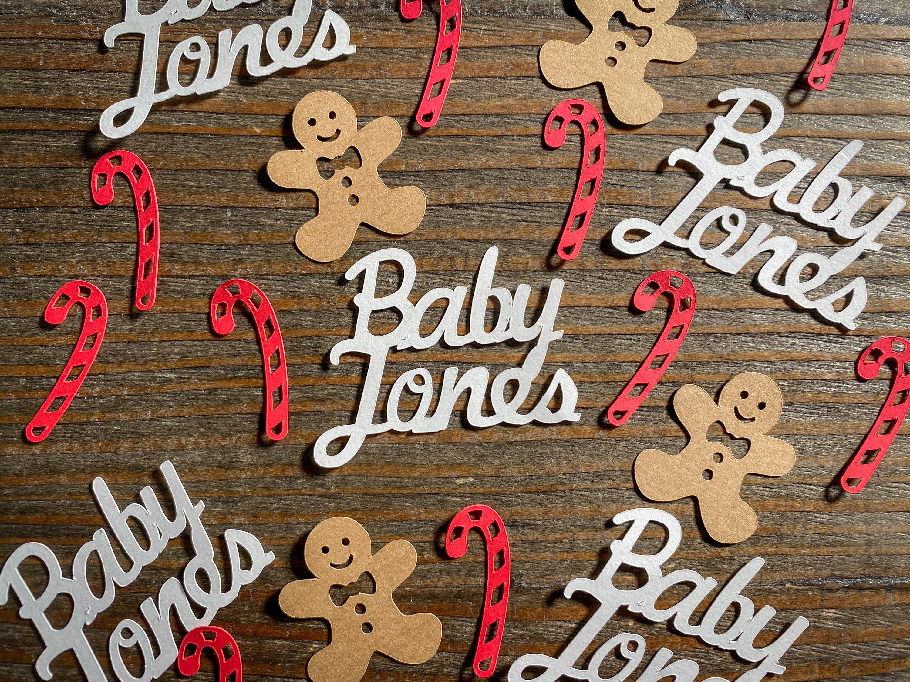 This listing is for 100 pieces of confetti. It includes 40 red candy canes, 40 brown gingerbread men, and 20 white baby names. The candy canes measure approximately 1.25 inches and the snowflakes measure approximately .75 inches. If choosing glitter it is white on the reverse side.
