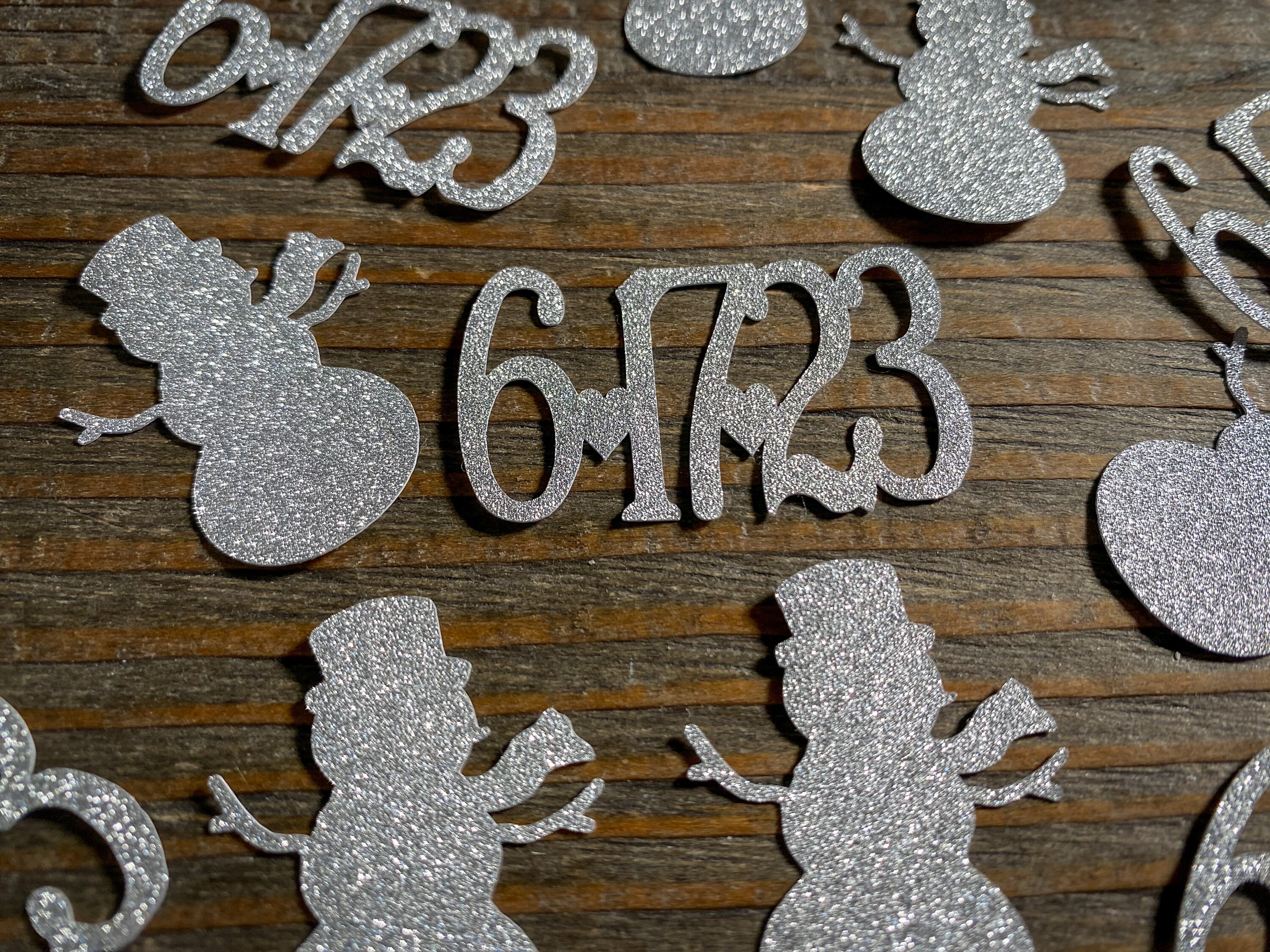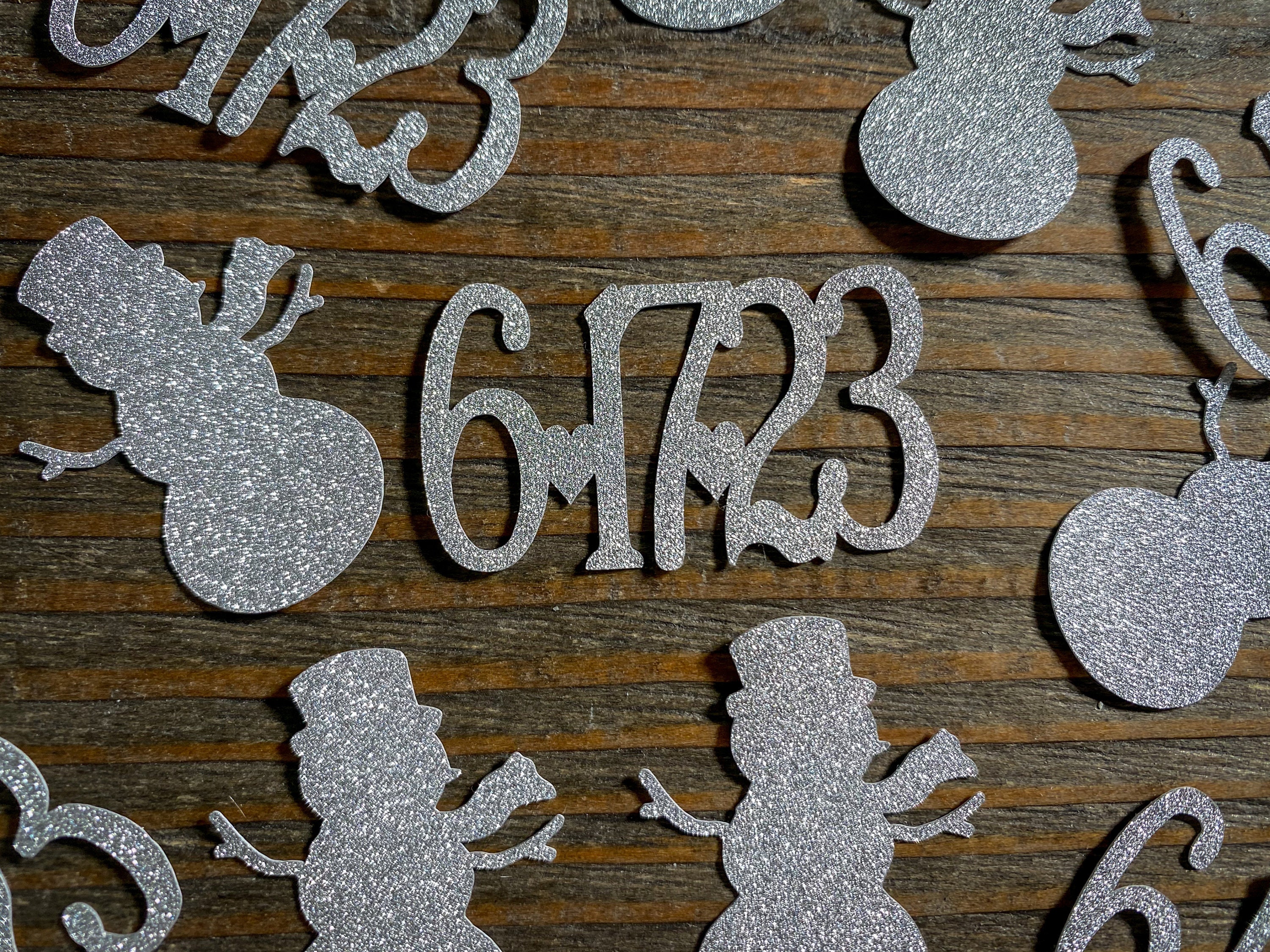 This listing is for 100 pieces of confetti! It includes 25 silver dates and 75 pieces of silver snowmen. The snowmen measure 1.25 inches. The glitter confetti is white on the reverse side.