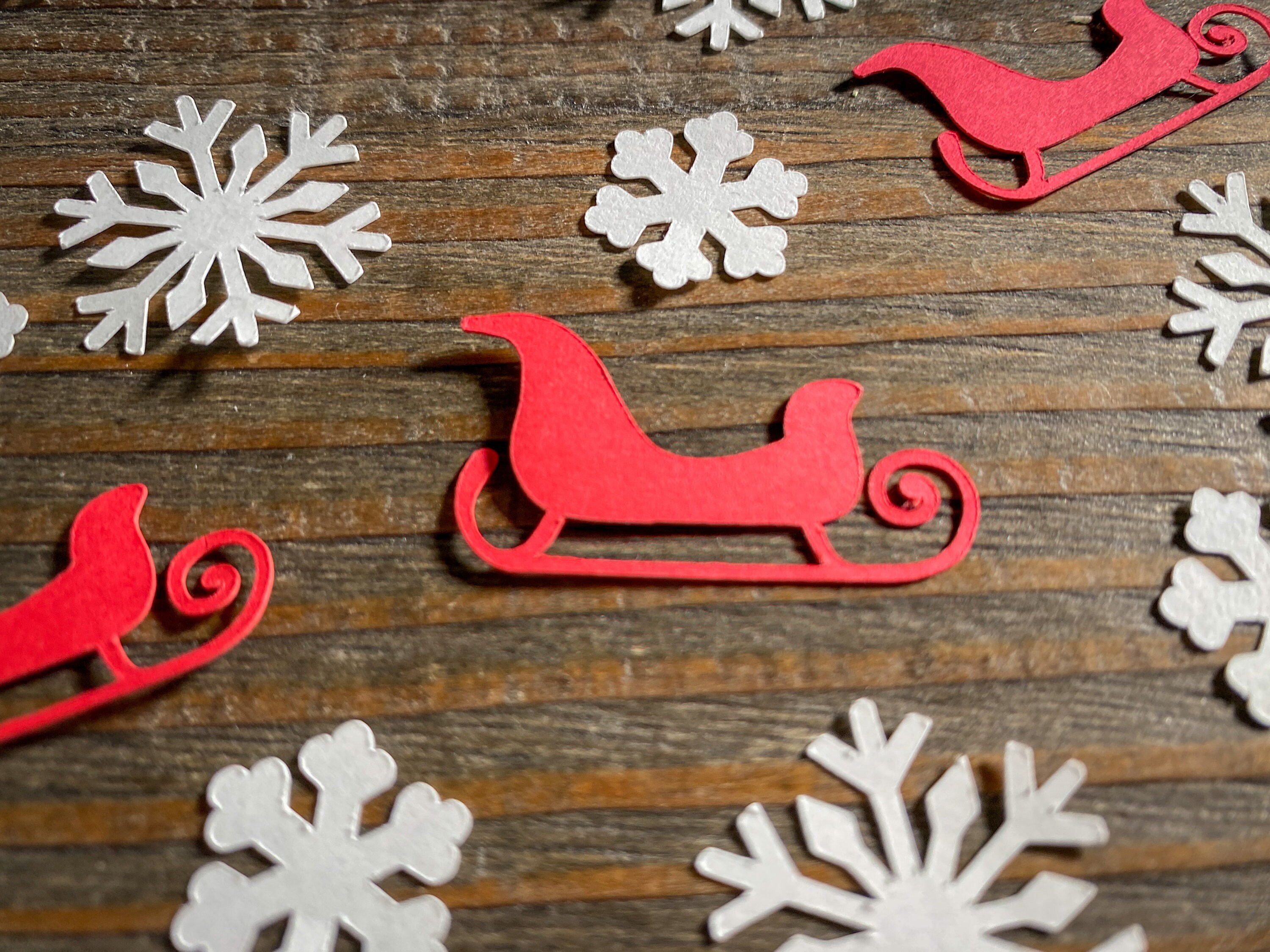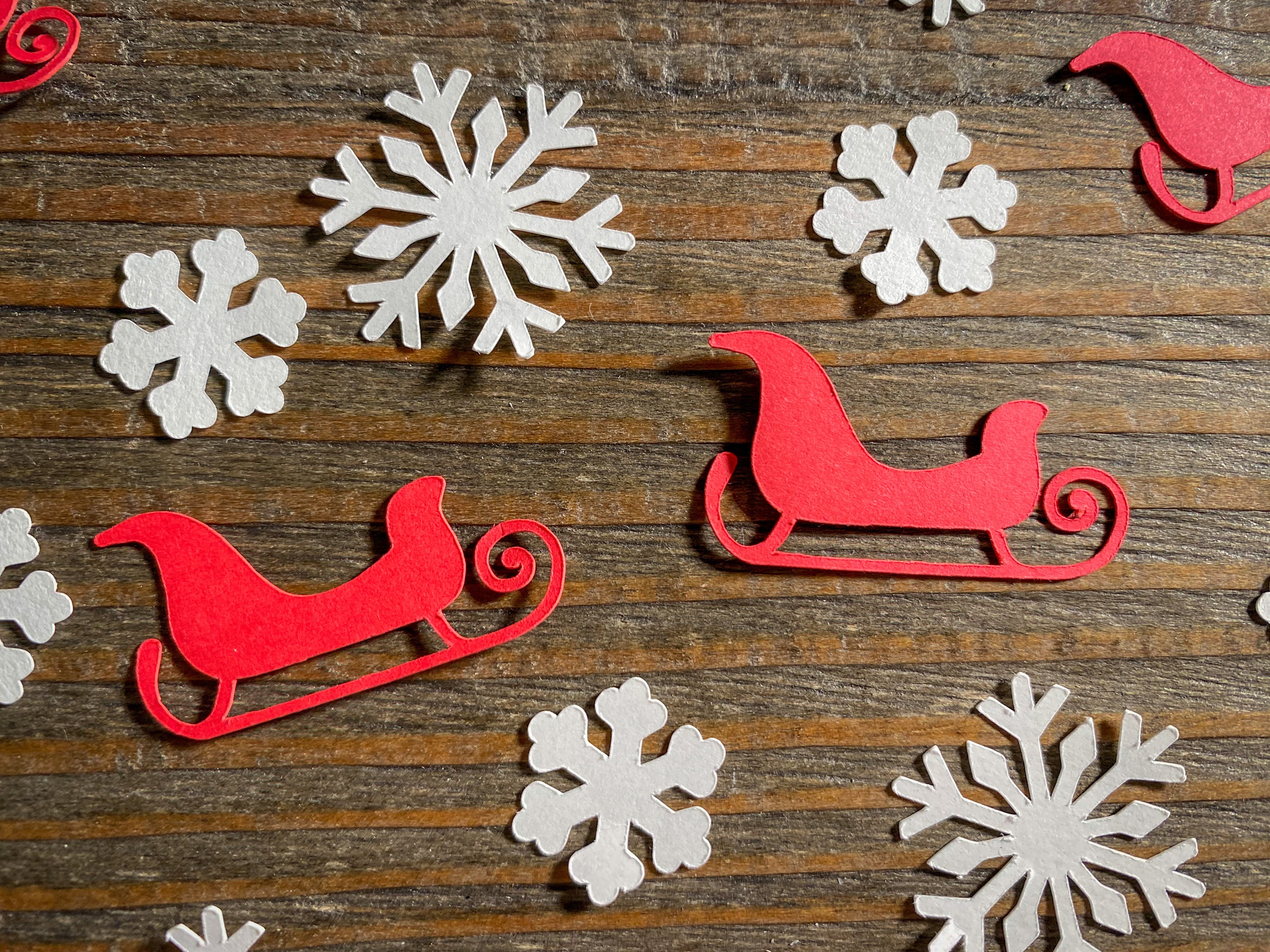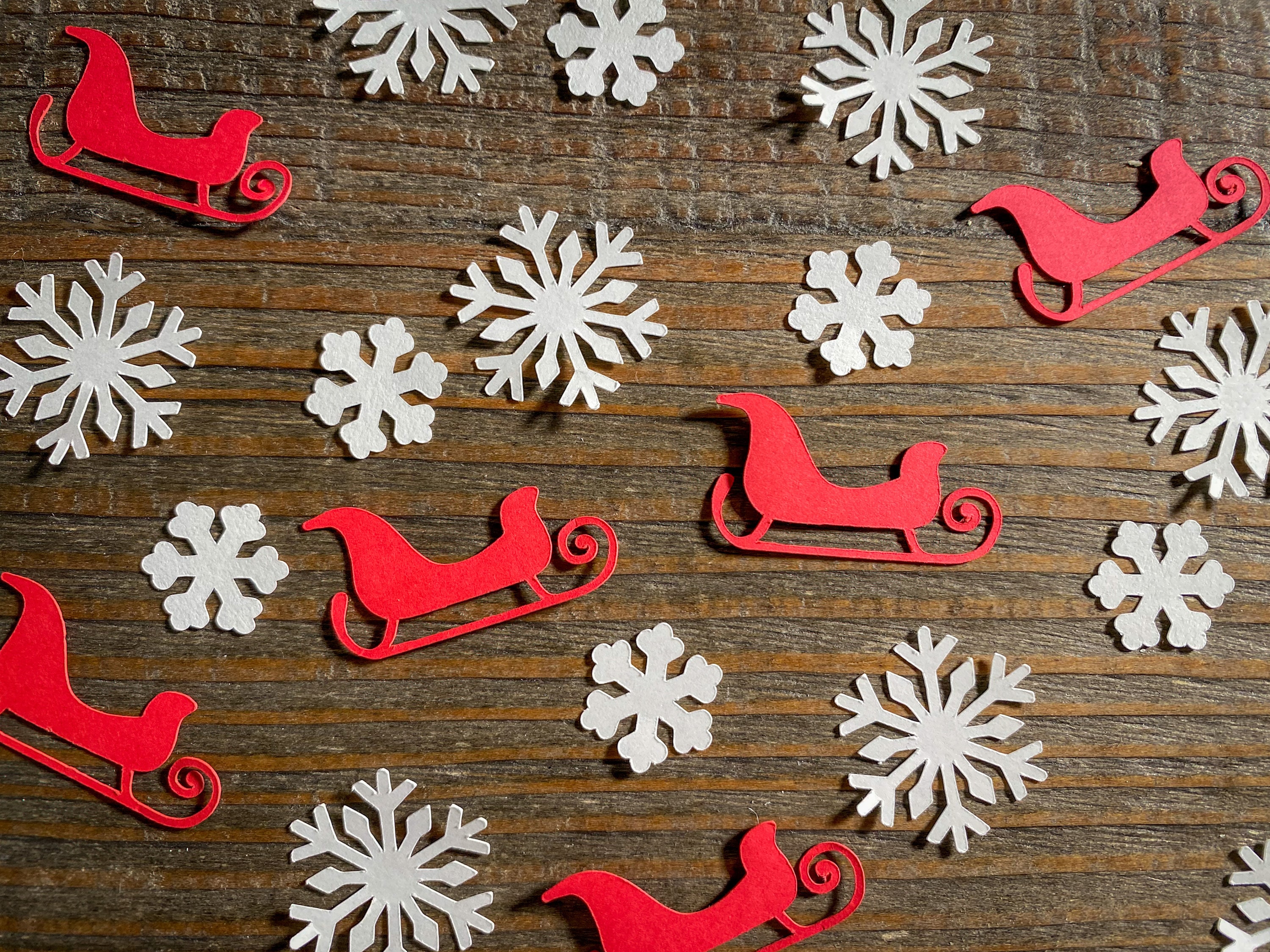 This listing is for 100 pieces of confetti! It includes 30 red sleighs, 30 large whiter snowflakes, and 40 small white snowflakes. The red sleighs measure approximately 1.25 inches, the larger snowflakes measure 1.25 inches, and the small snowflakes measure approximately .75 inches.