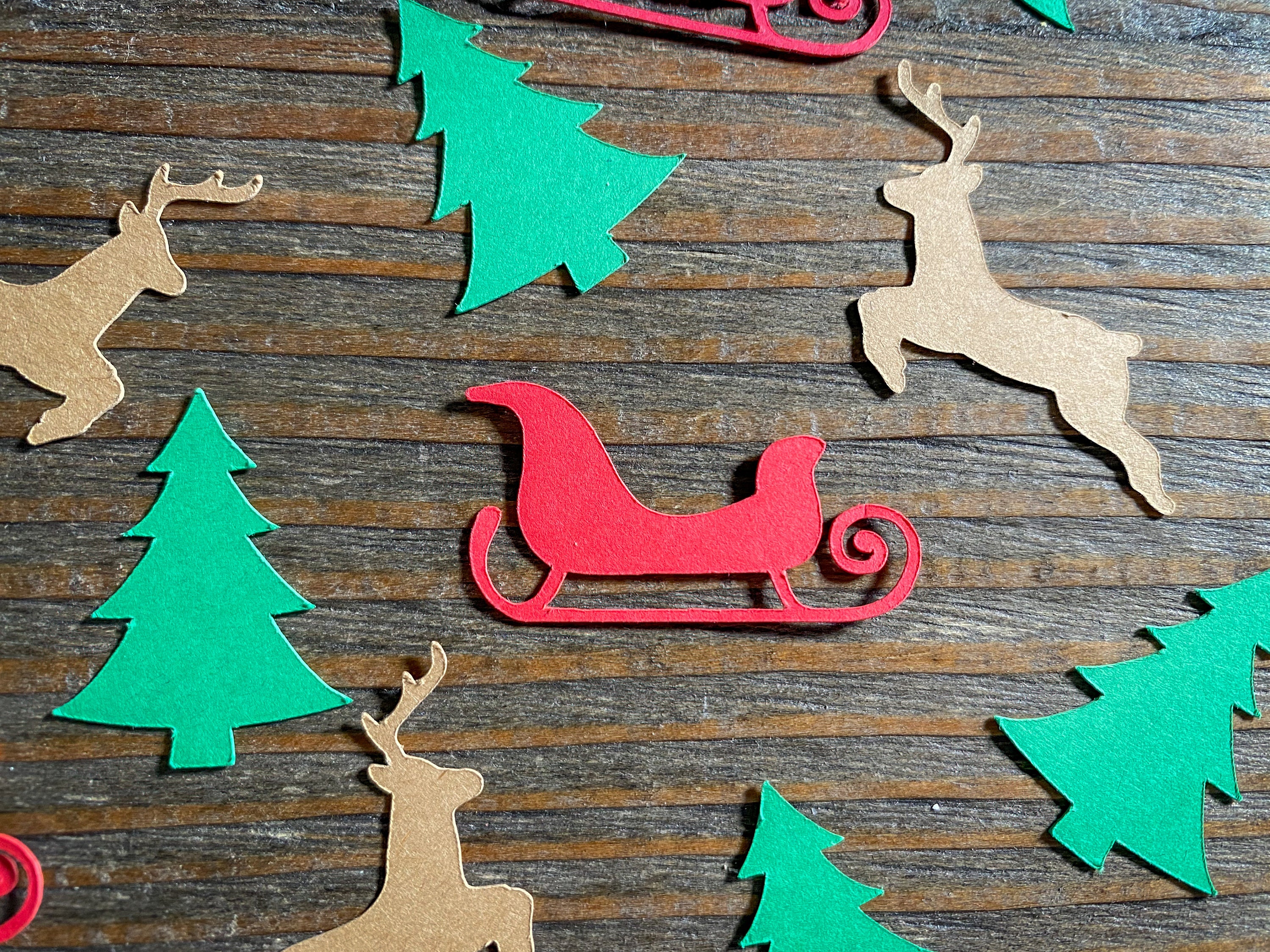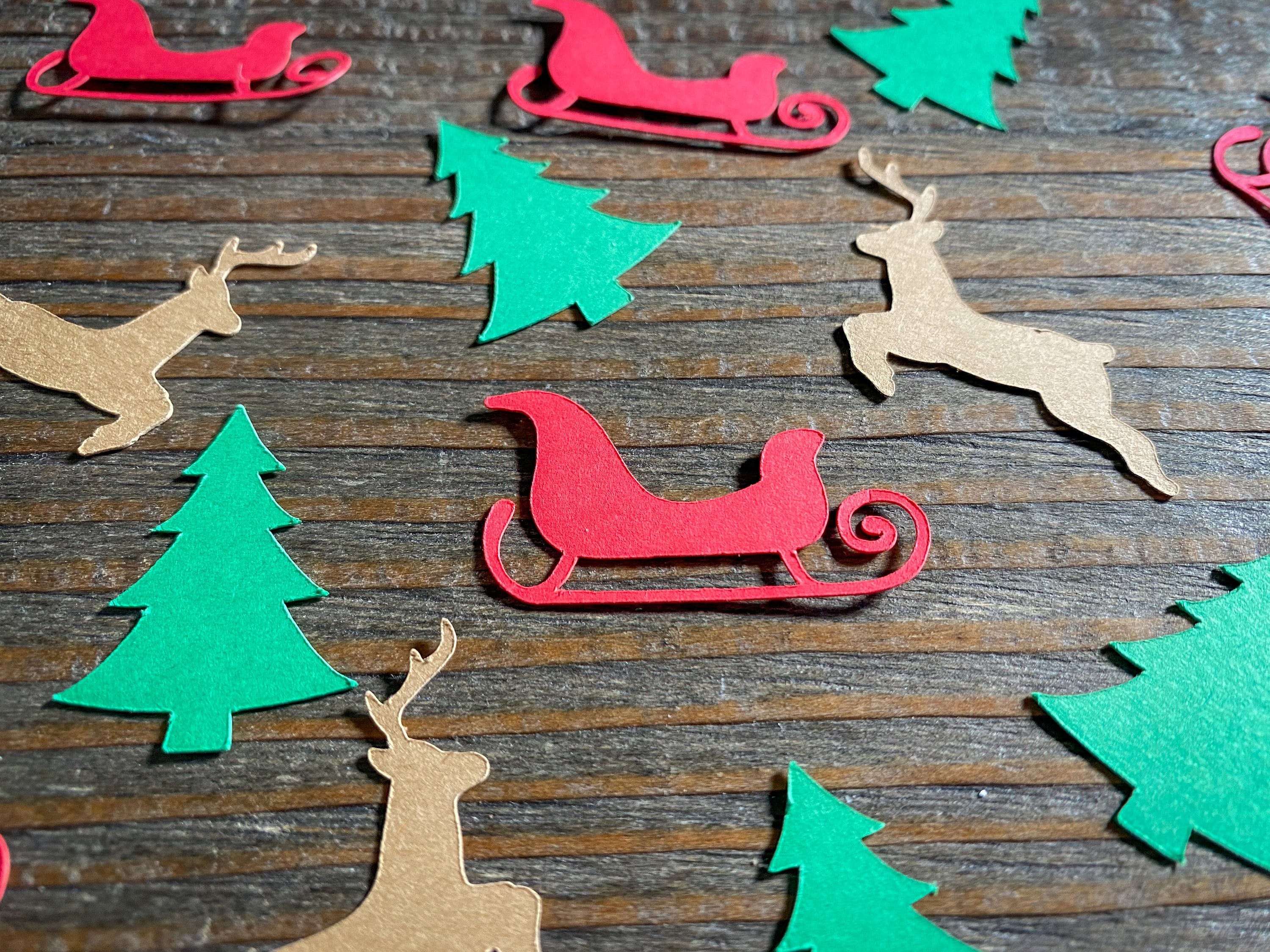 This listing is for 100 pieces of confetti. It includes 30 red sleighs, 35 green Christmas trees, and 35 brown reindeer. The sleighs measure approximately 1.5 inches in length, the trees measure approximately 1.25 inches, and the reindeer measure 1.25 inches in width.