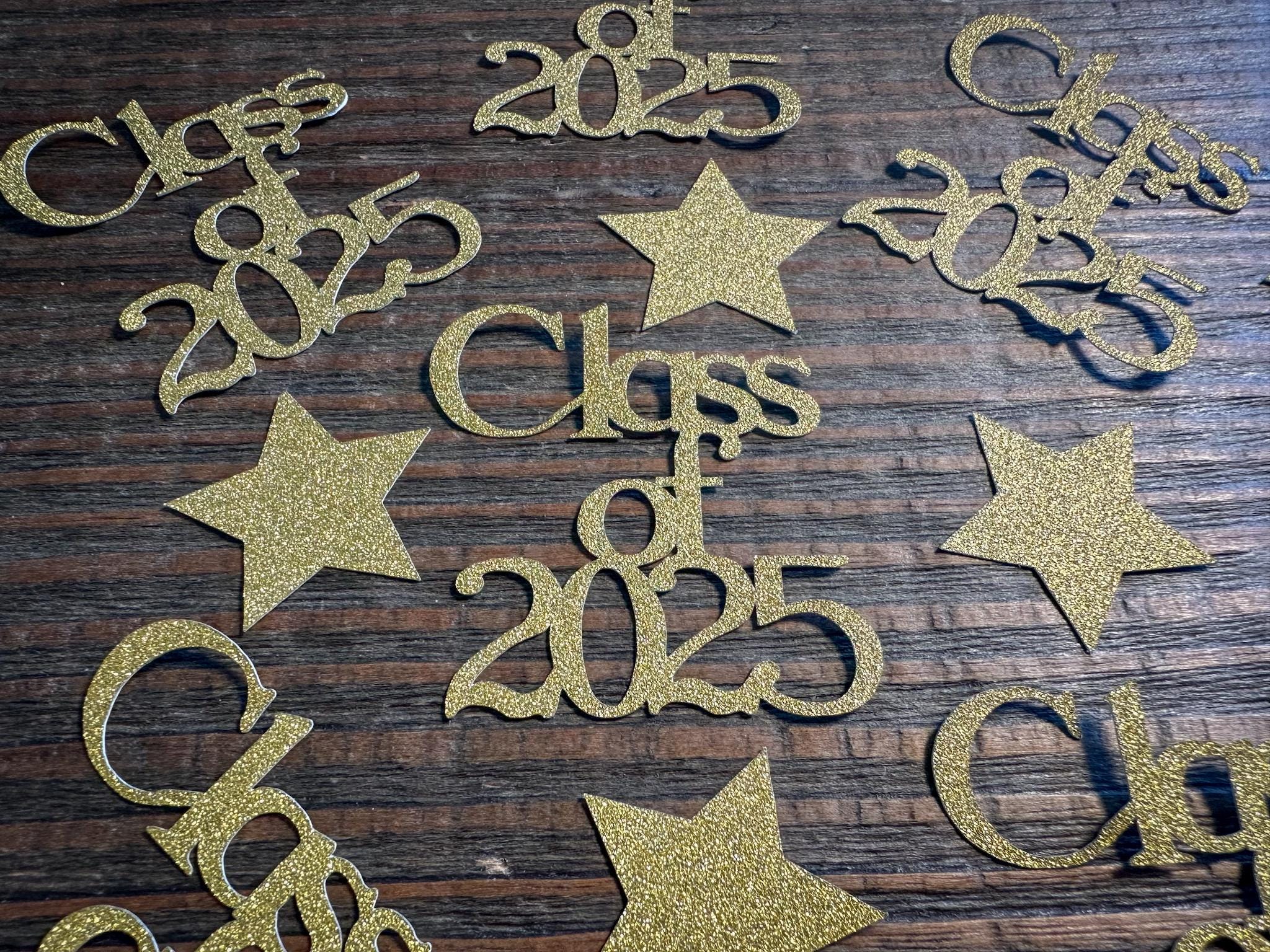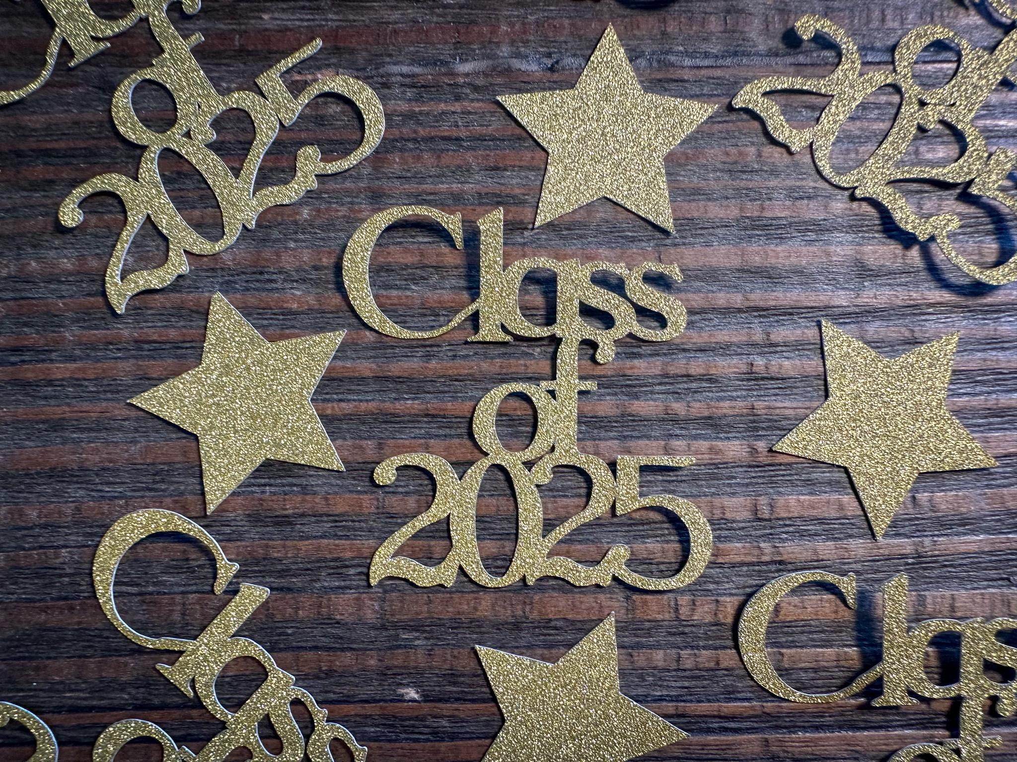 This listing is for 100 pieces of confetti! It includes 15 pieces of gold glitter "class of 2025" confetti, , and 85 pieces of gold glitter star confetti. The "class of 2025" pieces are white on the reverse side and measure approximately 2 inches in height by 2 inches in width. The stars are white on the reverse side and measure approximately 1.25 inches.