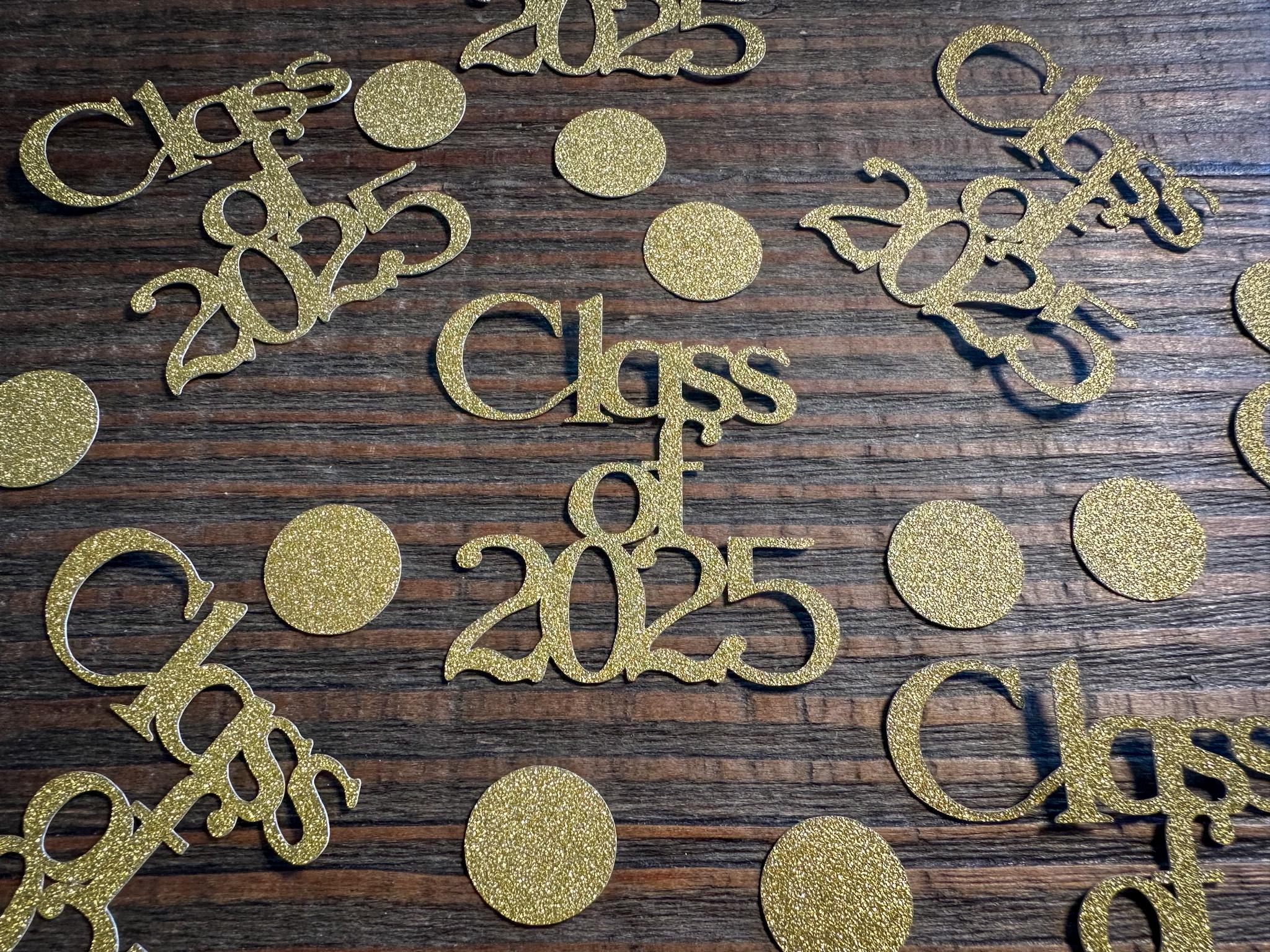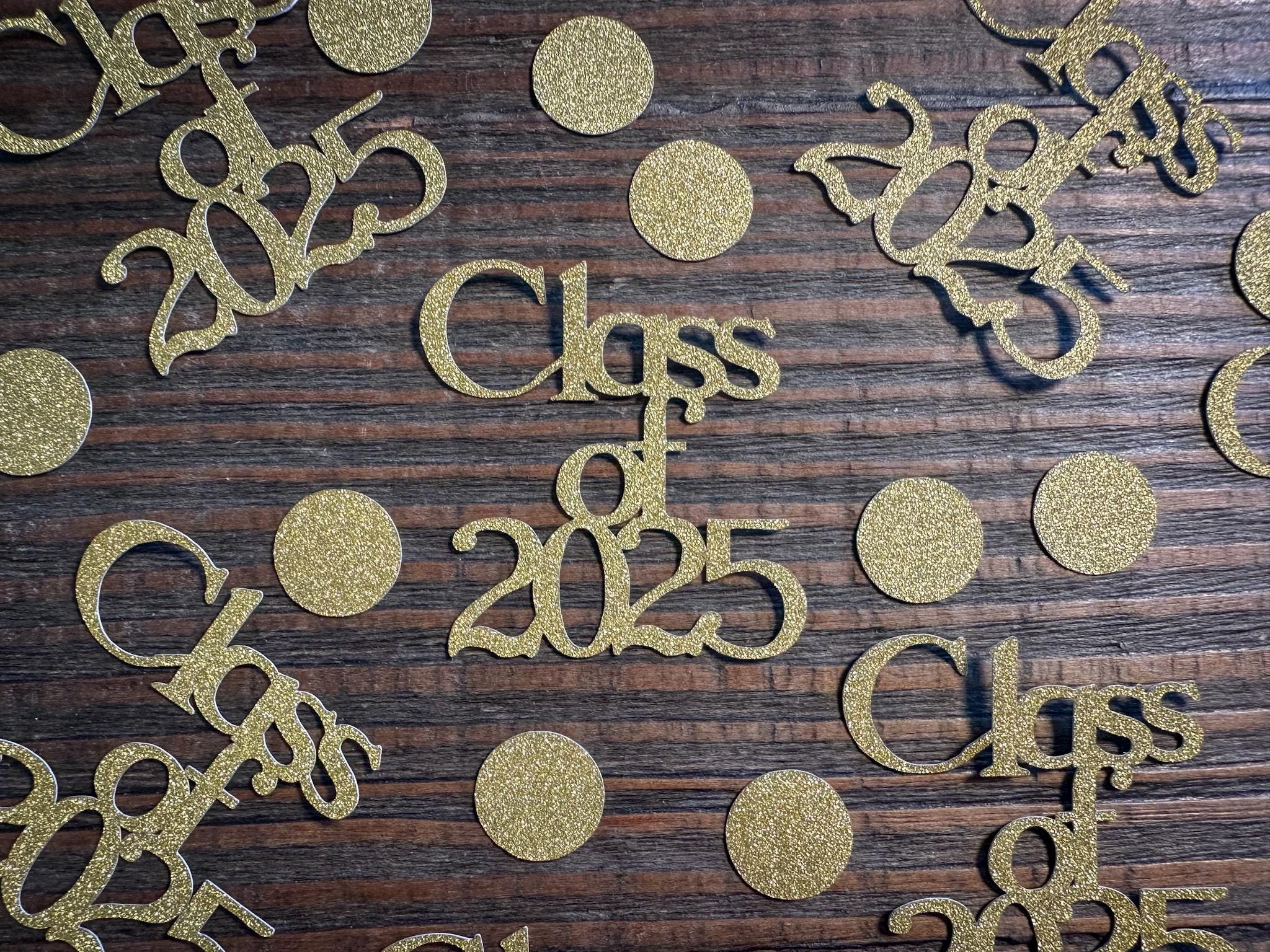 This listing is for 100 pieces of confetti! It includes 15 pieces of gold glitter "class of 2025" confetti, , and 85 pieces of gold glitter circle confetti. The "class of 2025" pieces are white on the reverse side and measure approximately 2 inches in height by 2 inches in width. The circles are white on the reverse side and measure approximately .75 inches.