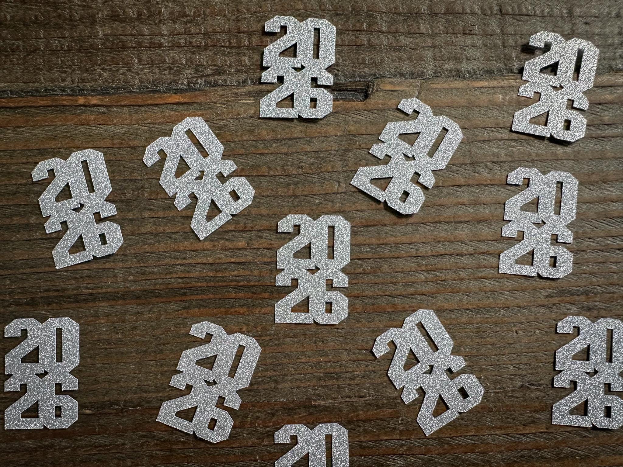 This listing is for 100 pieces of confetti! It includes 30 pieces of glitter silver 2026 confetti and 70 pieces of white diploma confetti. The 2026 confetti is made of elegant silver glitter cardstock that is white on the reverse side and measures approximately 1.25 inches in width. The diploma confetti is made from premium card stock and measures approximately 1.25 inches in width.