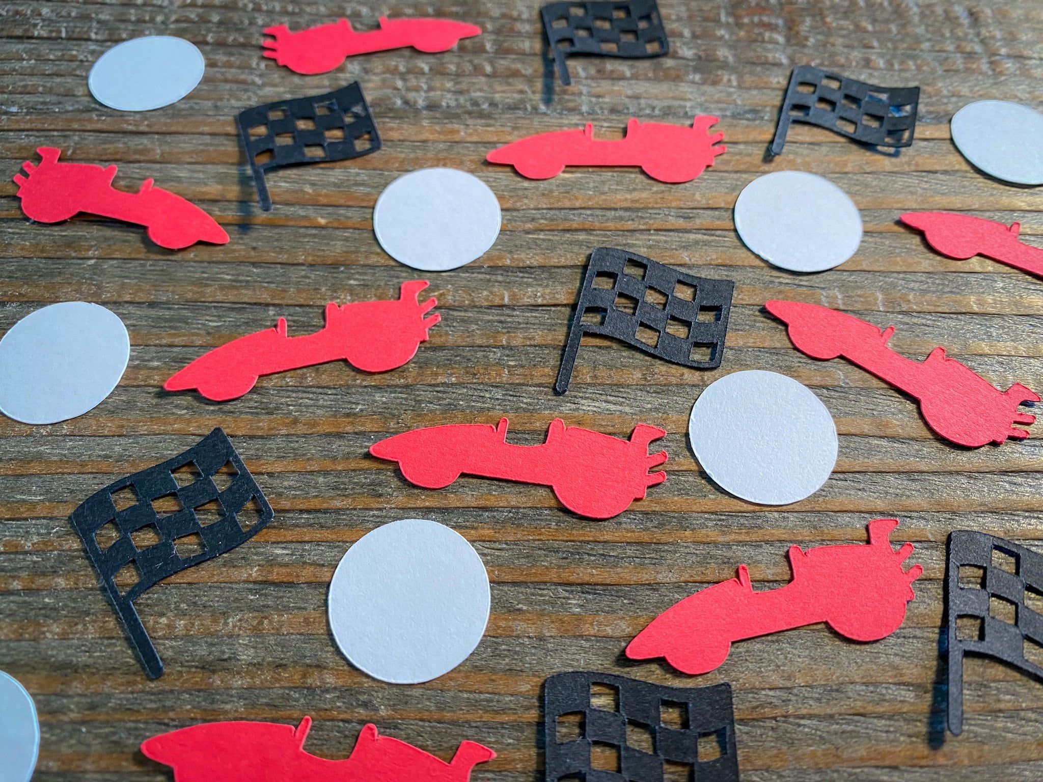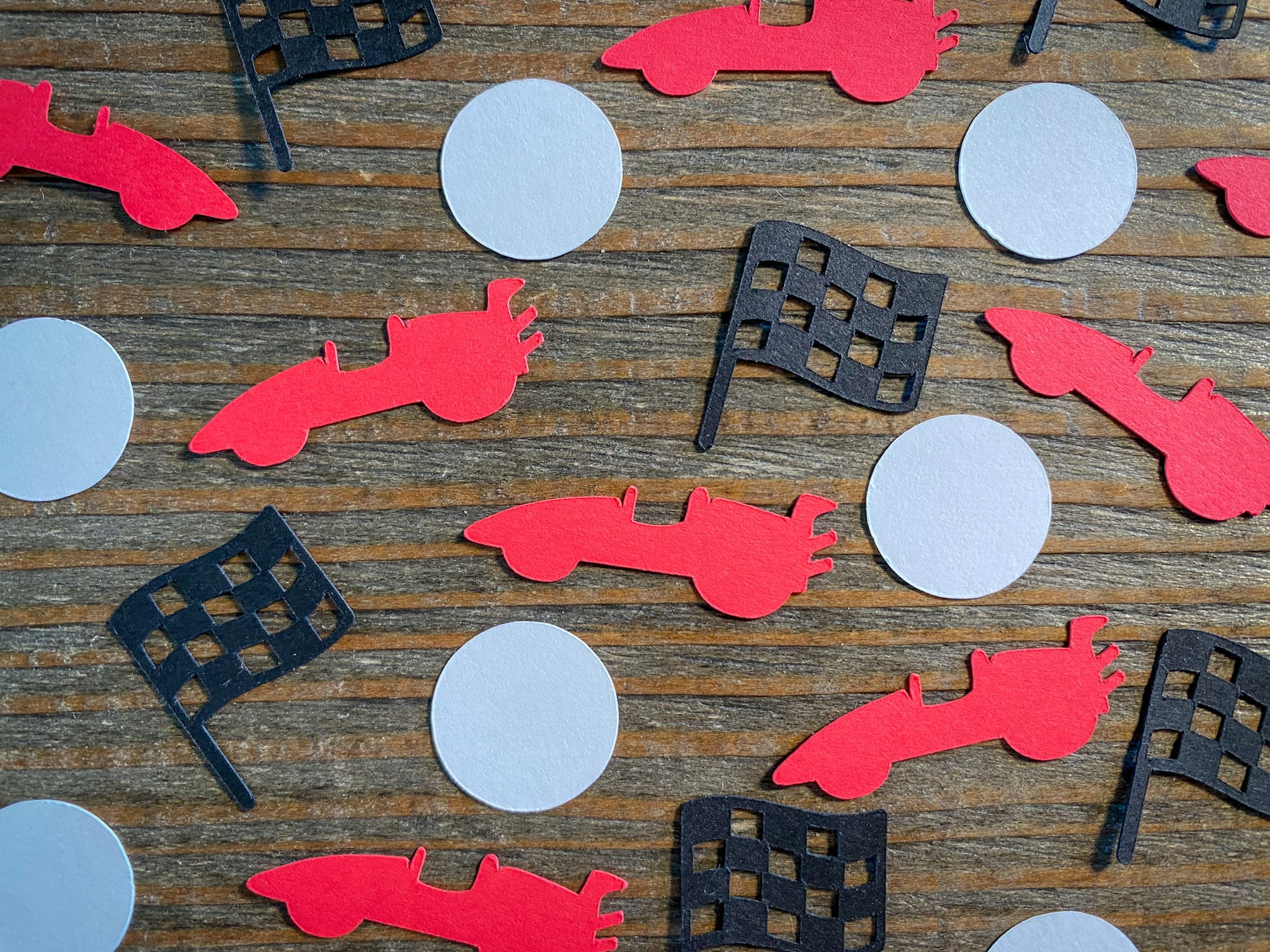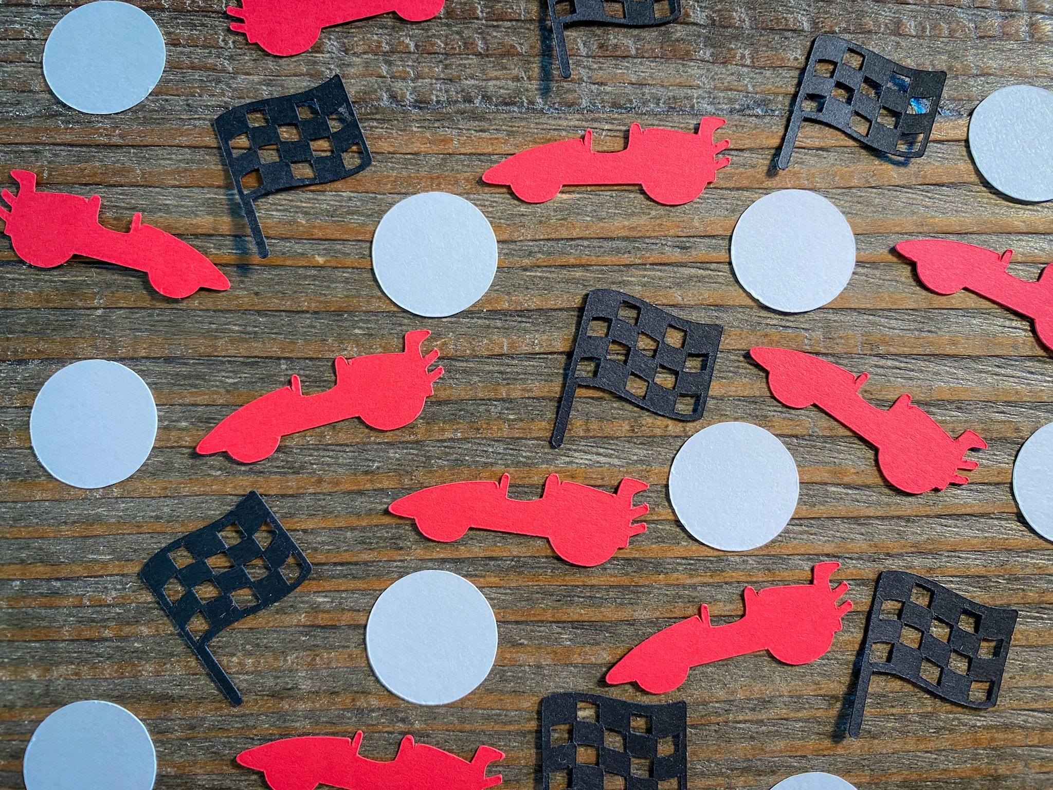 This listing is for 100 pieces of confetti. It includes 25 pieces of red race cars, 25 pieces of black checkered flags, and 50 white circles. The race cars measure approximately 1.5 inches in length, the checkered flags measure approximately 1 inch in height, and the circles measure approximately .75 inches in diameter.