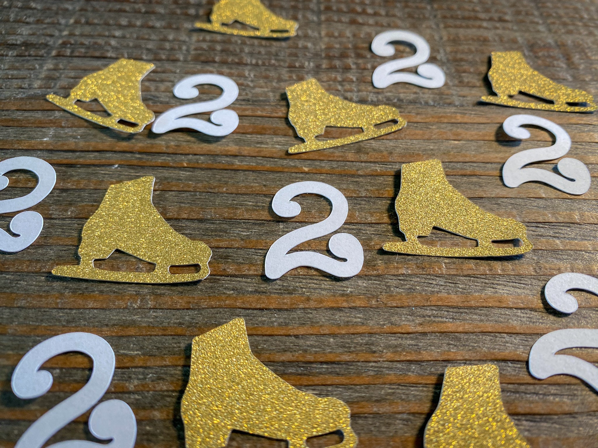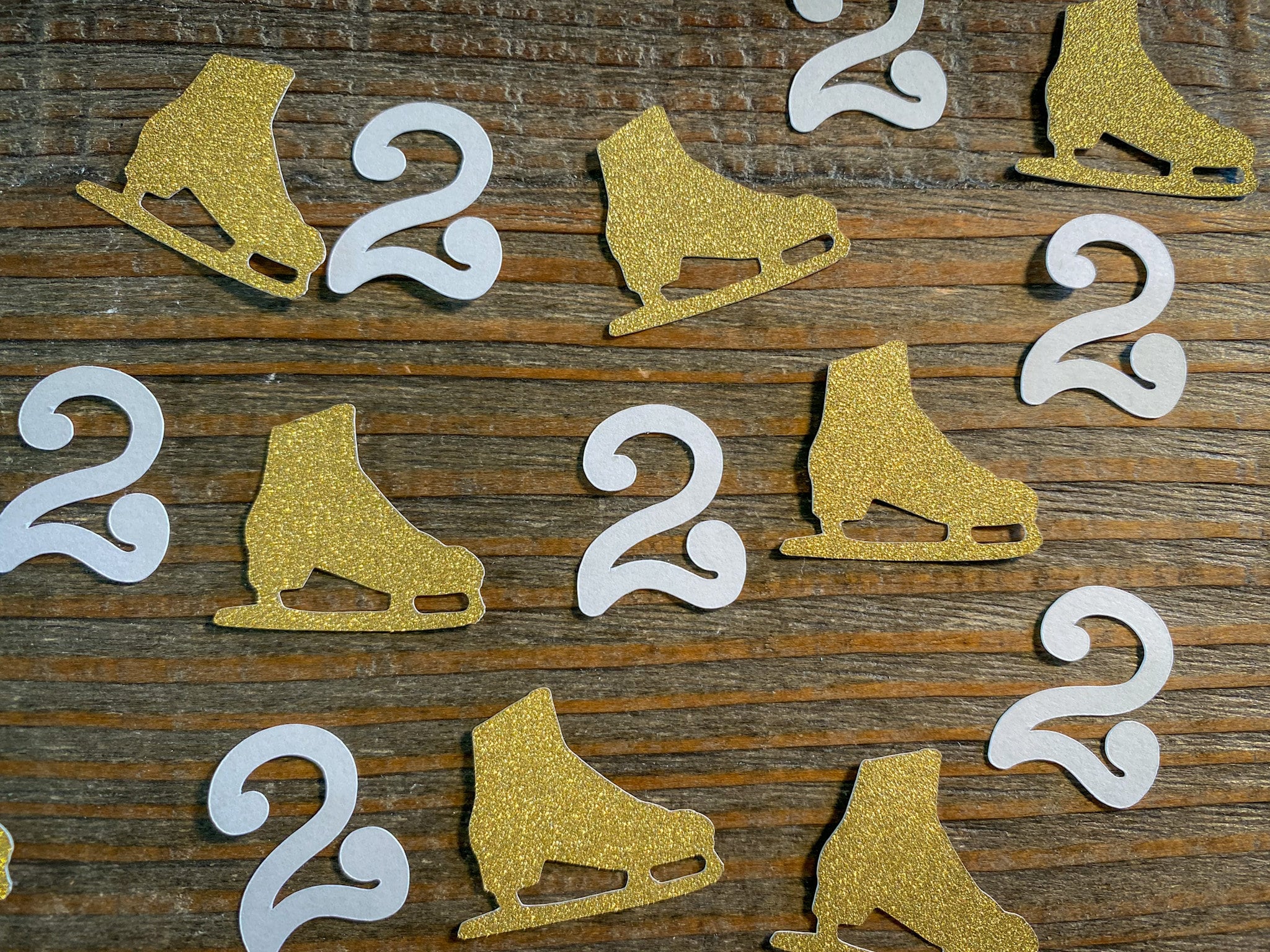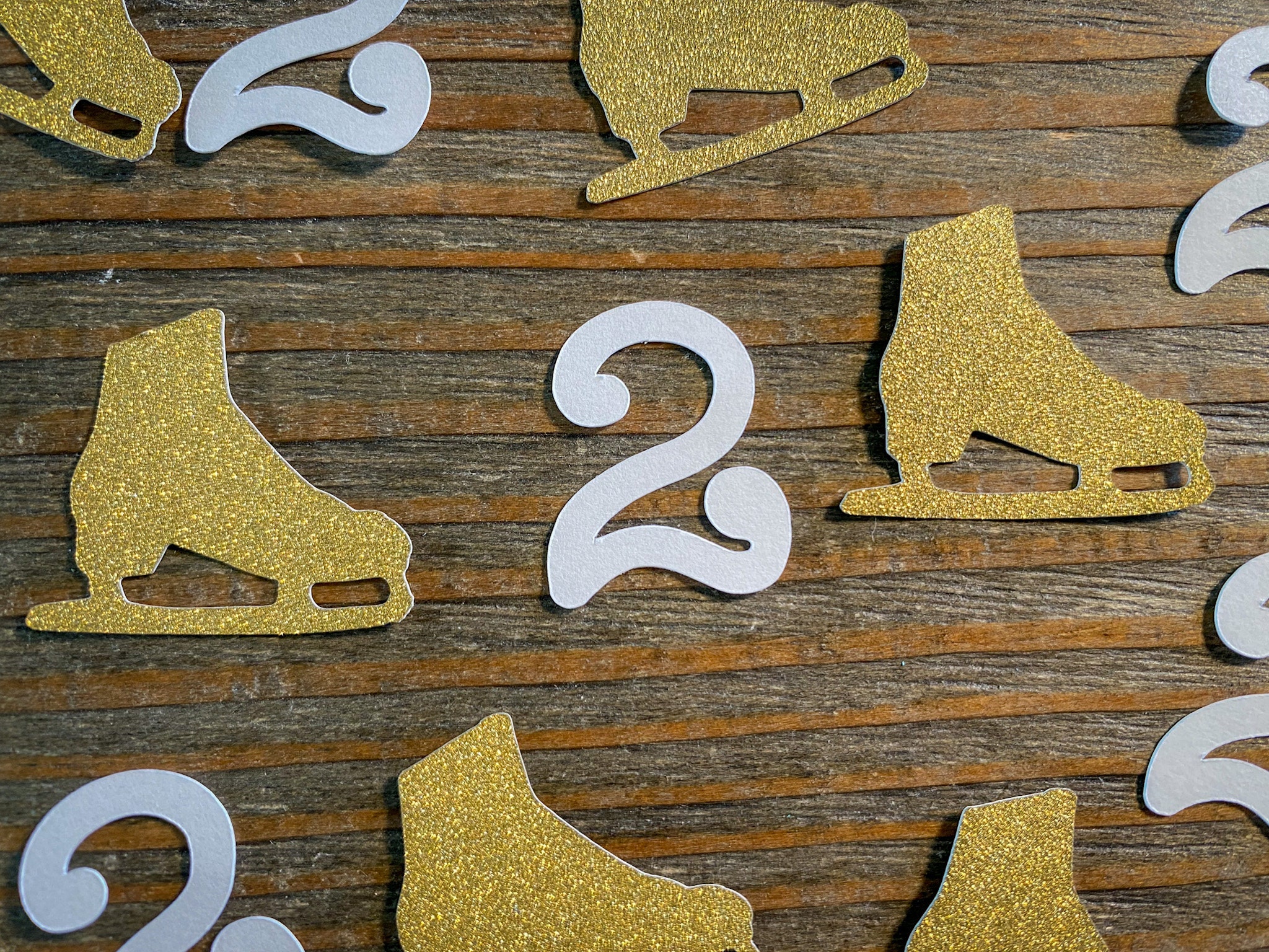 This listing is for 100 pieces of confetti! It includes 25 pieces of white age confetti and 75 gold ice skates. The gold confetti is white on the reverse side. The age pieces are 1 inch in height and the ice skates measure approximately 1.25 inches.