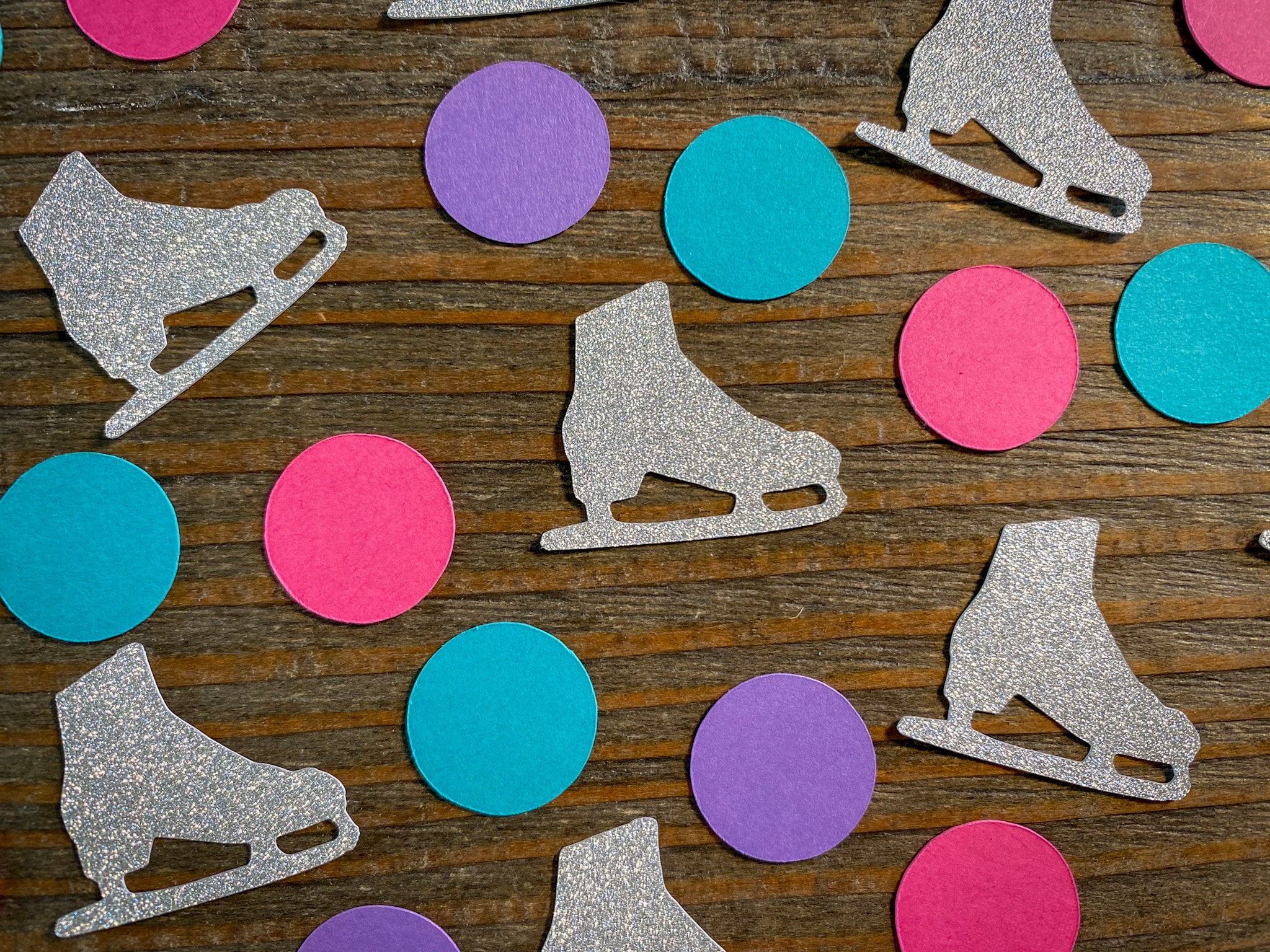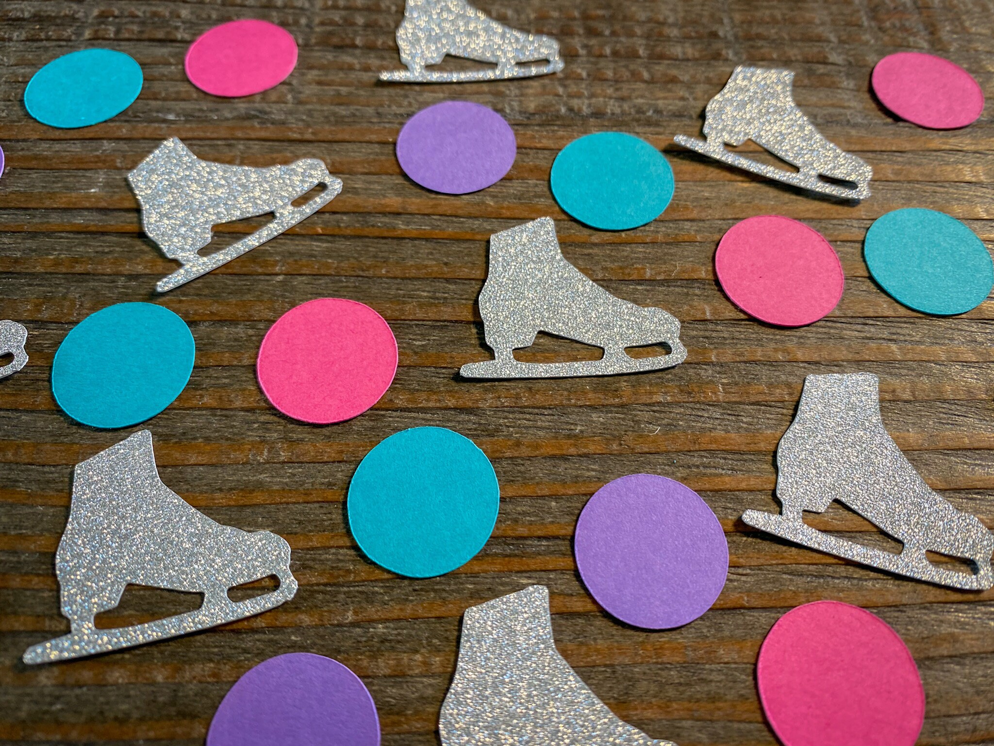 This listing is for 100 pieces of confetti! It includes 25 pieces of silver ice skates confetti, 25 bright pink circles, 25 teal circles, and 25 purple circles. The glitter confetti is white on the reverse side. The ice skates measure approximately 1.25 inches and the circles measure approximately .75 inches in diameter.