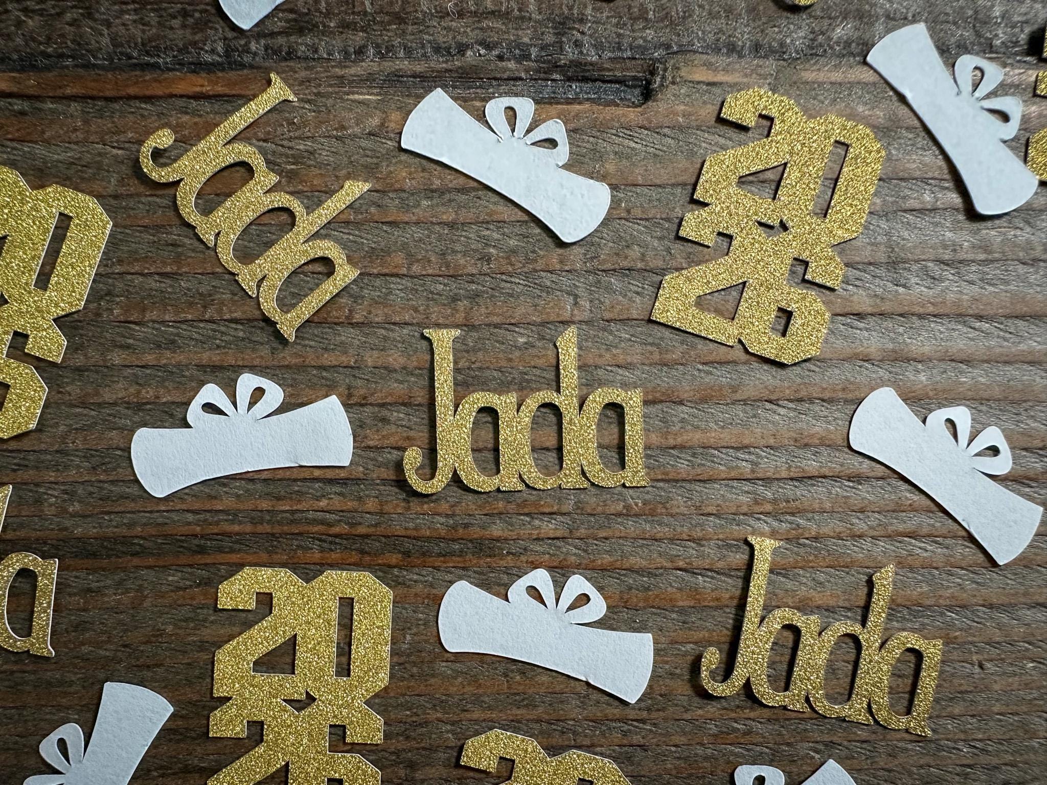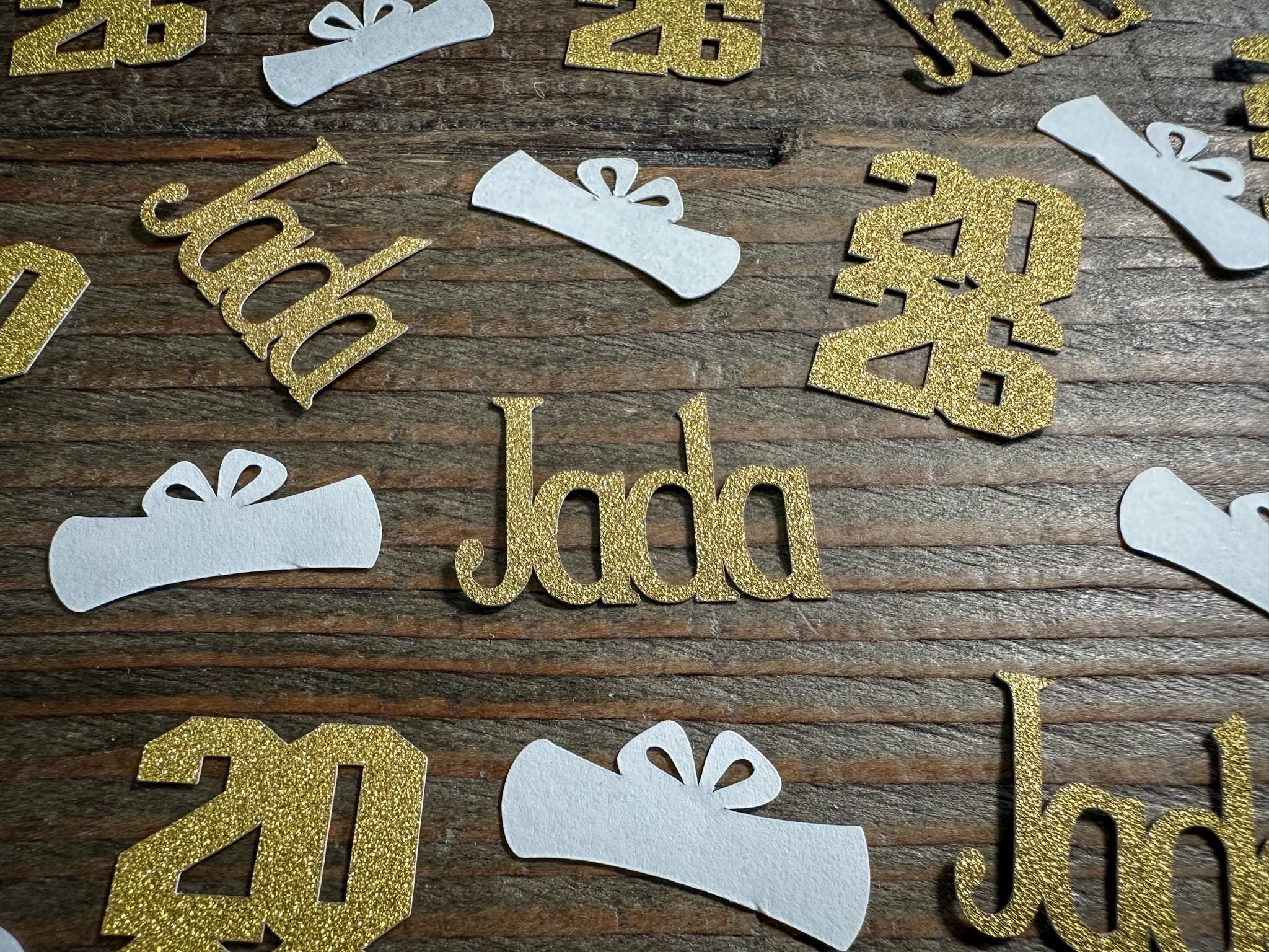 This listing is for 100 pieces of confetti. It includes 20 pieces of gold name confetti made with gold glitter cardstock (white on the reverse), 20 pieces of gold glitter 2026 (white on the reverse), and 60 pieces of white diplomas . The name pieces measure approximately 1 inch in height and the length varies based on the name, the caps measure 1.25 inches, and the years measure approximately 1.5 inches in height by 1 inch.