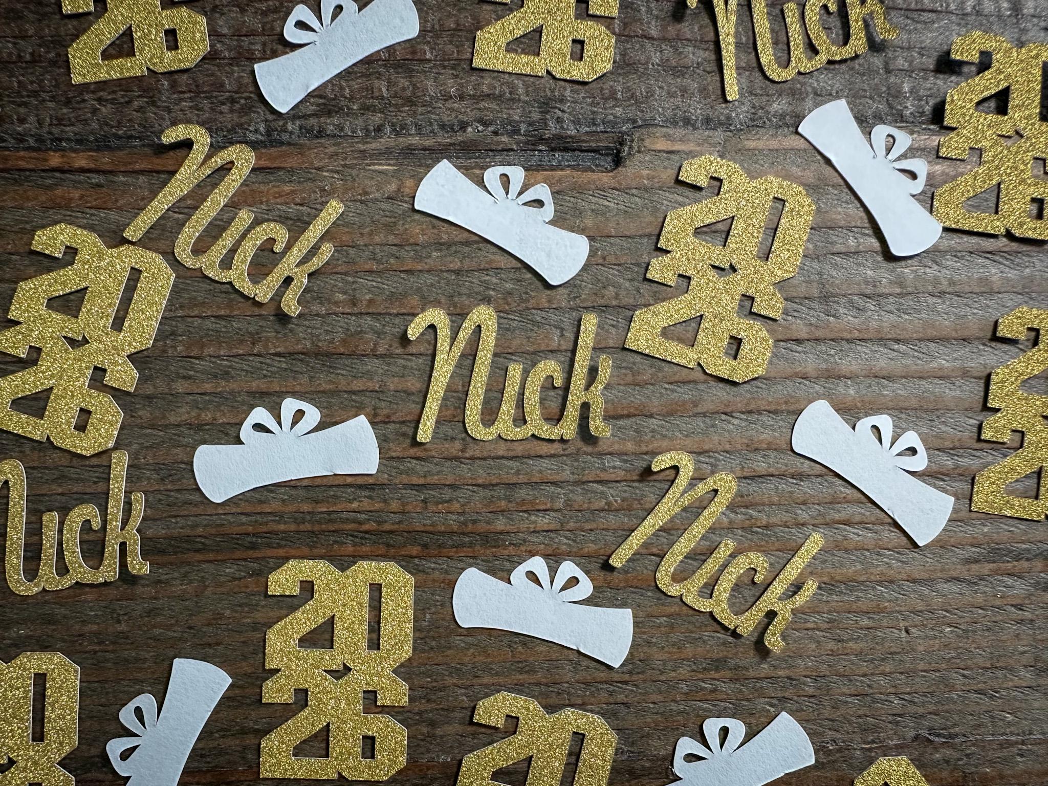 This listing is for 100 pieces of confetti. It includes 20 pieces of gold name confetti made with gold glitter cardstock (white on the reverse), 20 pieces of gold glitter 2026 (white on the reverse), and 60 pieces of black graduation caps. The name pieces measure approximately 1 inch in height and the length varies based on the name, the caps measure 1.25 inches, and the years measure approximately 1.5 inches in height by 1 inch.