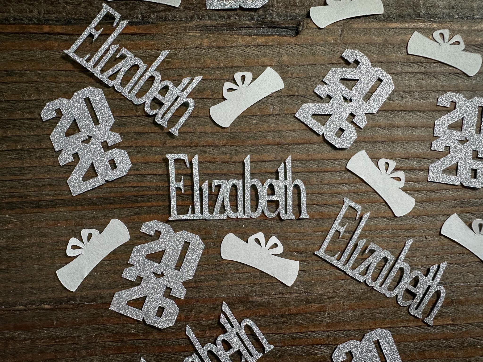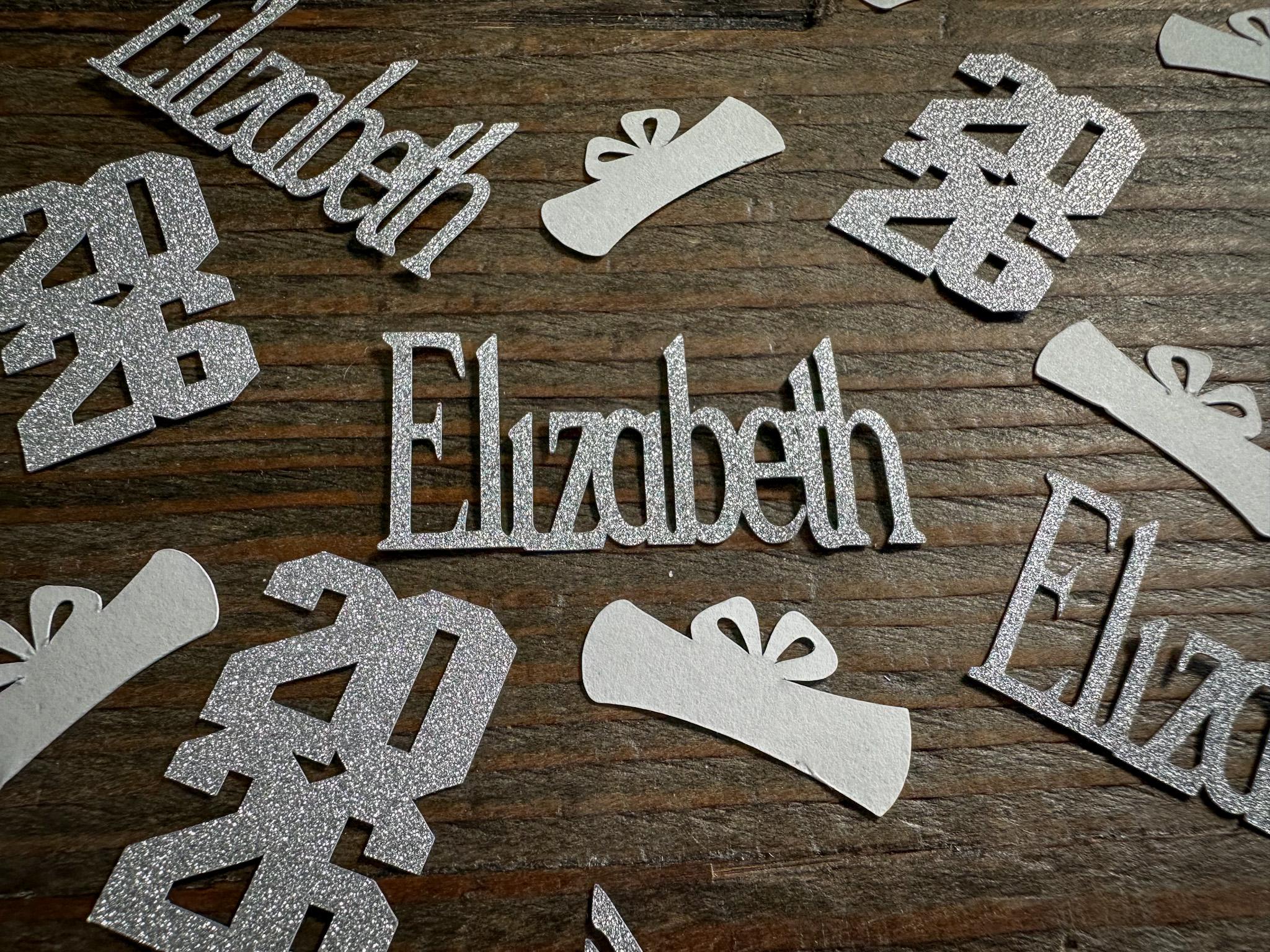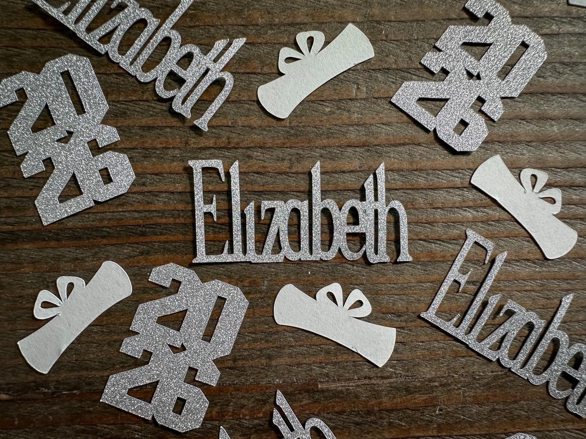 This listing is for 100 pieces of confetti. It includes 20 pieces of silver name confetti made with silver glitter cardstock (white on the reverse), 20 pieces of silver glitter 2026(white on the reverse), and 60 pieces of black graduation caps. The name pieces measure approximately 1 inch in height and the length varies based on the name, the caps measure 1.25 inches, and the years measure approximately 1.5 inches in height by 1 inch.
